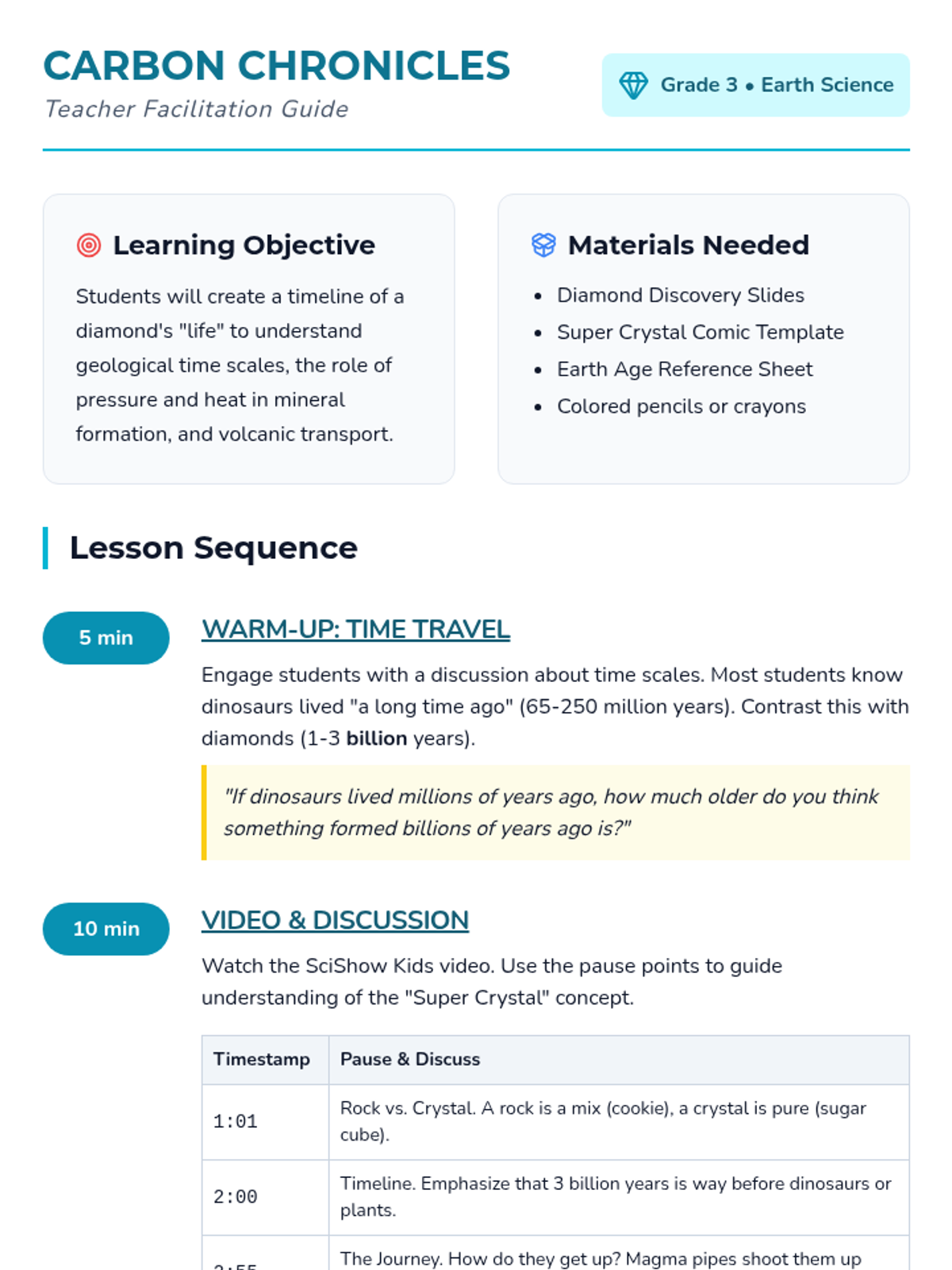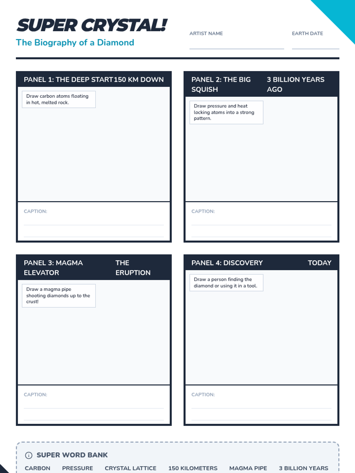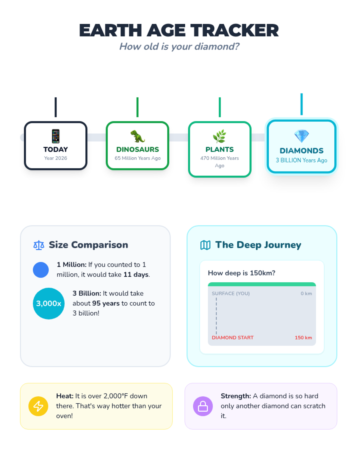 Students will explore geological time and earth processes by tracking the 3-billion-year journey of a diamond, from deep carbon atoms to surface discovery.
