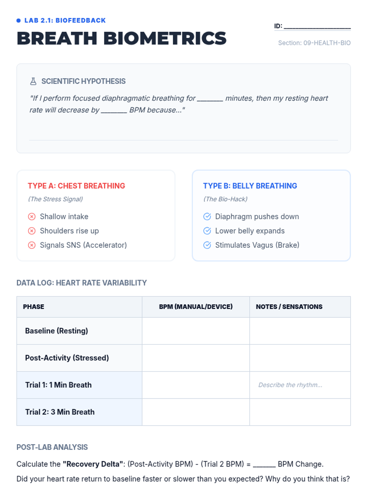 Students learn the mechanics of diaphragmatic breathing and use heart rate data to measure the immediate physiological impact of the relaxation response.