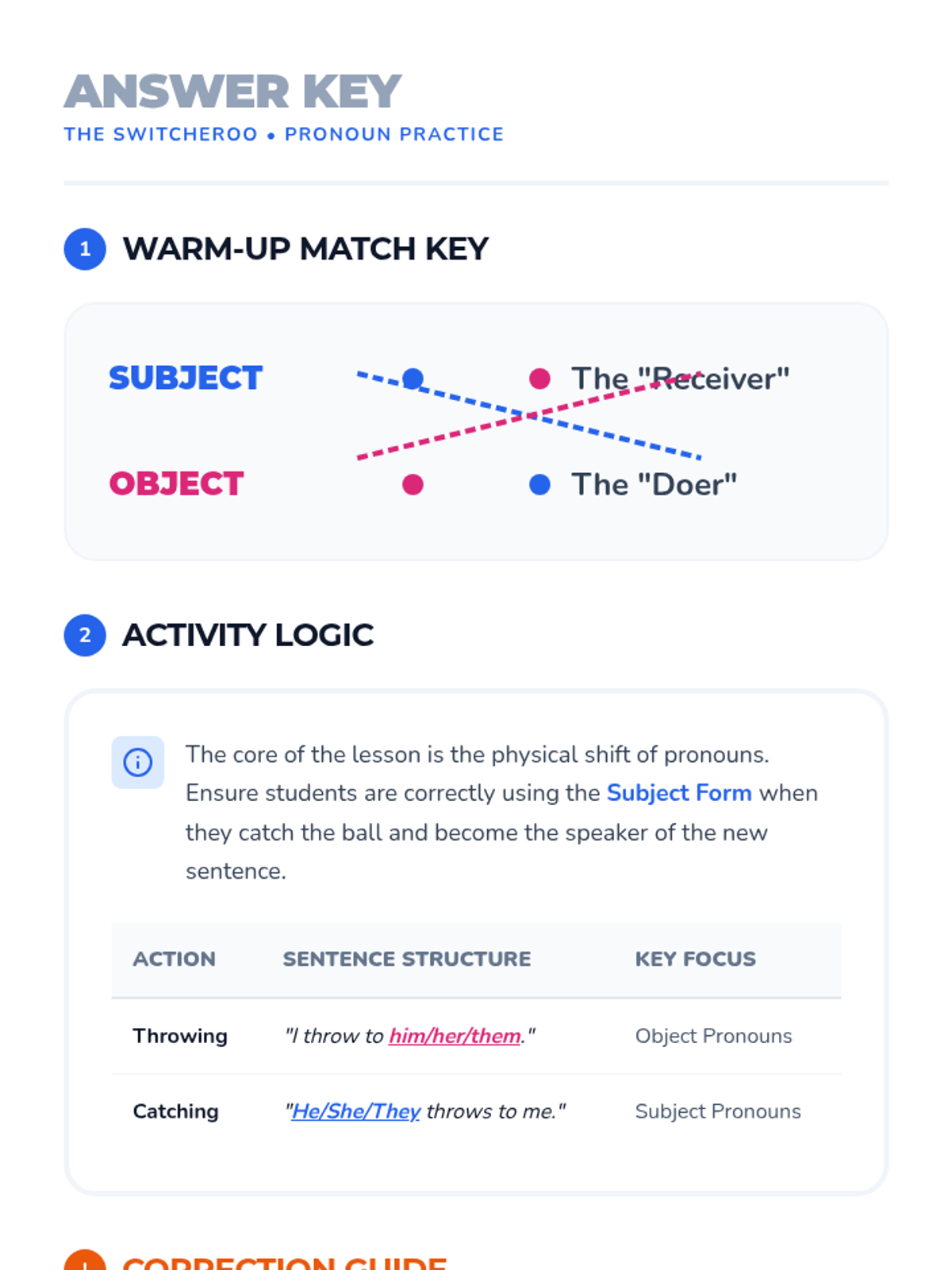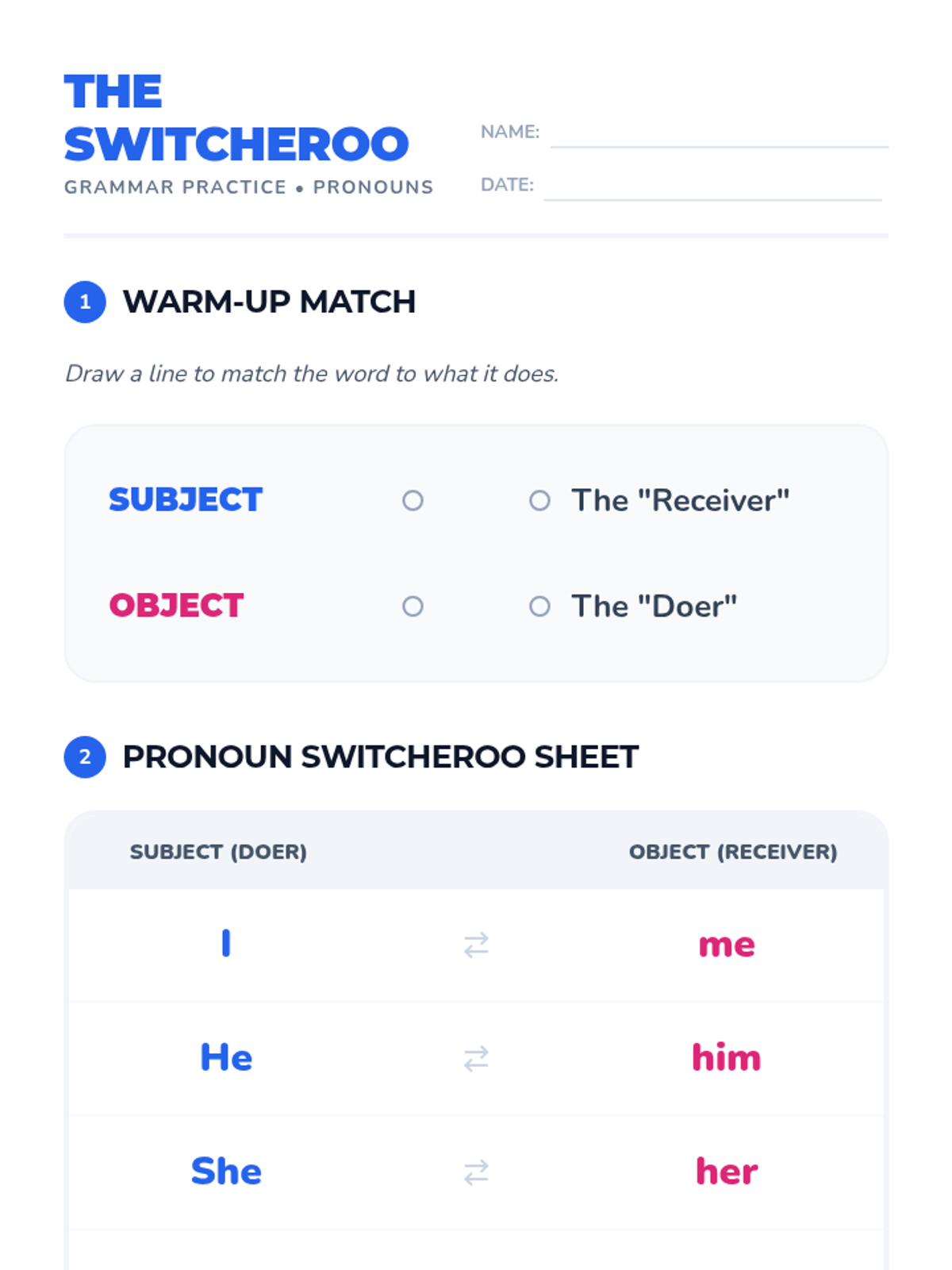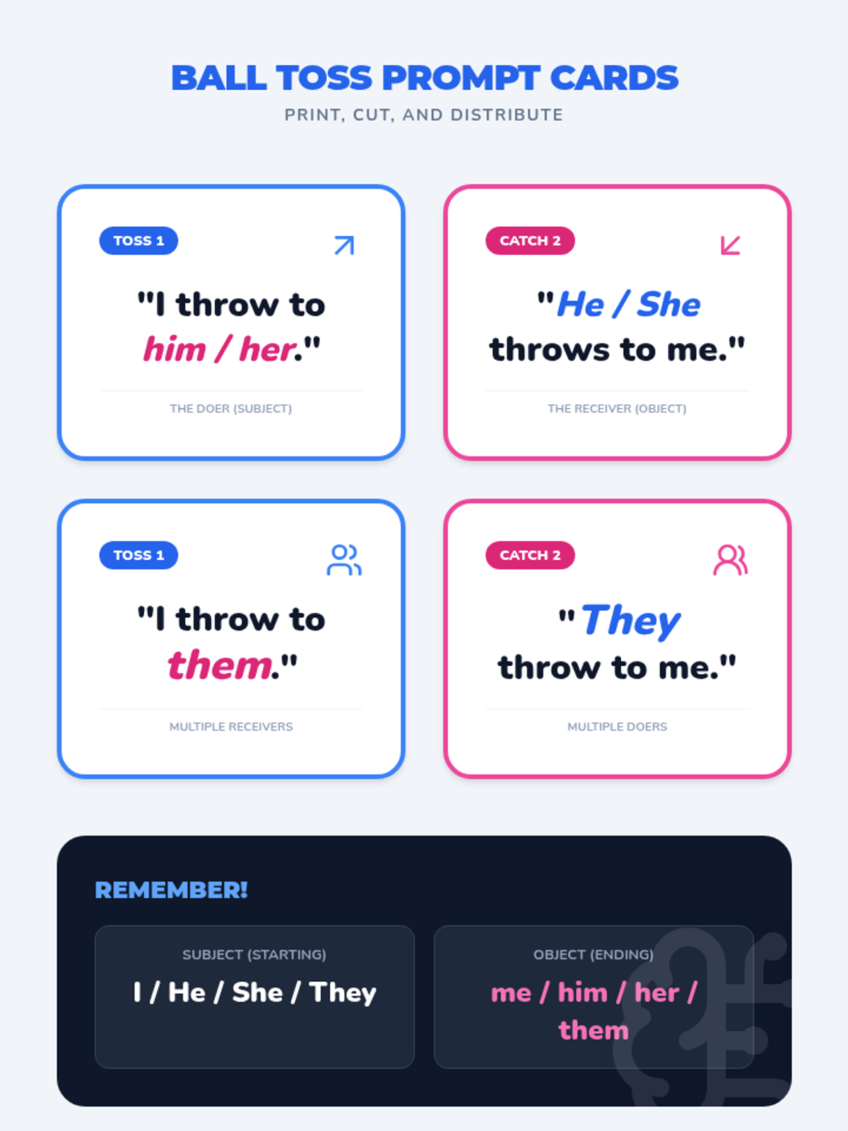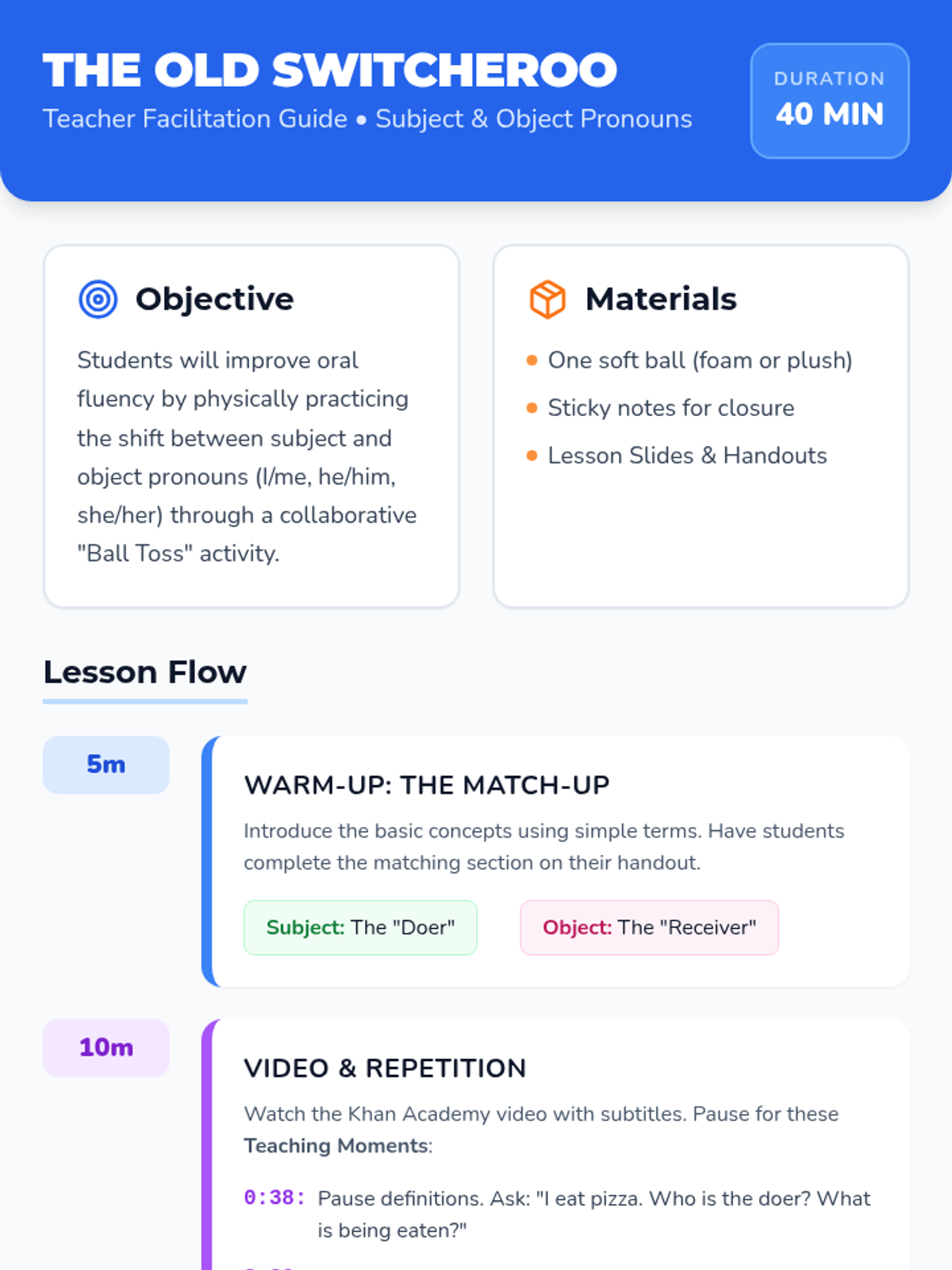 A dynamic lesson for ESL/ELL students to master subject and object pronouns through physical movement and visual examples from Khan Academy. Students practice the 'switcheroo' by tossing a ball and transforming sentences in real-time.