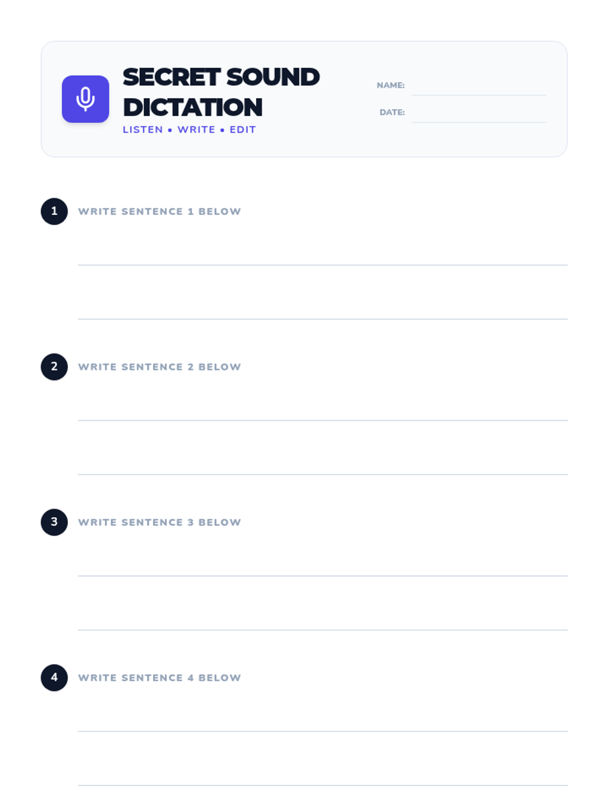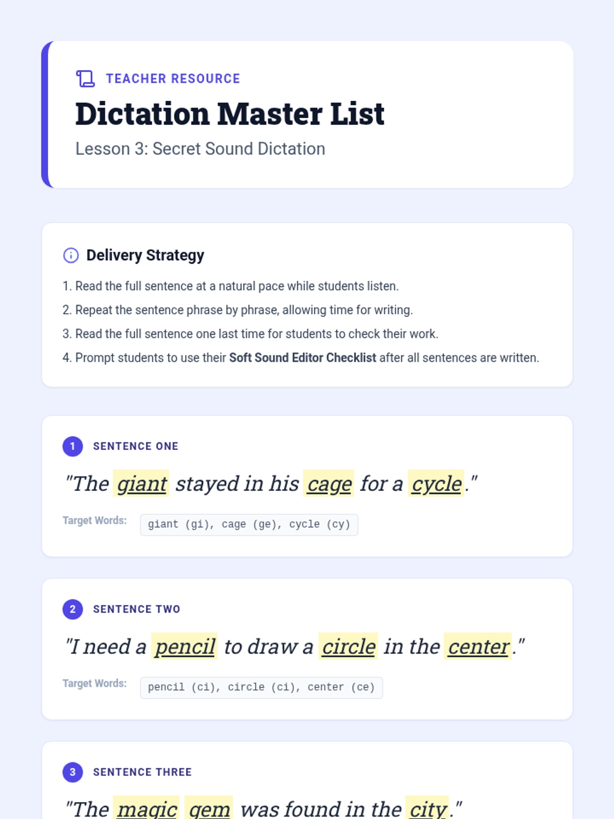 The teacher dictates sentences containing soft 'c' and 'g' words. Students write the sentences and use a checklist to self-edit their work, focusing on correct phonics patterns.