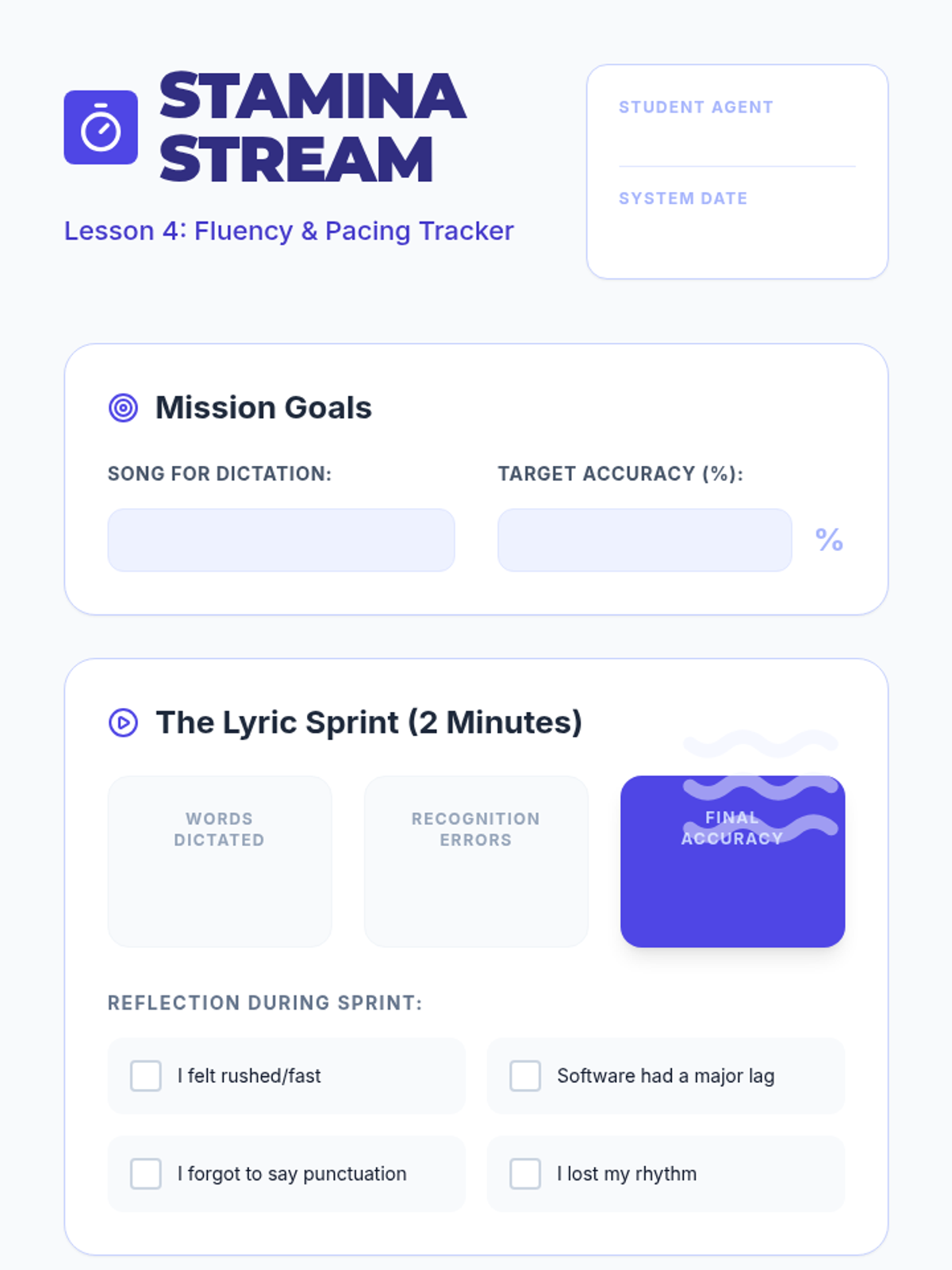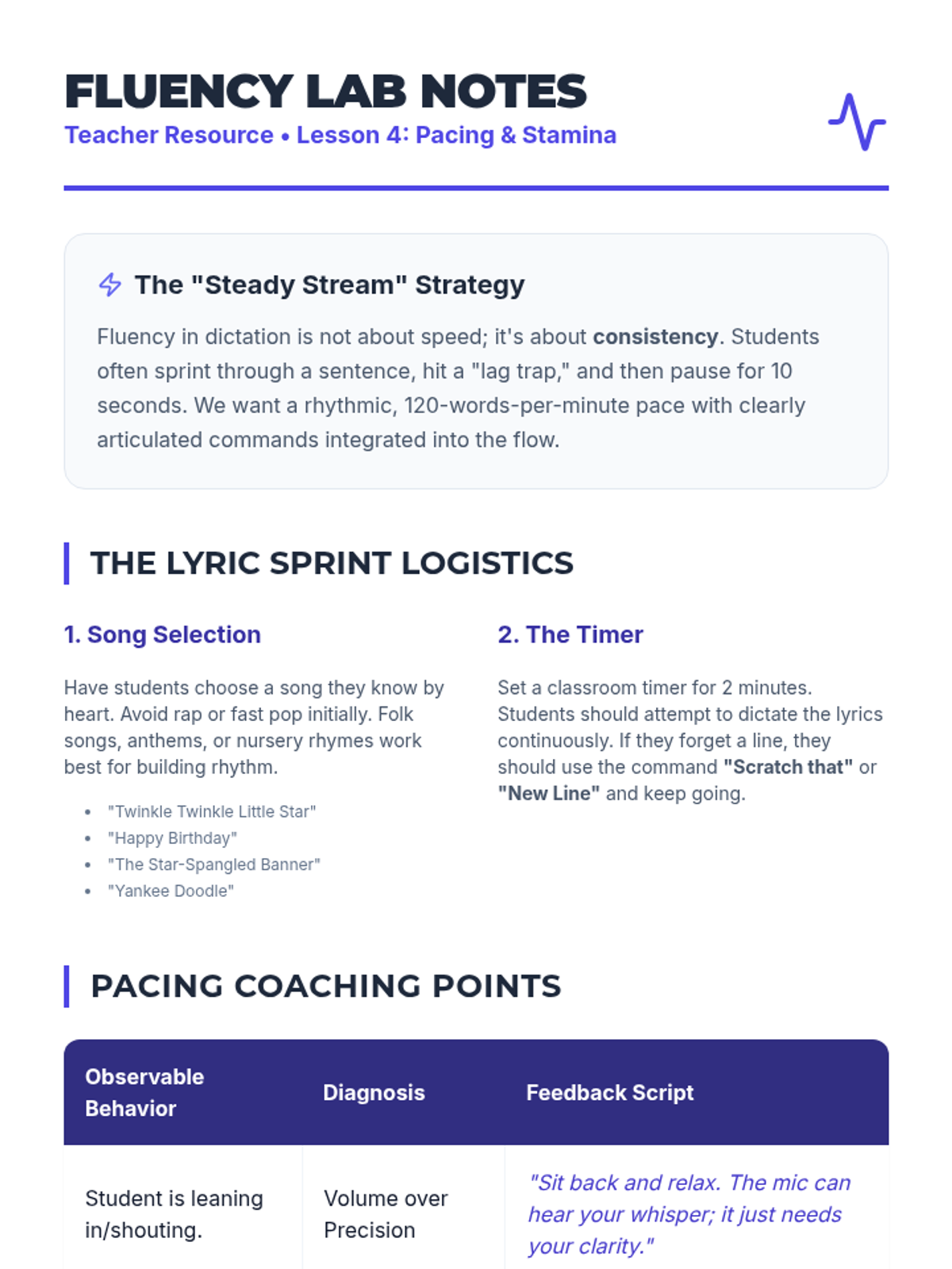 Students engage in longer bouts of dictation to build physical and cognitive stamina. They practice maintaining a consistent speaking rate to prevent software lag and reduce recognition errors.