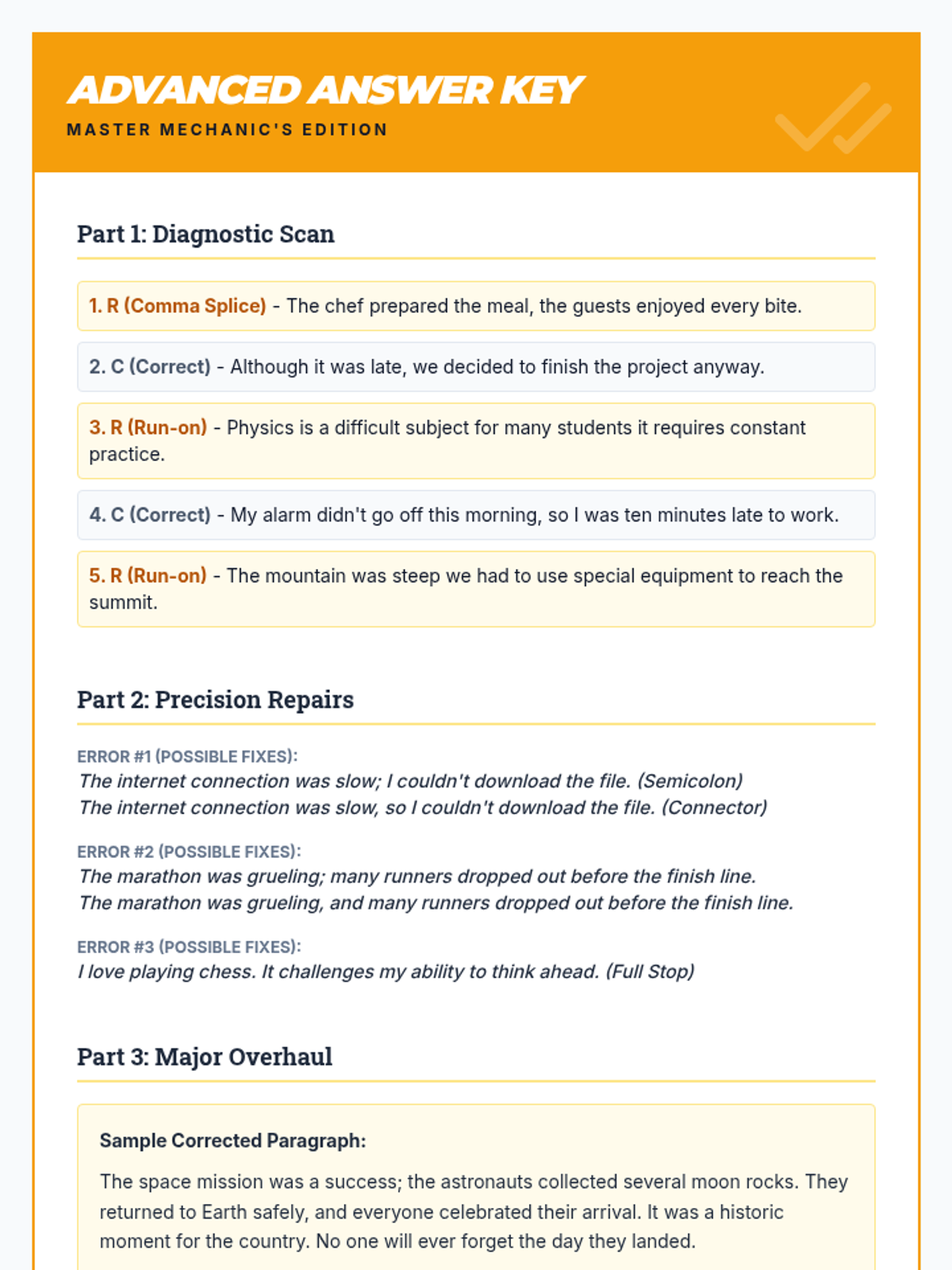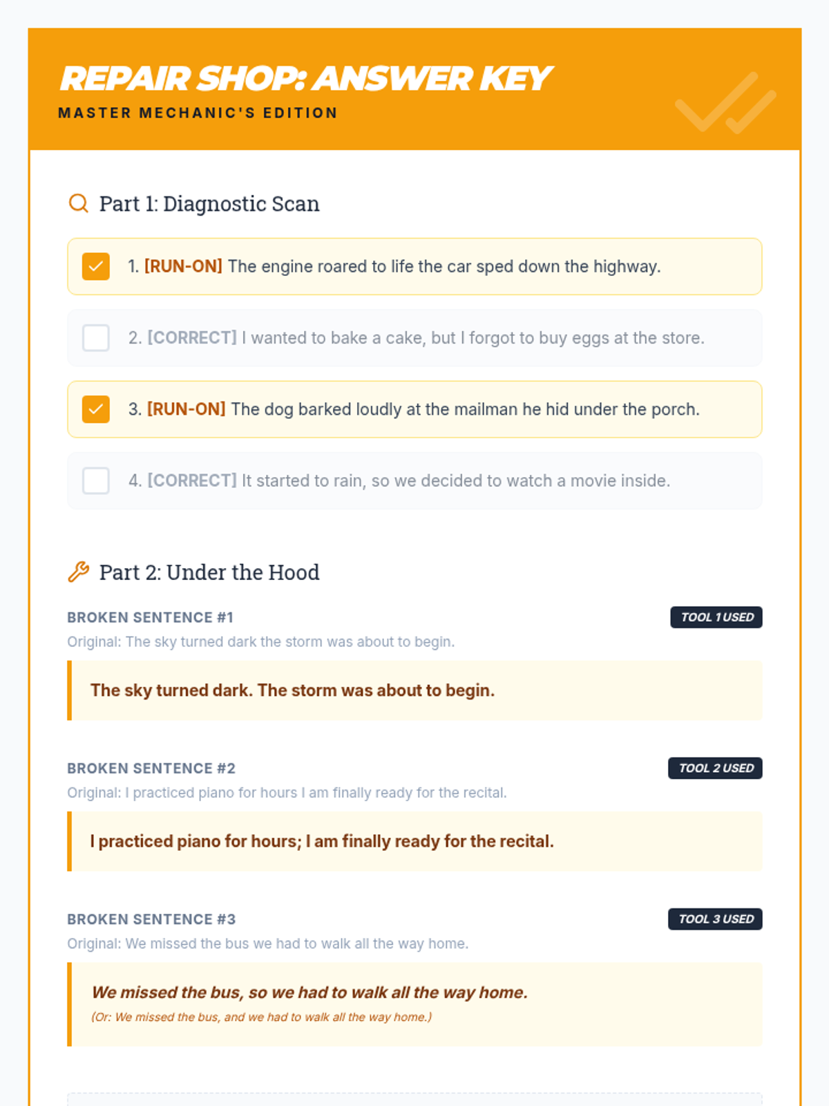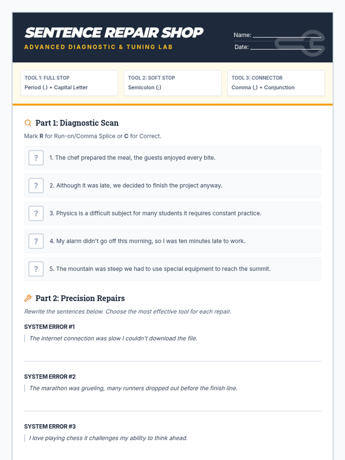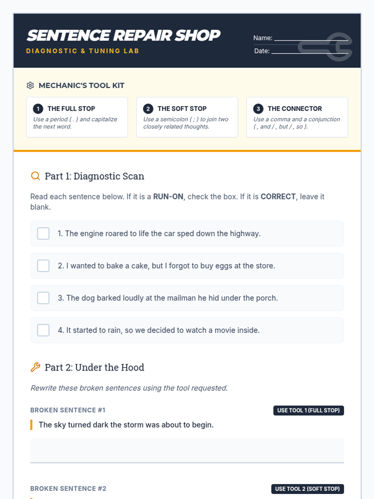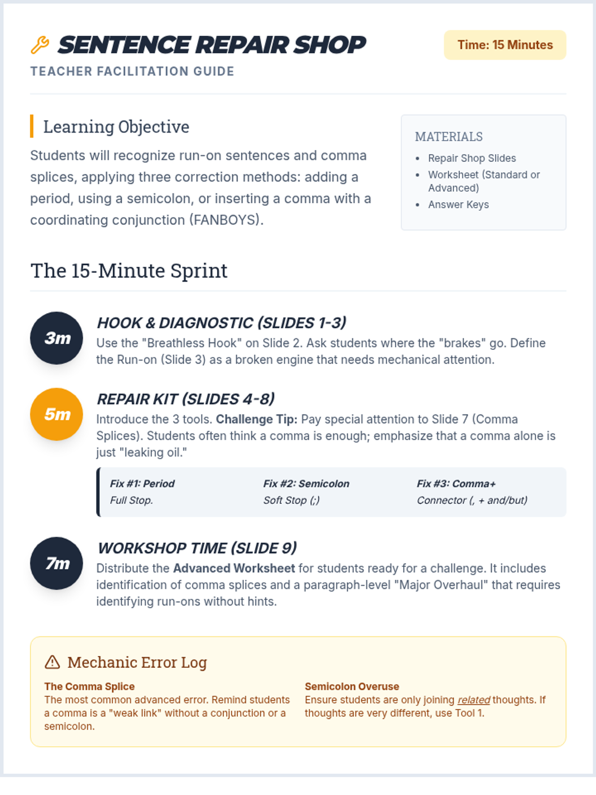 A quick-hit 15-minute lesson focused on identifying and repairing run-on sentences using three primary correction methods. Students act as 'sentence mechanics' to tune up clunky writing.
