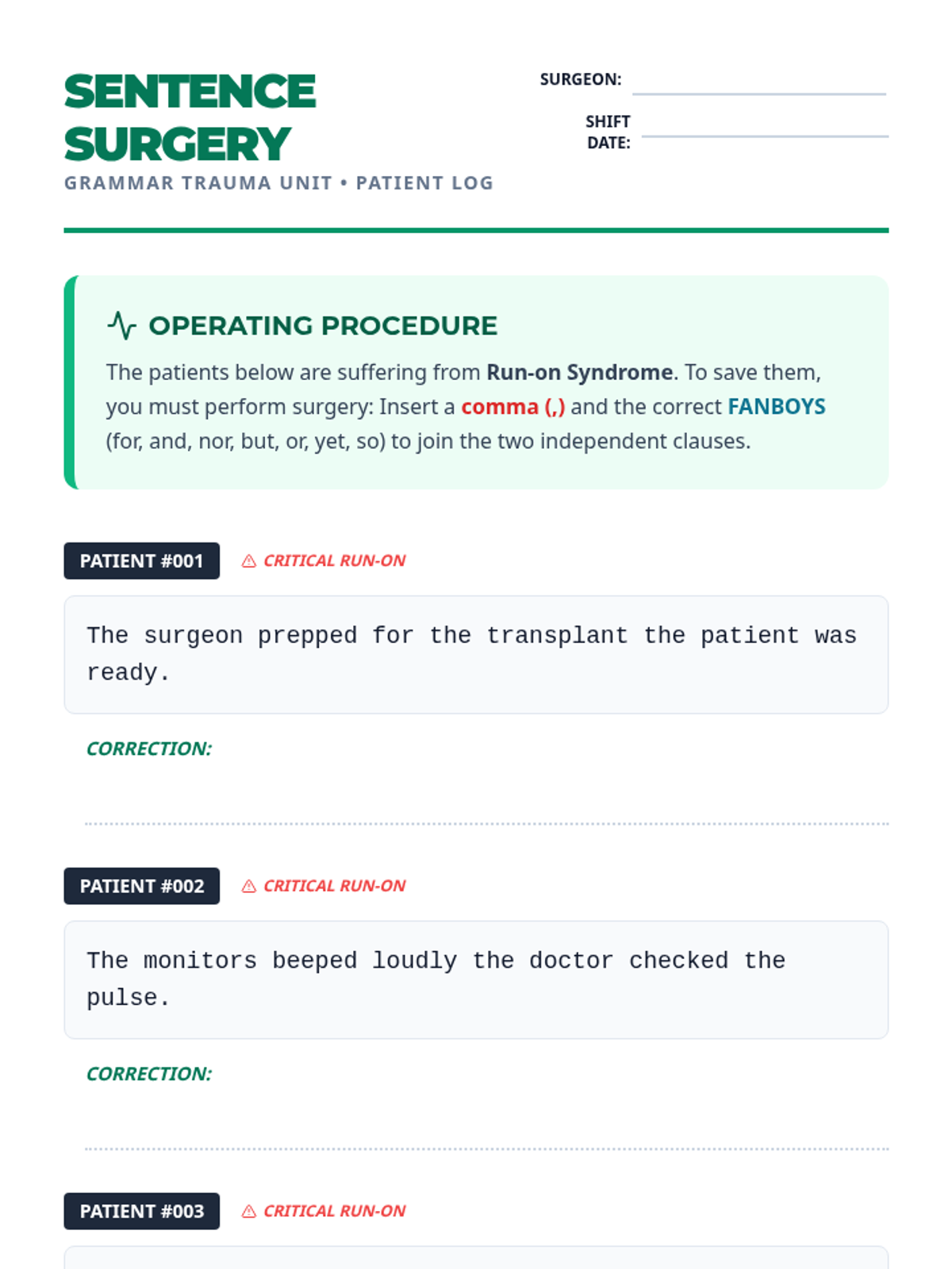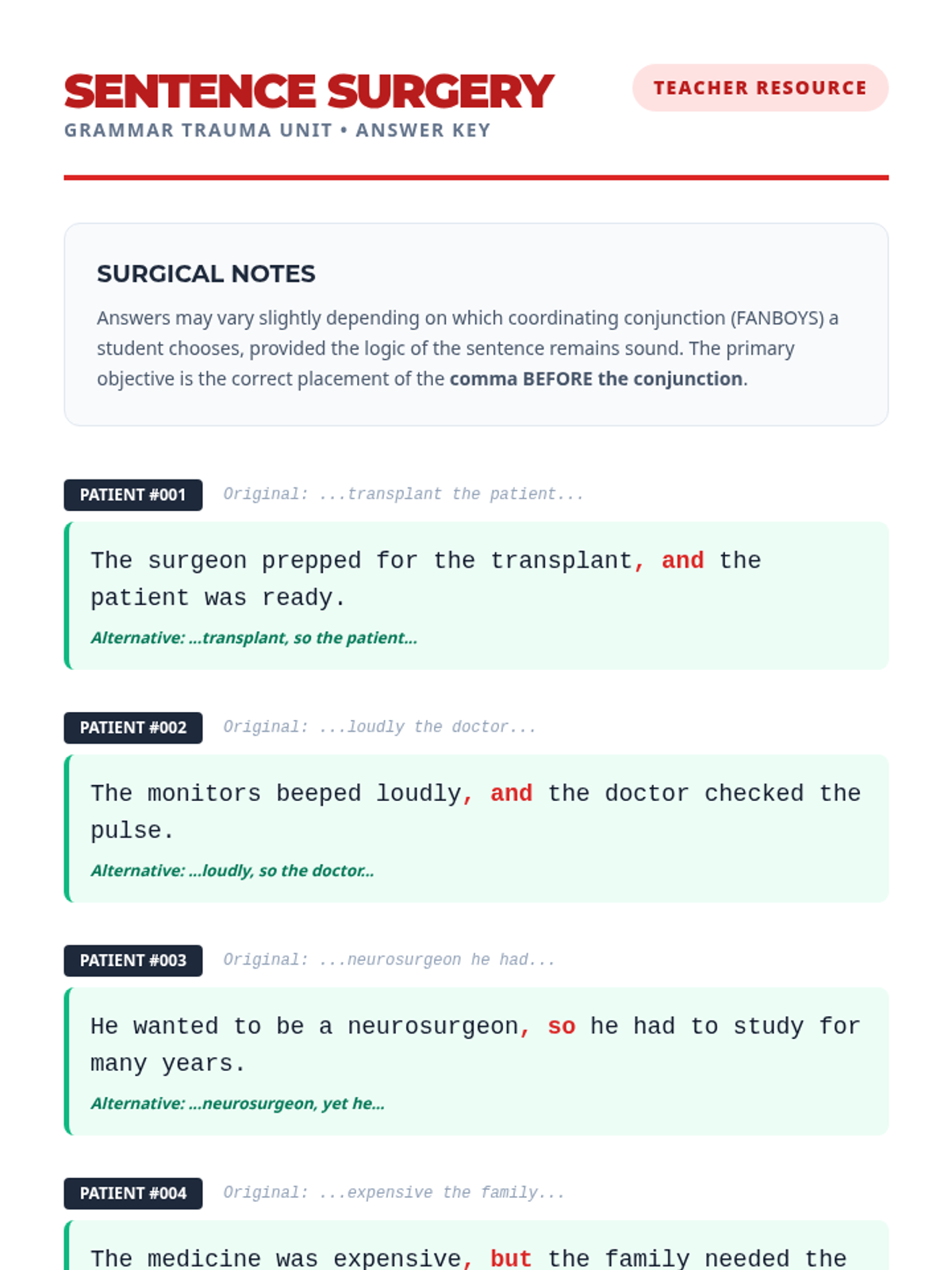 A quick, high-impact grammar warm-up focused on using commas and coordinating conjunctions (FANBOYS) to join independent clauses correctly. Students act as 'Sentence Surgeons' to repair broken compound sentences.