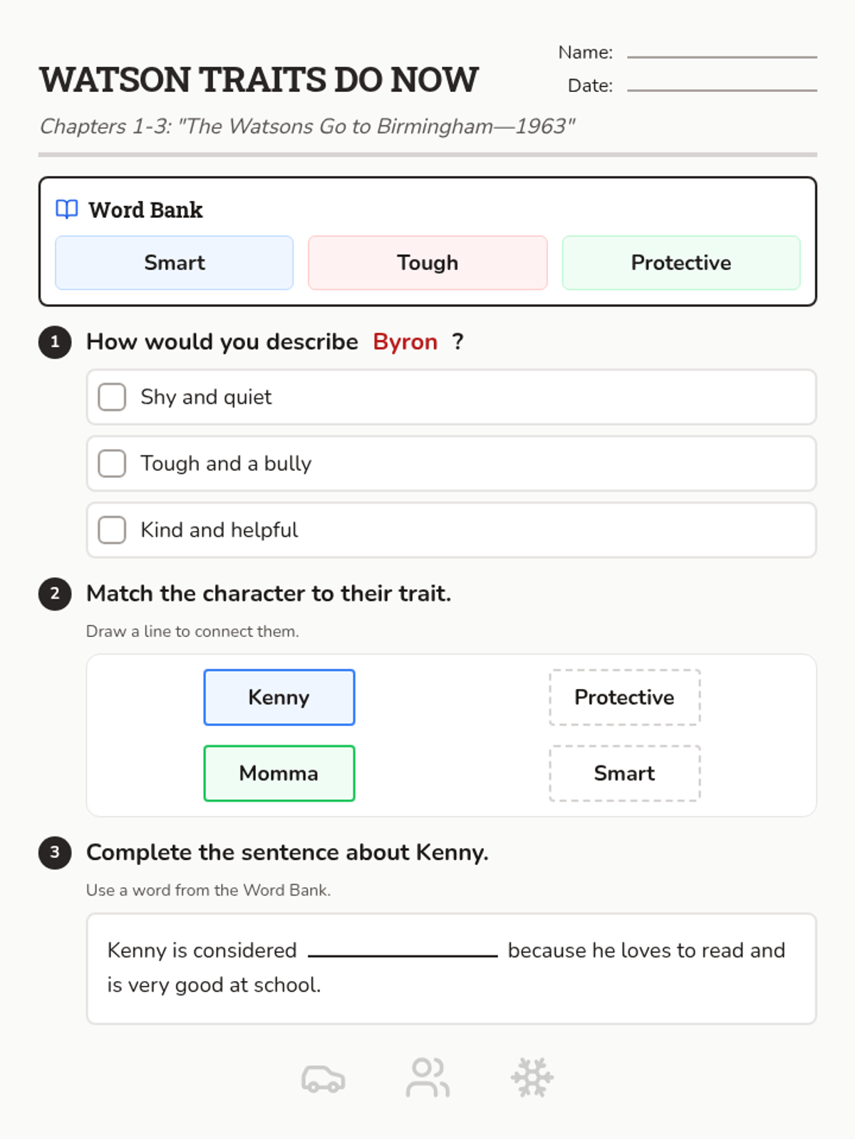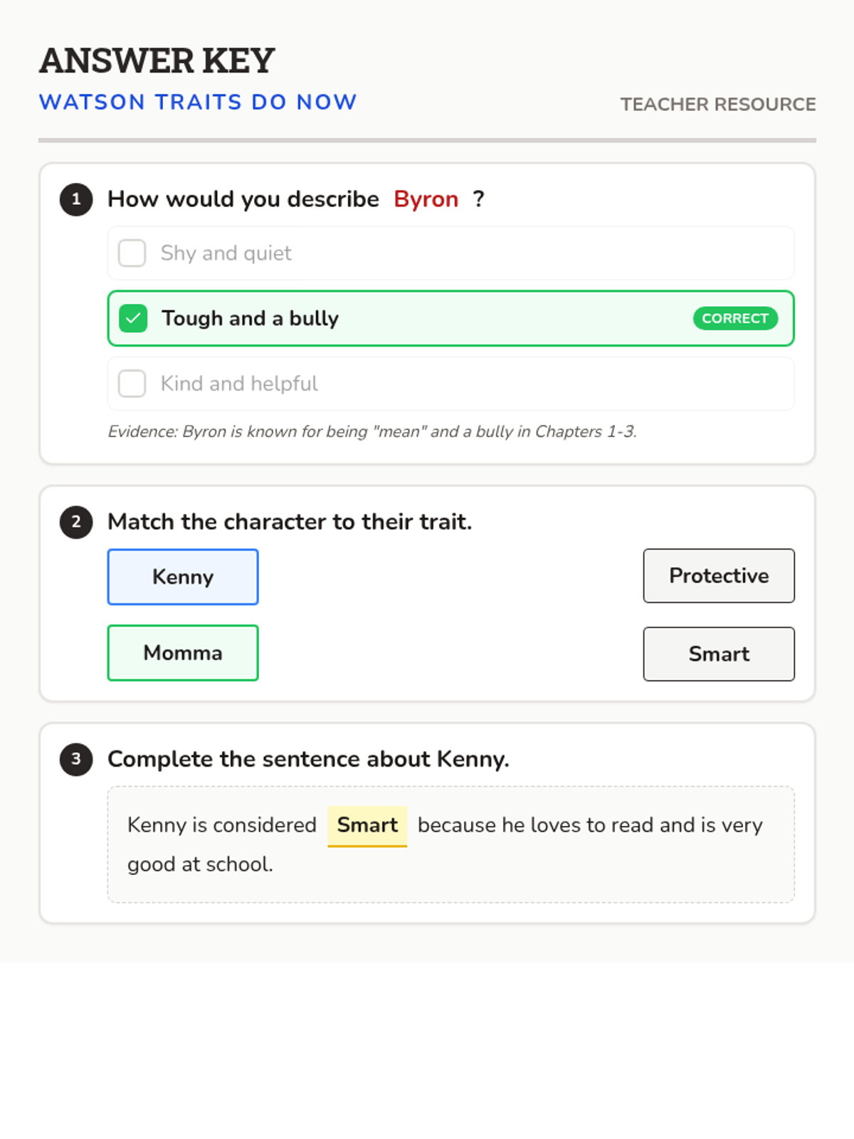 This lesson focuses on identifying and analyzing the character traits of the Watson family members in the early chapters of 'The Watsons Go to Birmingham—1963'. Students will use evidence from the text to describe Kenny, Byron, and Momma.