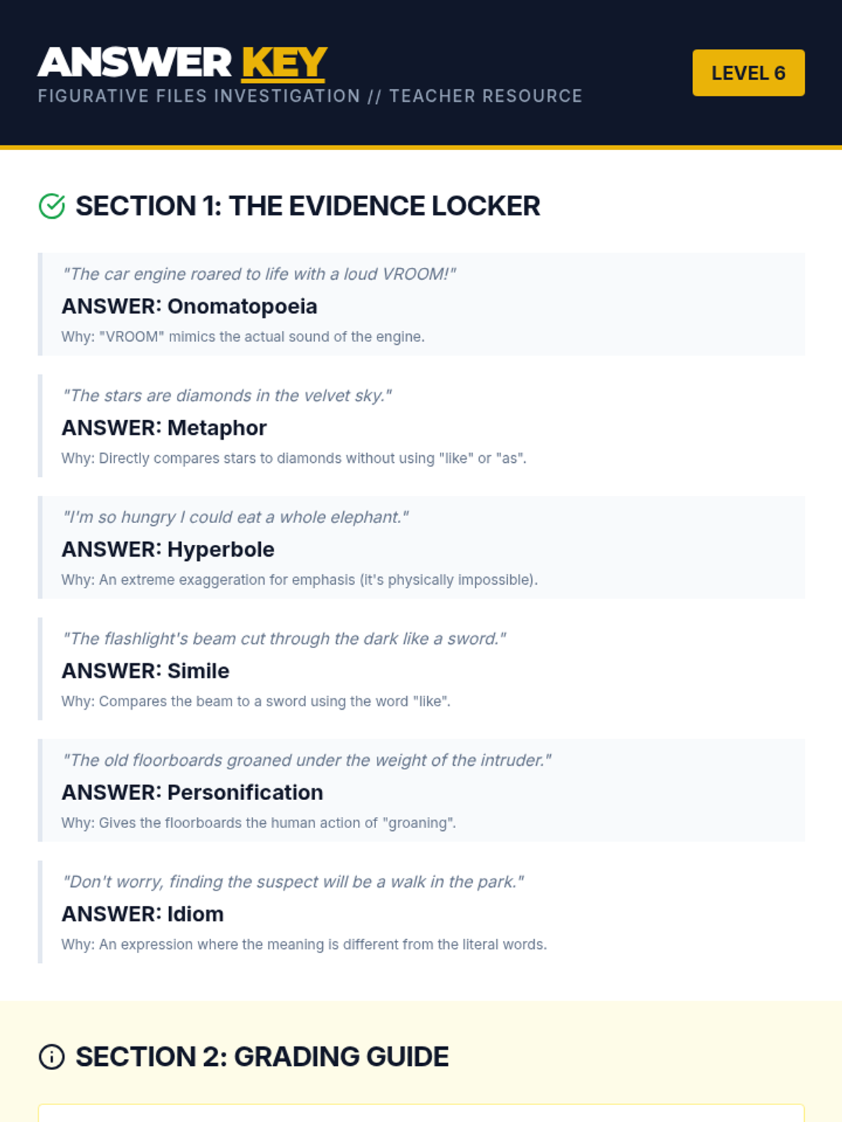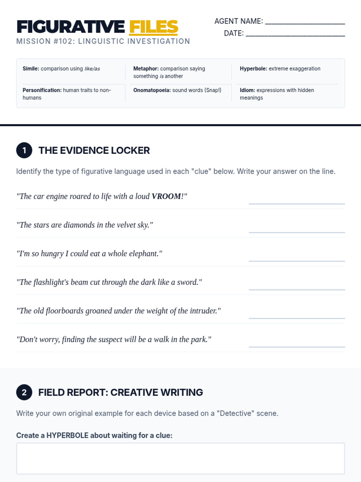 A 30-minute introductory lesson on figurative language where students become 'language detectives' to identify and create similes, metaphors, and more.
