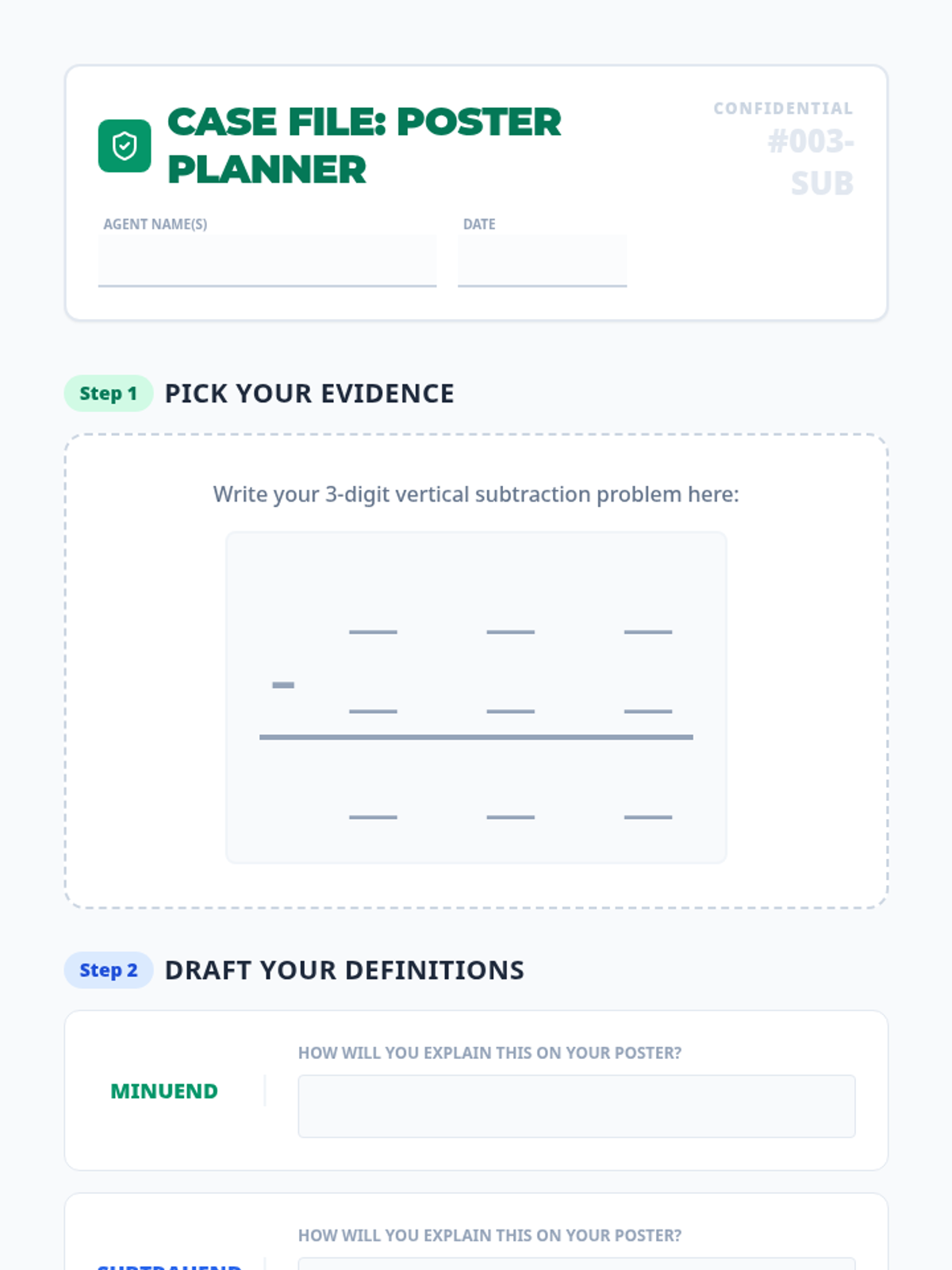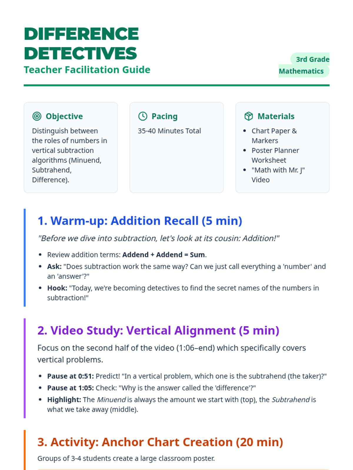 A 3rd-grade math lesson where students identify and label the parts of a vertical subtraction problem (minuend, subtrahend, and difference) through a video study and collaborative anchor chart project.