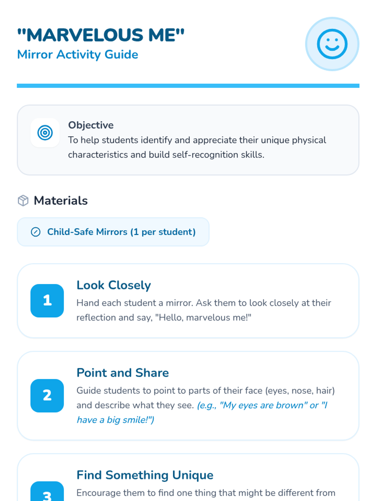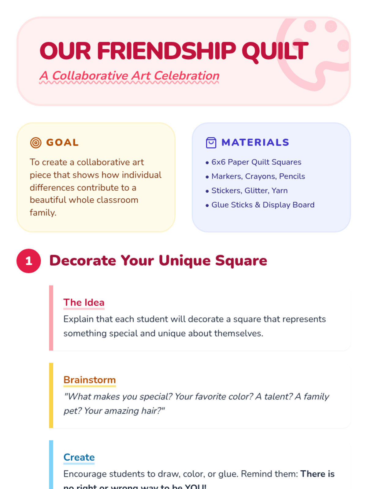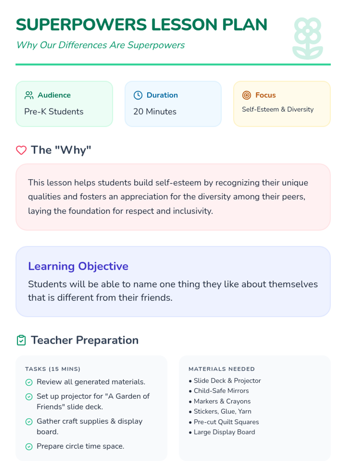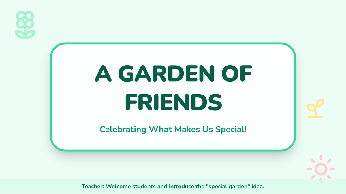 A Pre-K lesson that celebrates individuality and diversity through a garden-themed exploration of self-esteem and respect for others. Students use mirrors to identify unique traits and collaborate on a friendship quilt to visualize how their differences make them stronger together.