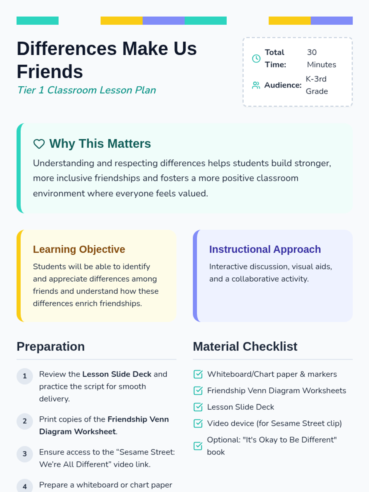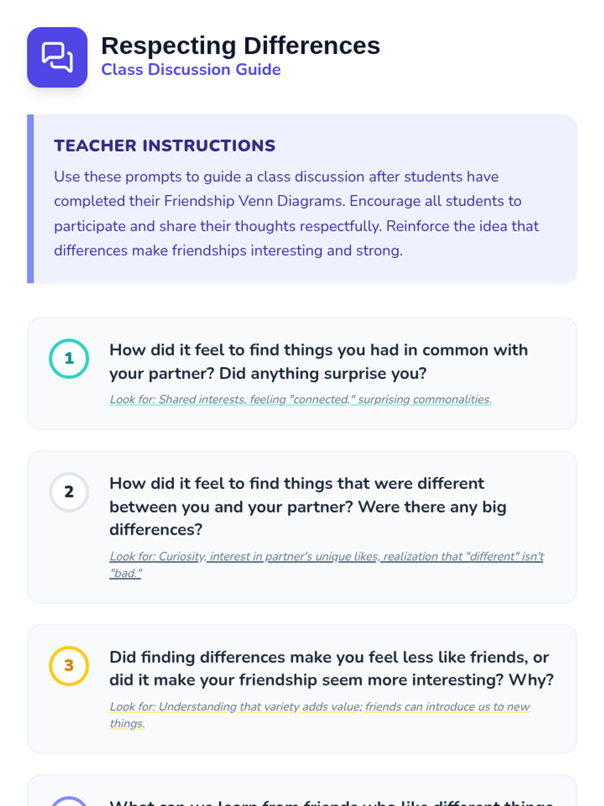 A K-3 lesson designed to help students understand and appreciate how differences enrich friendships through interactive discussions and a Venn diagram activity.