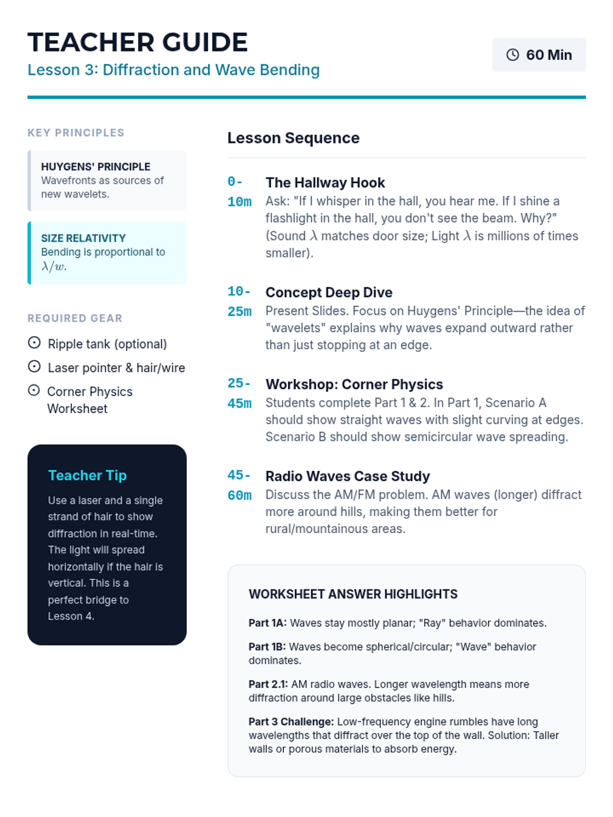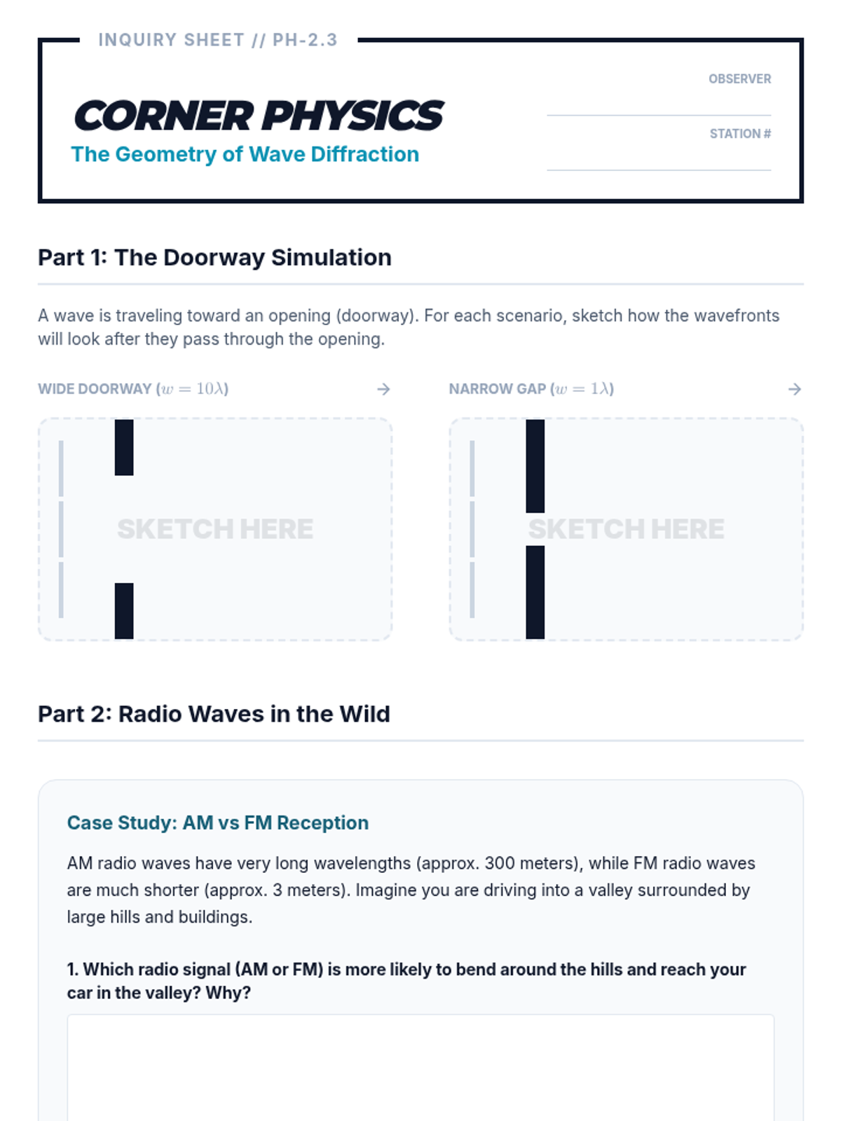 Students examine how waves bend around obstacles and through apertures, relating wavelength to aperture size to understand sound and light behavior.