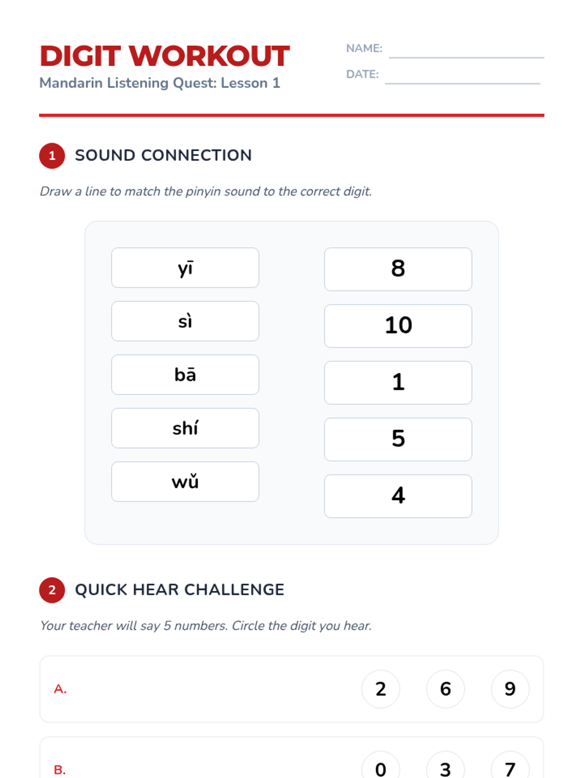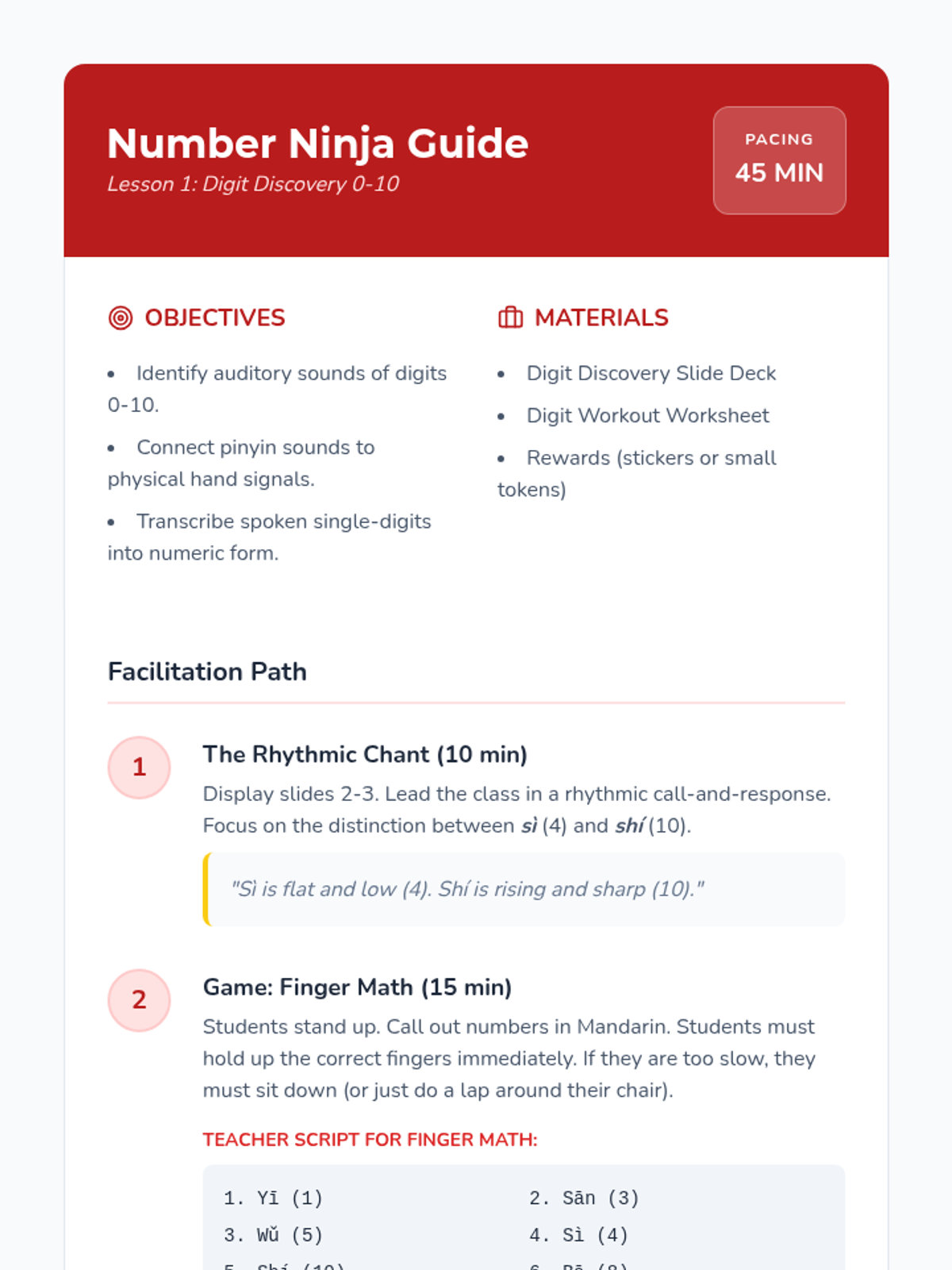 Students are introduced to the sounds of digits 0-10 through rhythmic chanting and hand signals. They play rapid-fire listening games to build immediate recall.