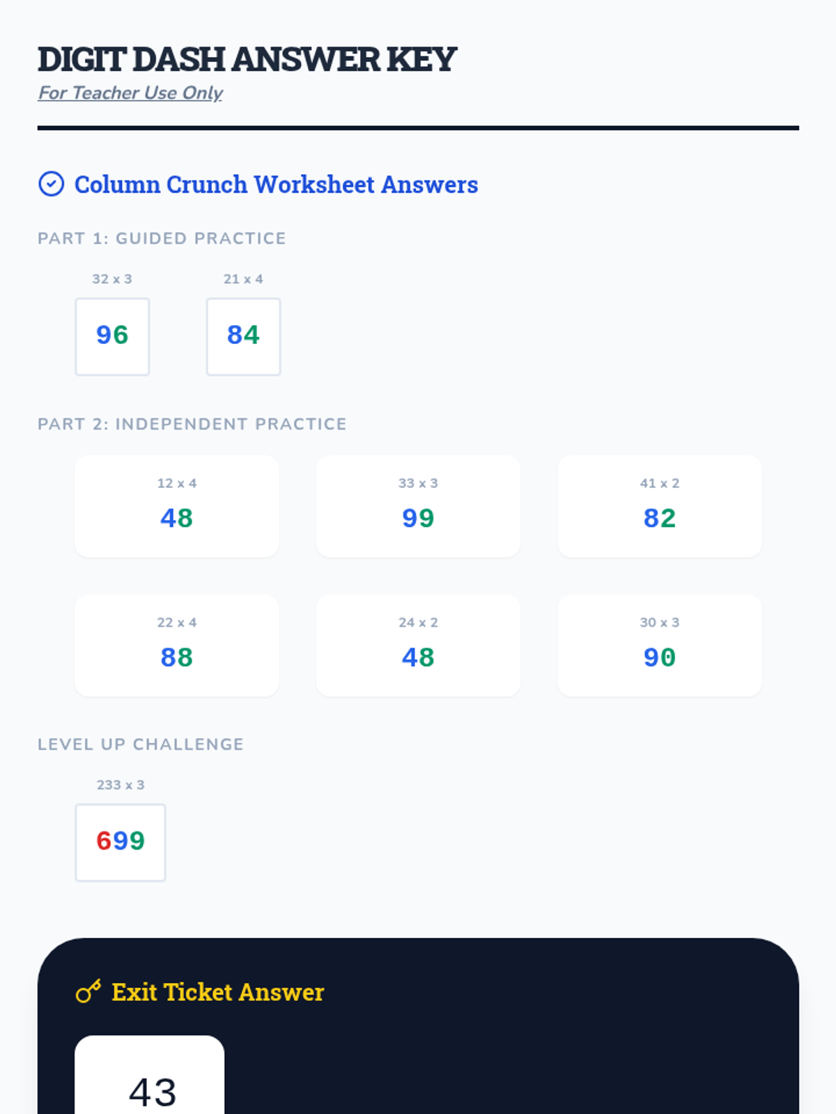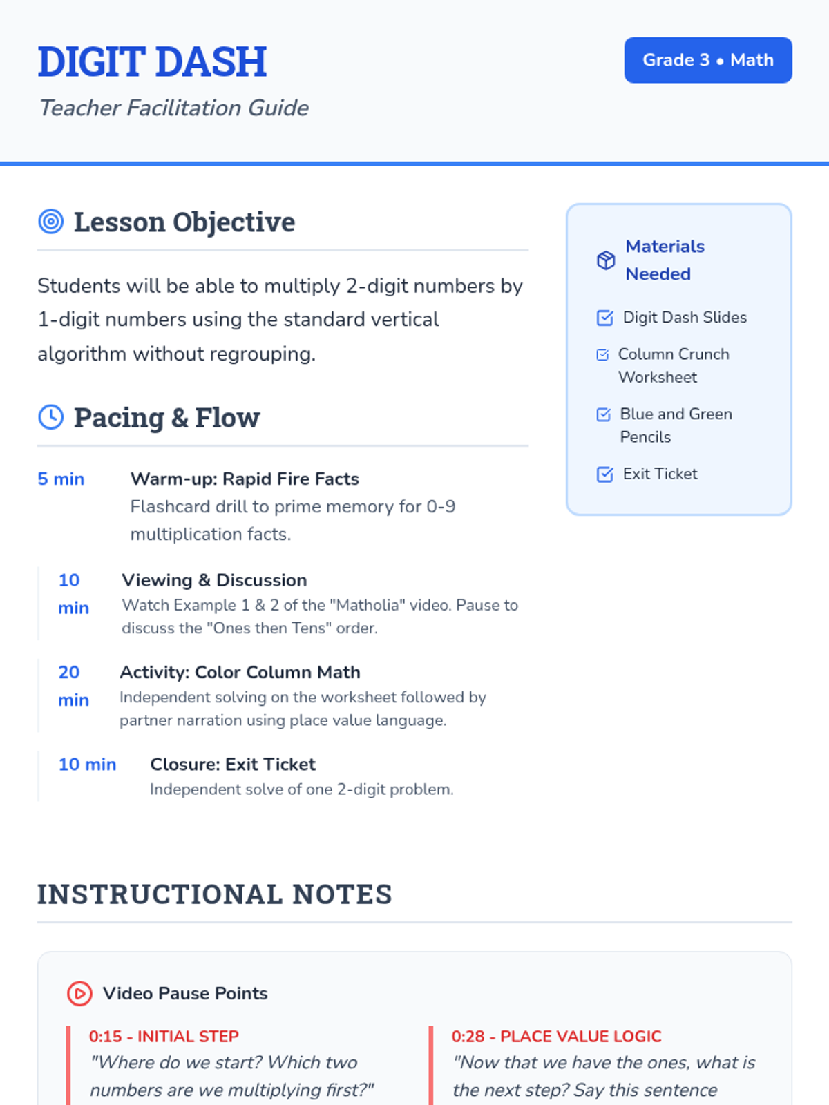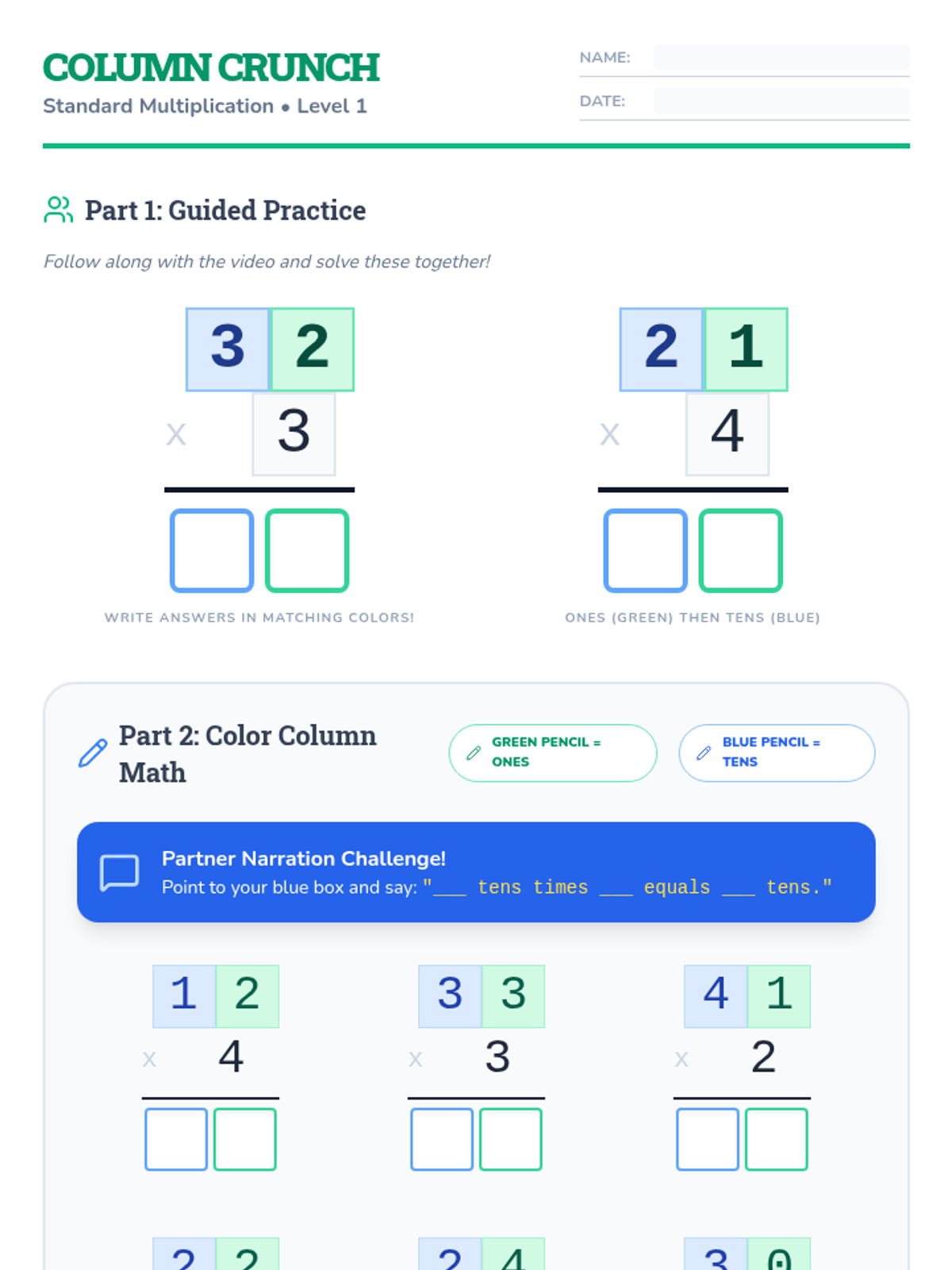 A foundational multiplication lesson for 3rd graders focusing on the standard vertical algorithm without regrouping, using color-coded columns and place-value narration.