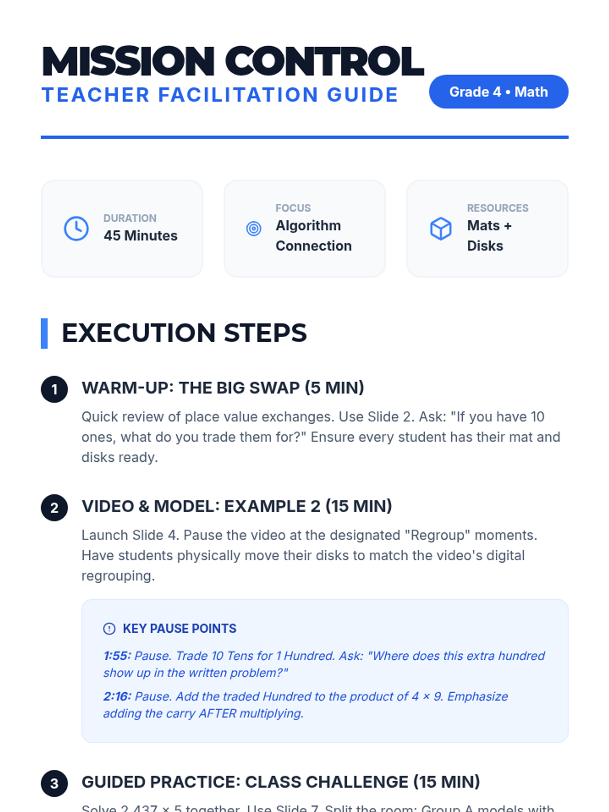 Students will learn to bridge the gap between physical place value disks and the standard multiplication algorithm through interactive modeling and video analysis.