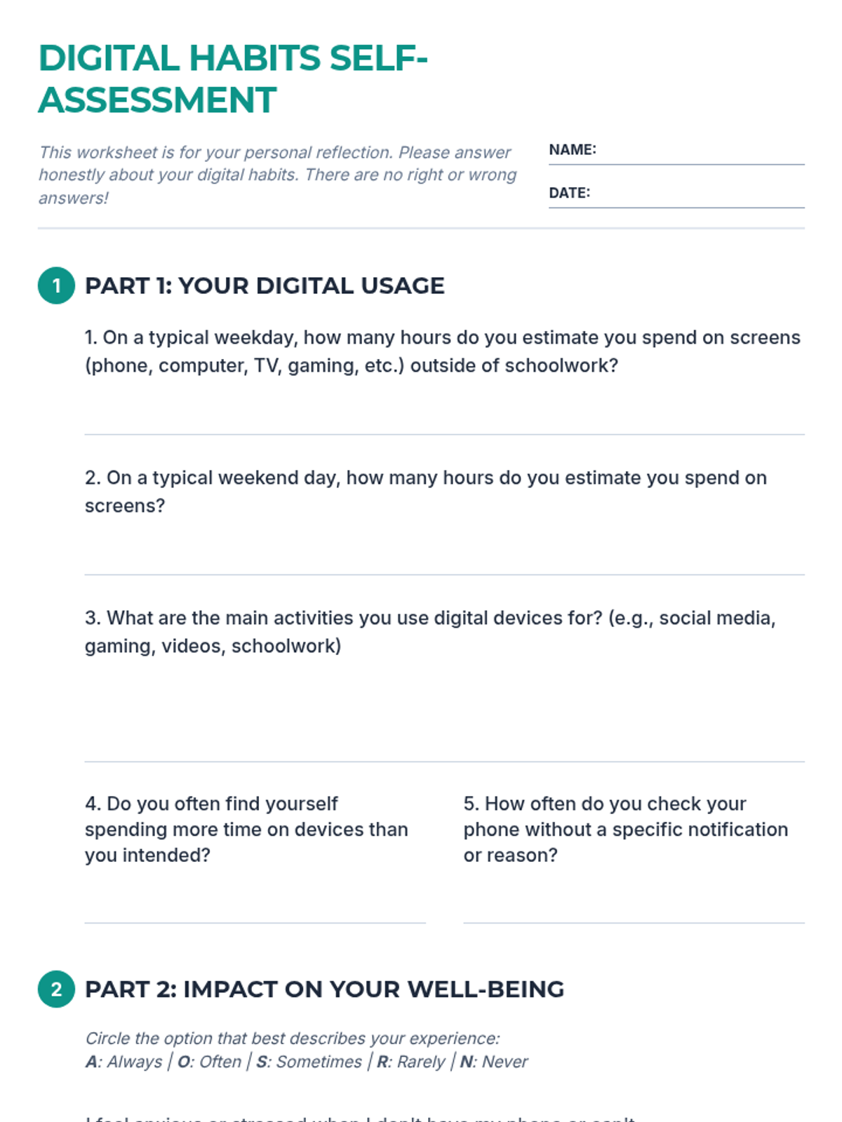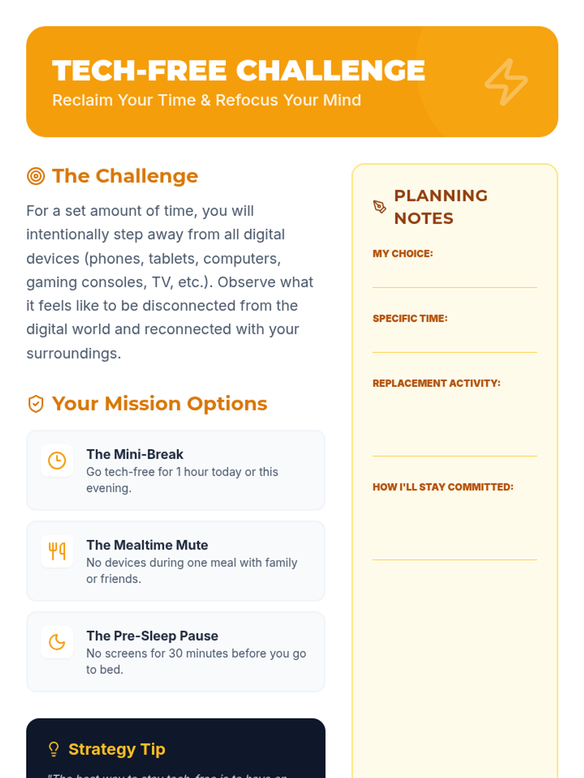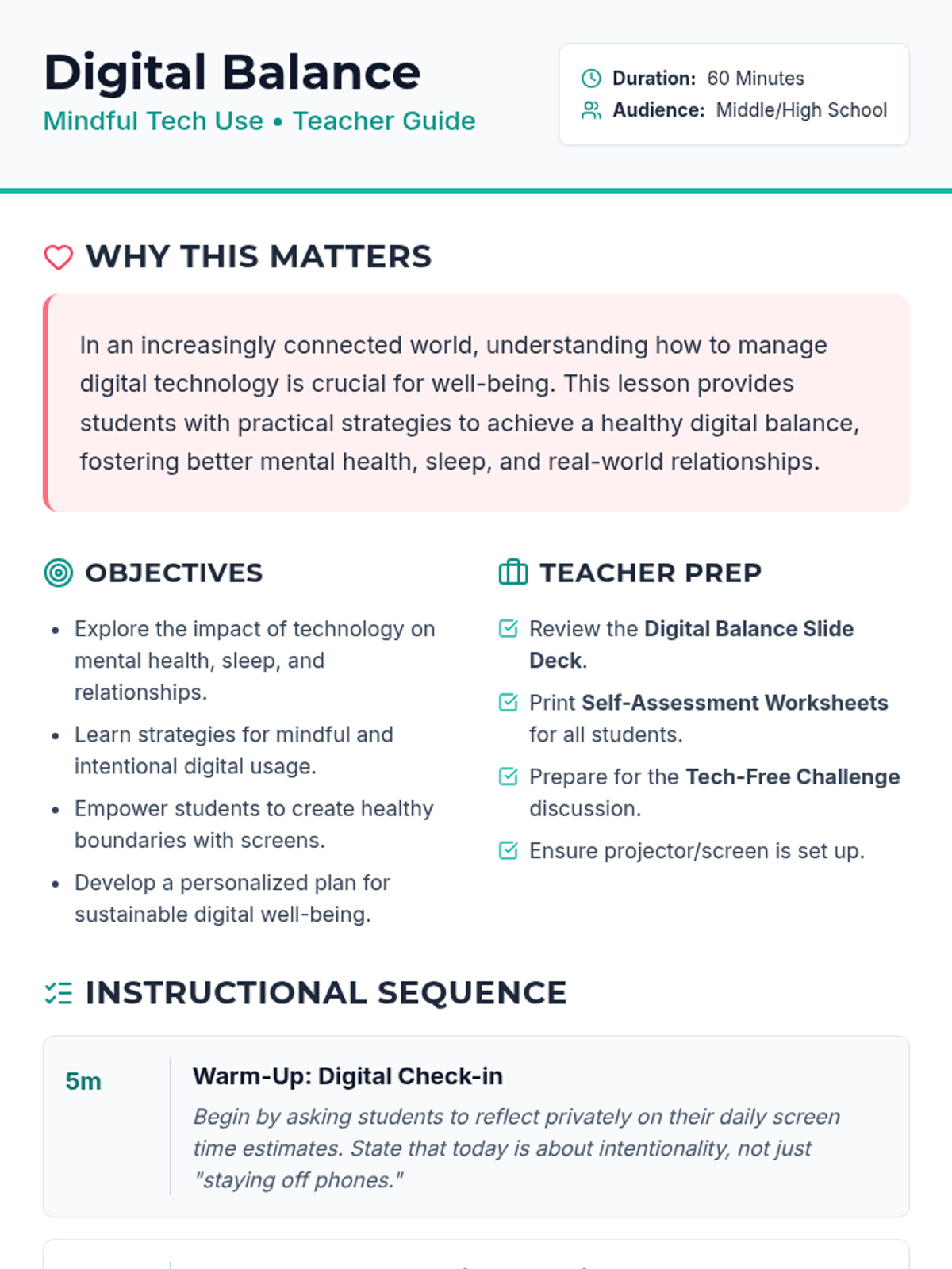 A comprehensive 60-minute lesson designed for middle and high school students to evaluate their digital habits and develop strategies for a healthier relationship with technology. Through self-assessment and a practical 'tech-free' challenge, students learn to balance screen time with real-world well-being.