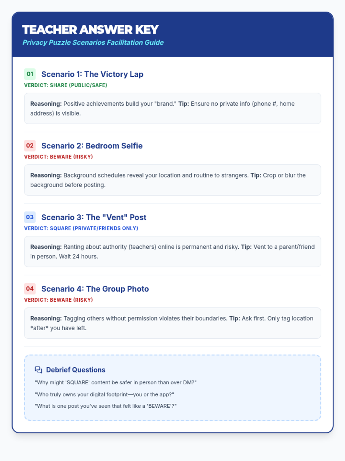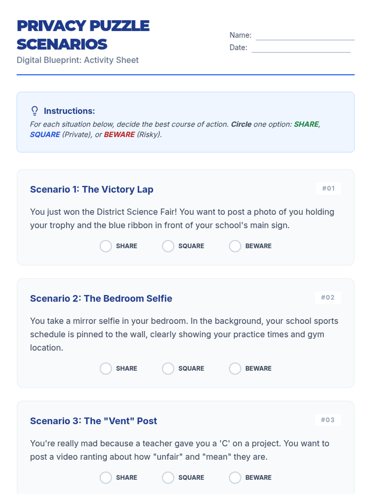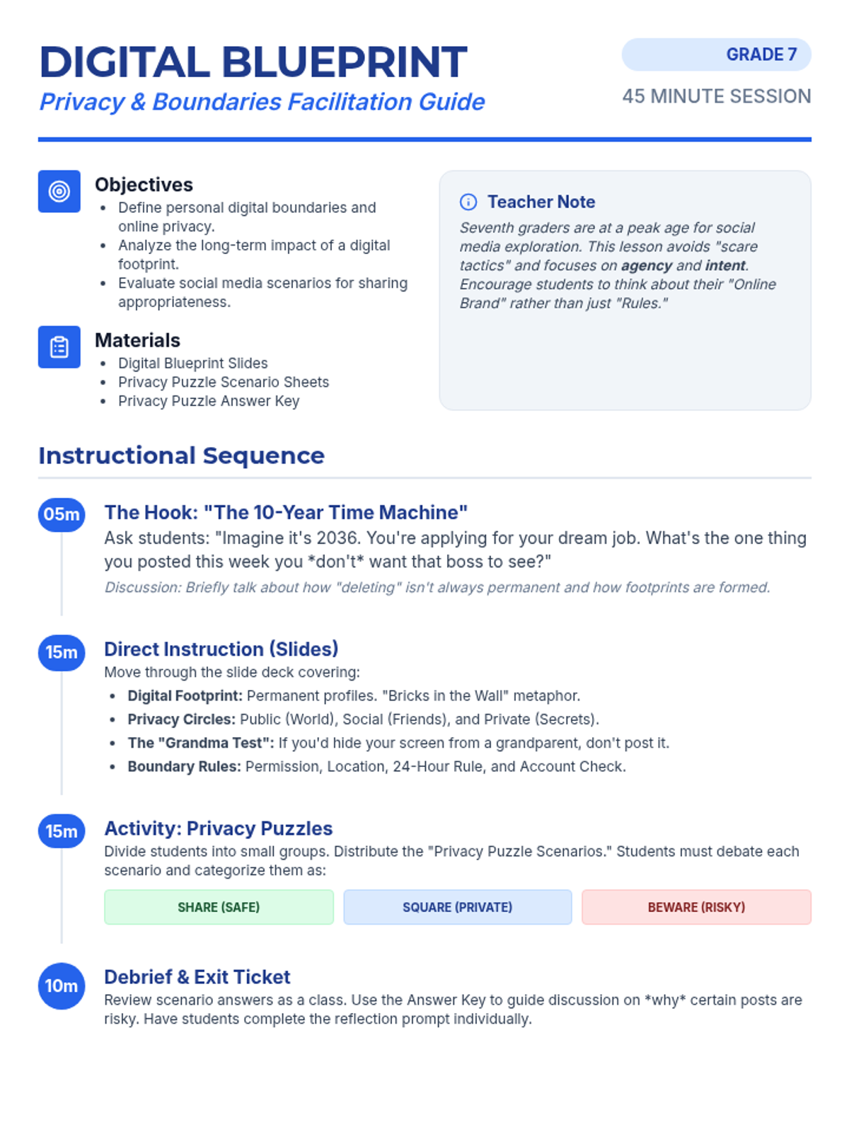 A 45-minute lesson for 7th graders focused on navigating the complexities of online privacy and establishing personal boundaries for digital sharing. Students will analyze social media scenarios and develop a personal 'Digital Blueprint' for their online presence.