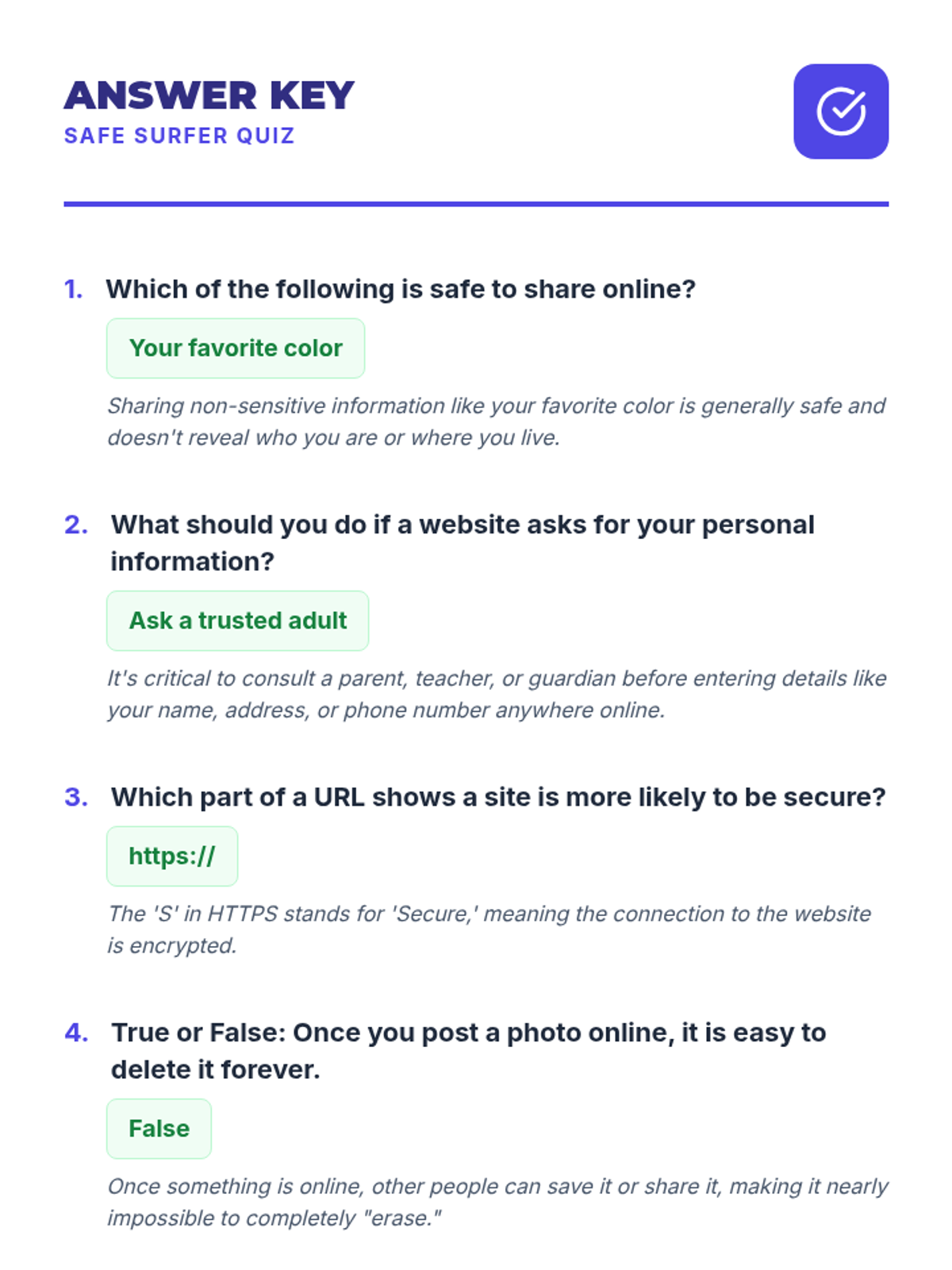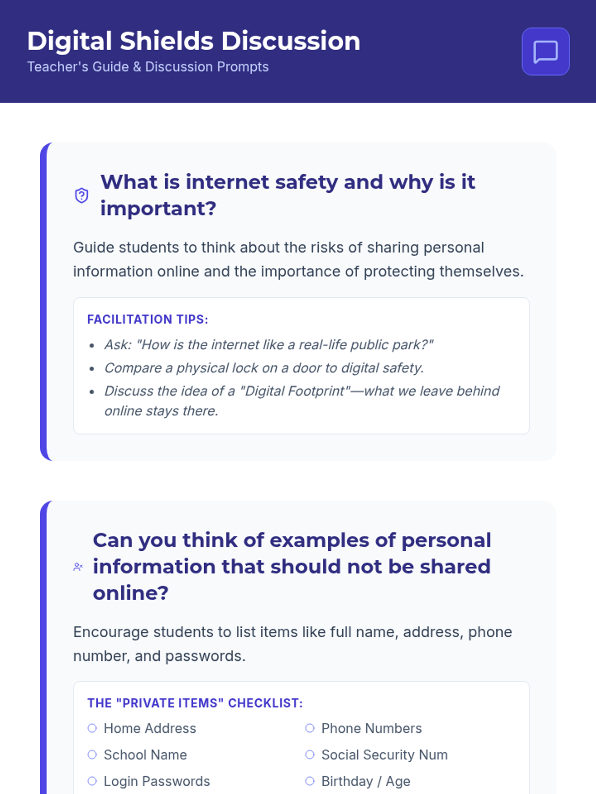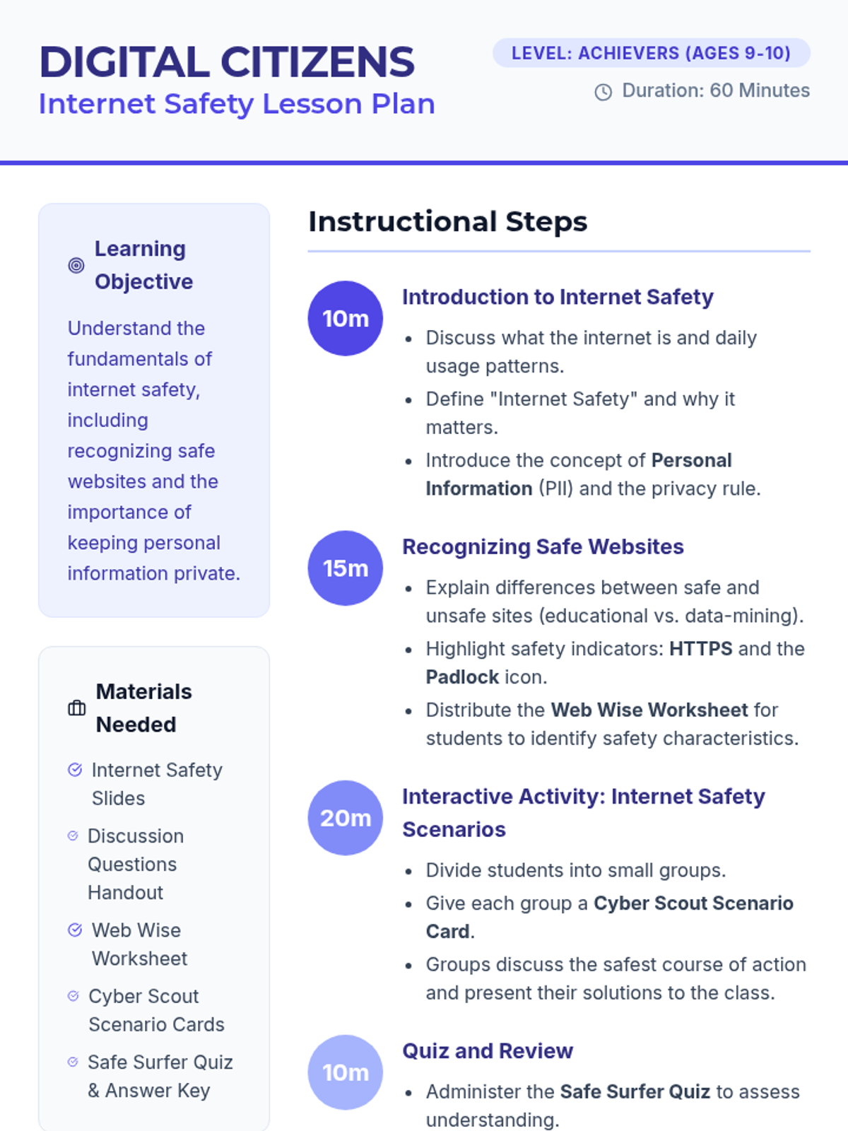 This lesson introduces students to the basics of internet safety, focusing on protecting personal information and identifying secure websites. Through guided discussion and interactive scenarios, students learn to navigate the digital world responsibly.