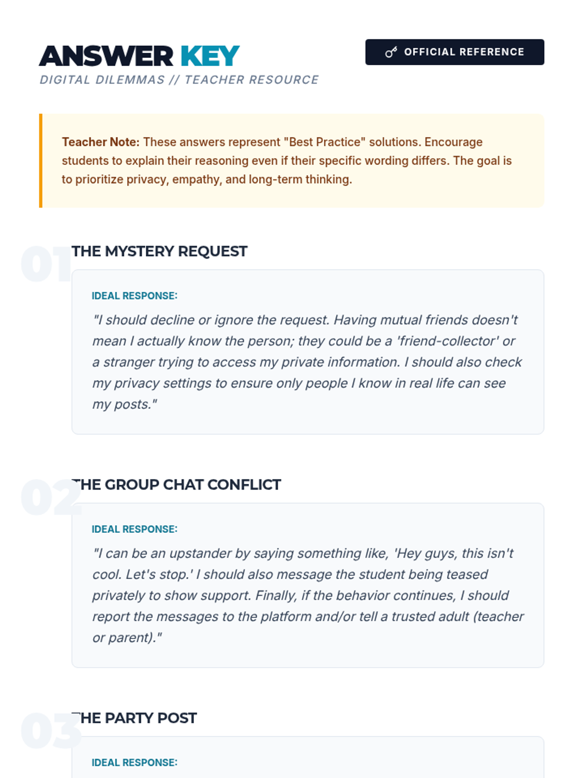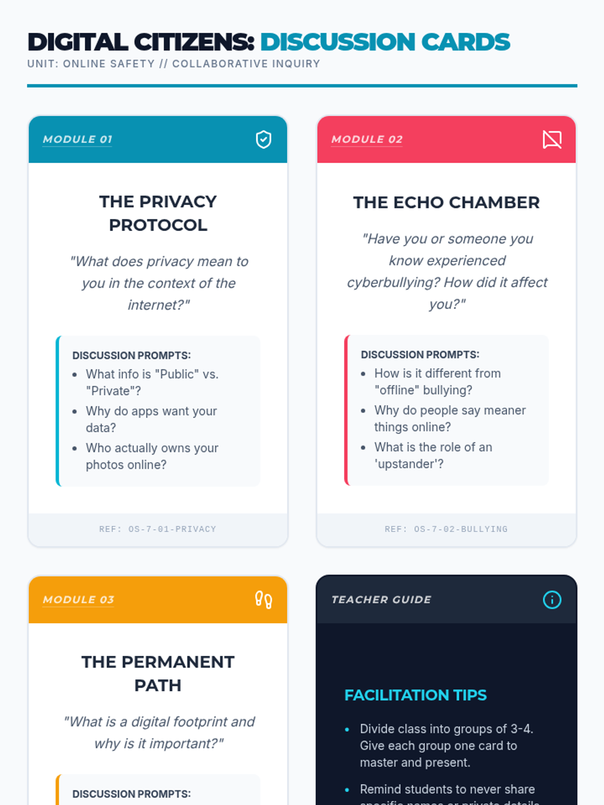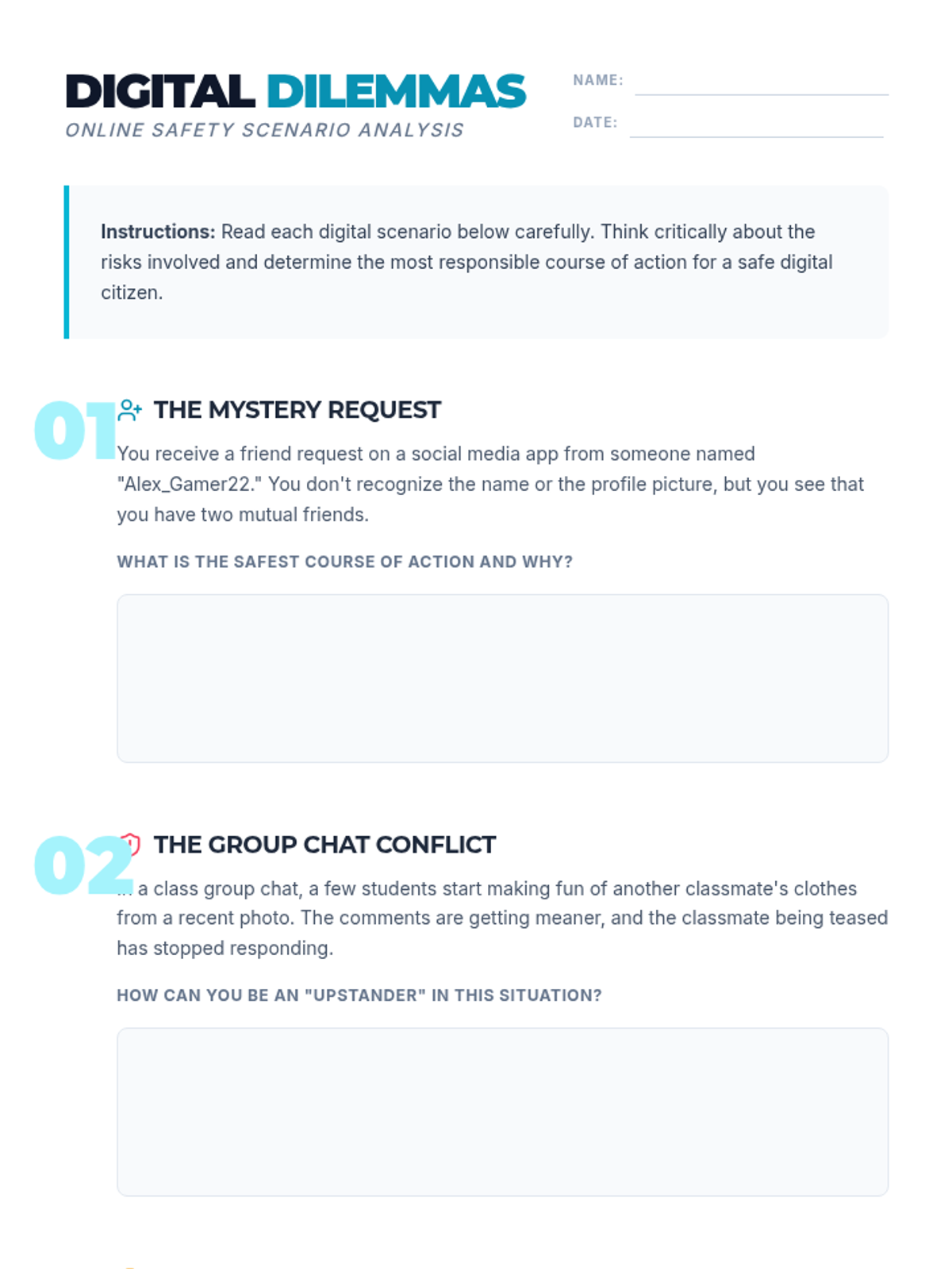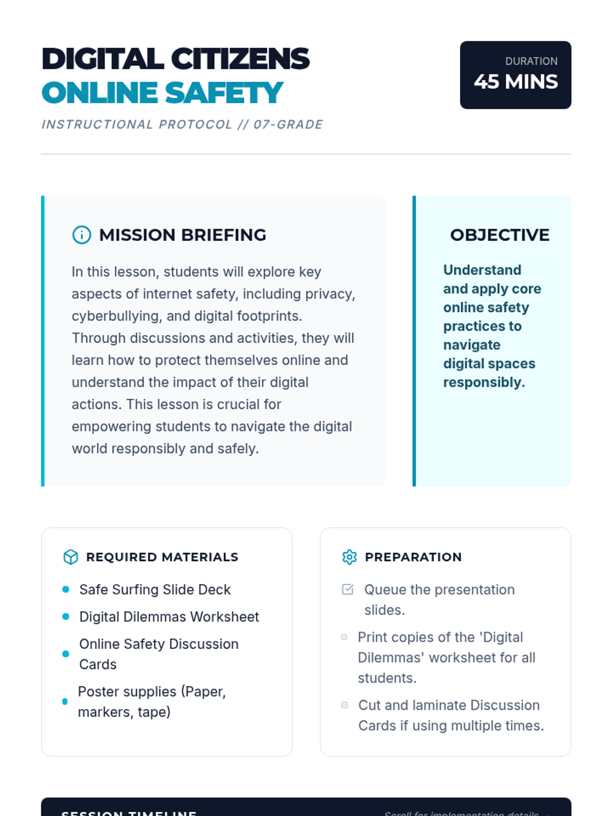 A comprehensive lesson on internet safety, privacy, cyberbullying, and digital footprints for middle school students, empowering them to navigate the web responsibly.