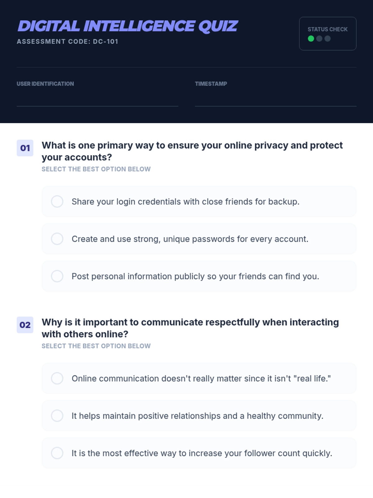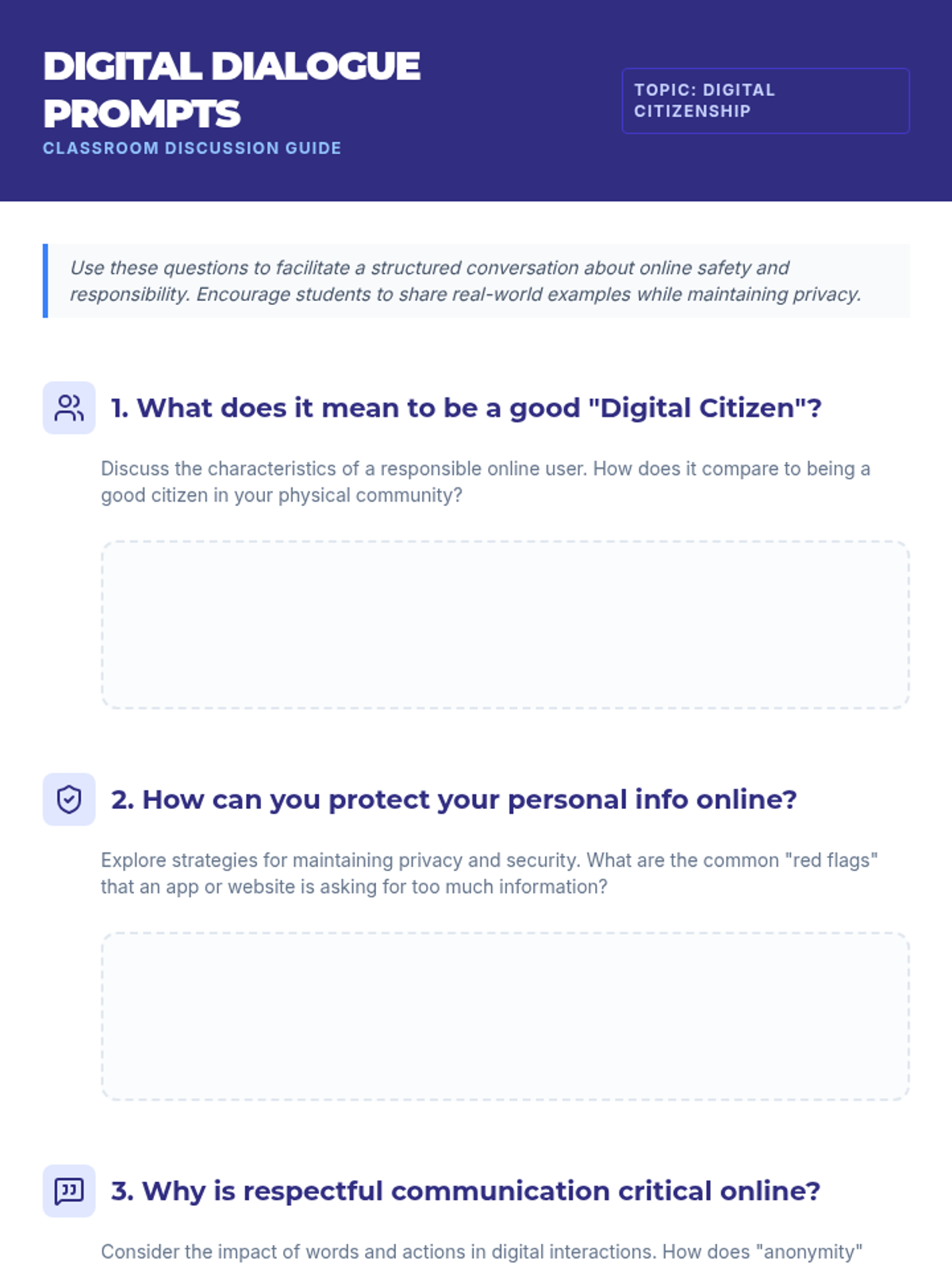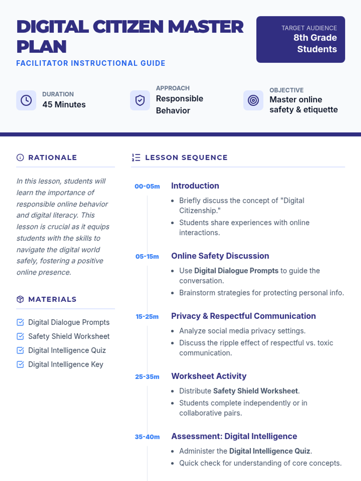 An introductory lesson for 8th graders on responsible online behavior, covering safety, privacy, and respectful communication in the digital age.