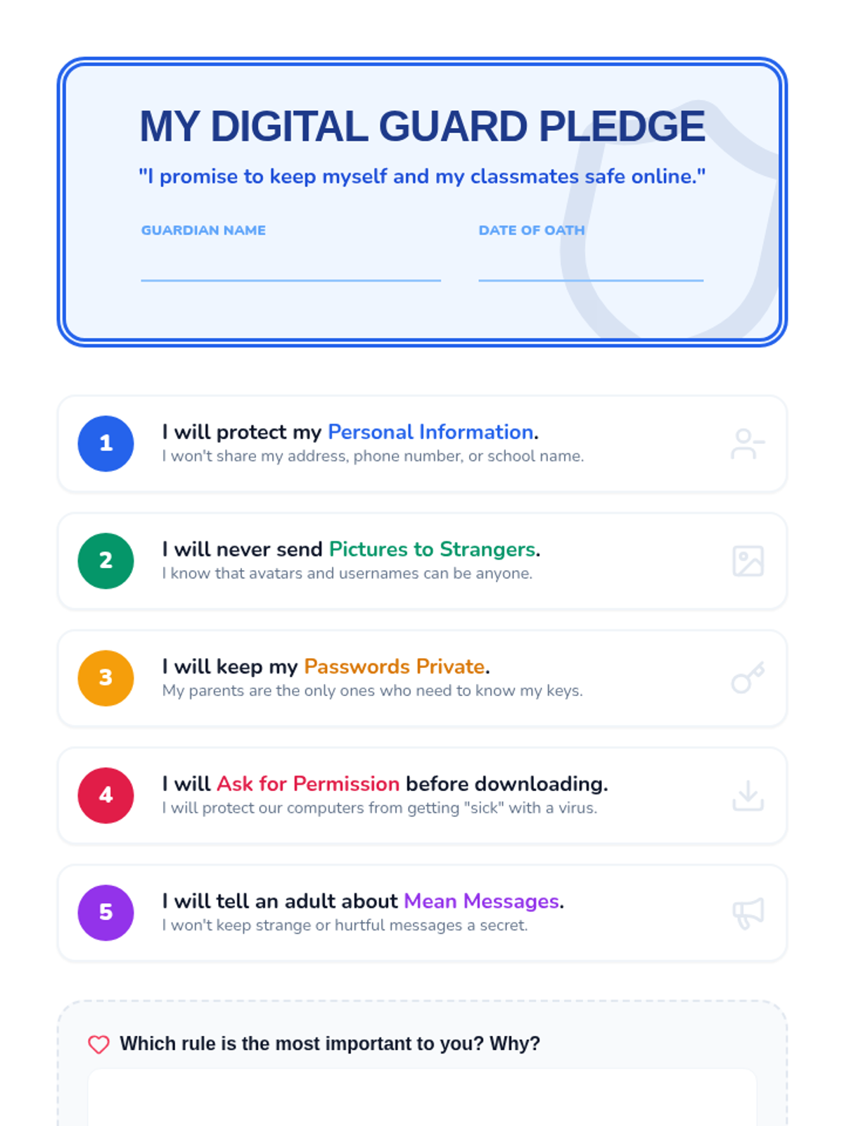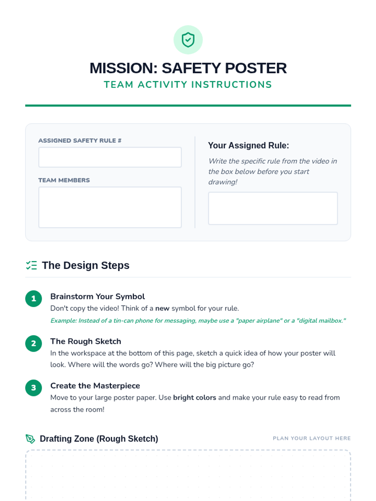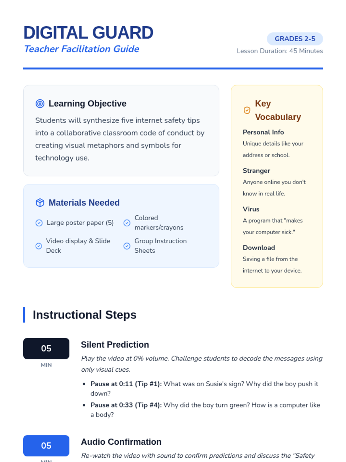 Students learn five essential internet safety tips through video analysis and creative poster design to establish a classroom digital code of conduct.