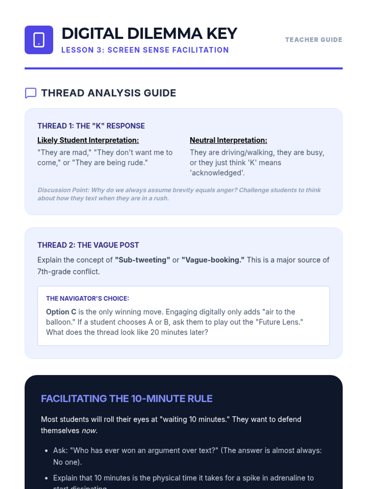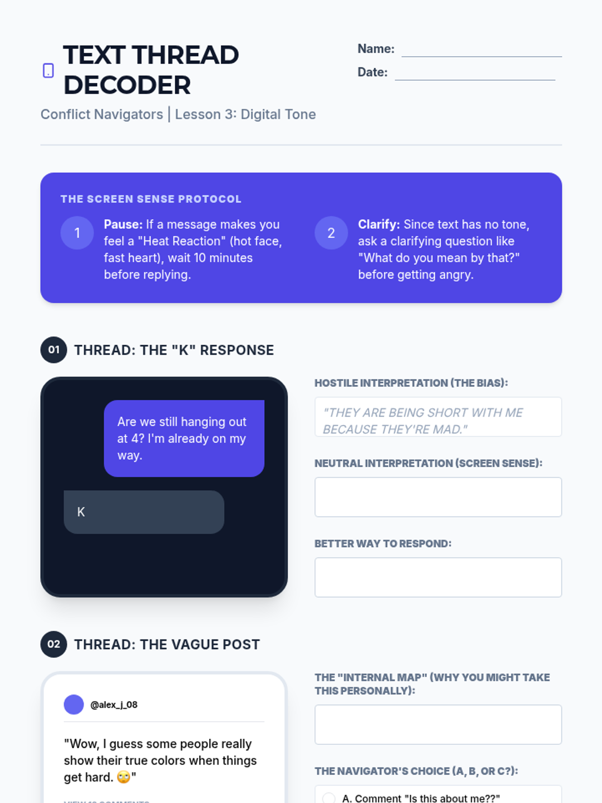 Focuses on healthy conflict resolution. Students learn to use 'I' statements and de-escalation techniques to handle disagreements without damaging friendships.