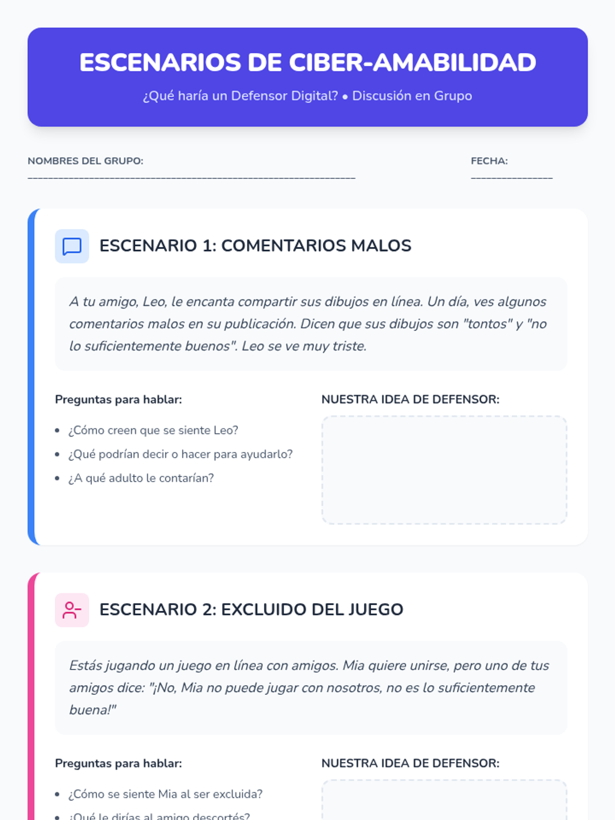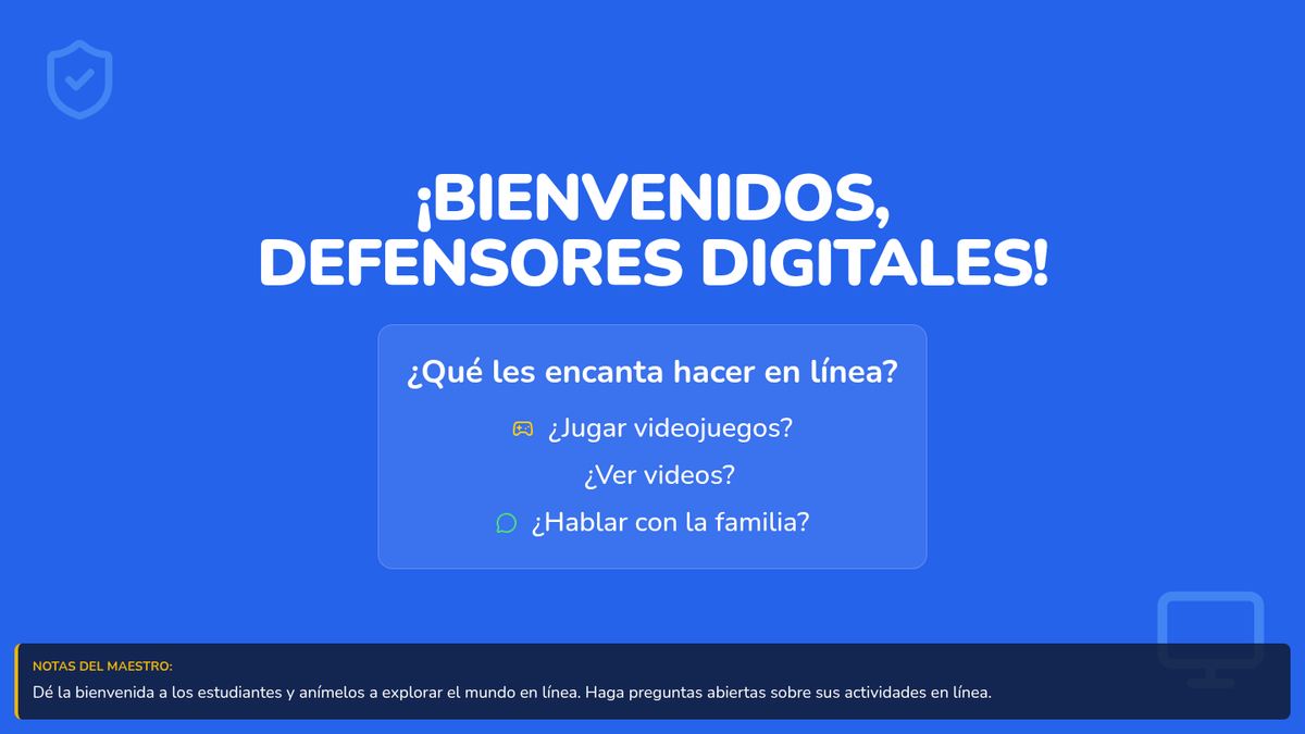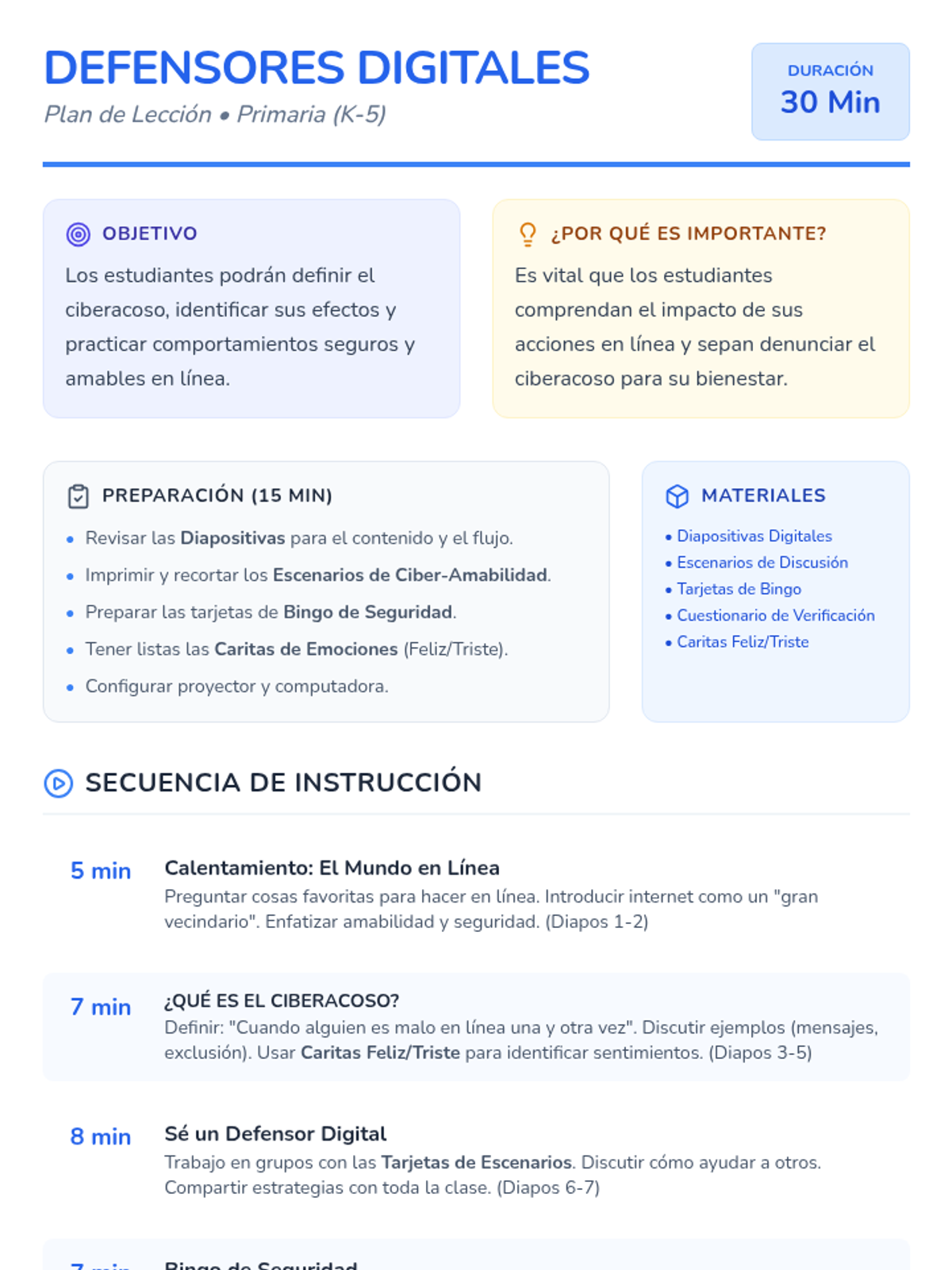 Esta lección introduce a los estudiantes de K-5º grado al concepto de ciberacoso, su impacto y estrategias para interacciones positivas en línea. A través de discusiones interactivas y juegos, los estudiantes aprenderán a ser "Defensores Digitales".