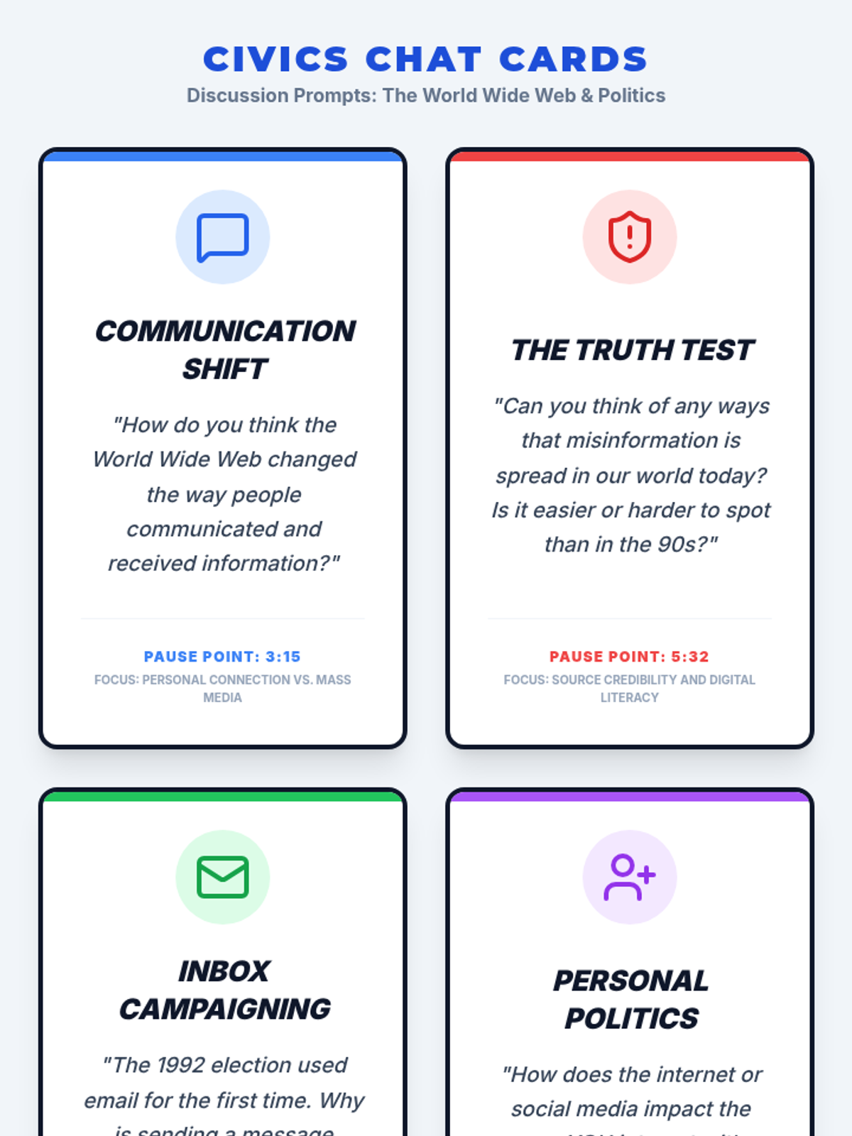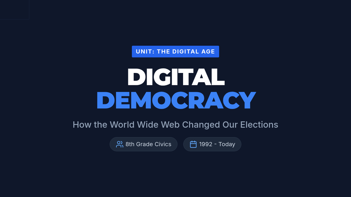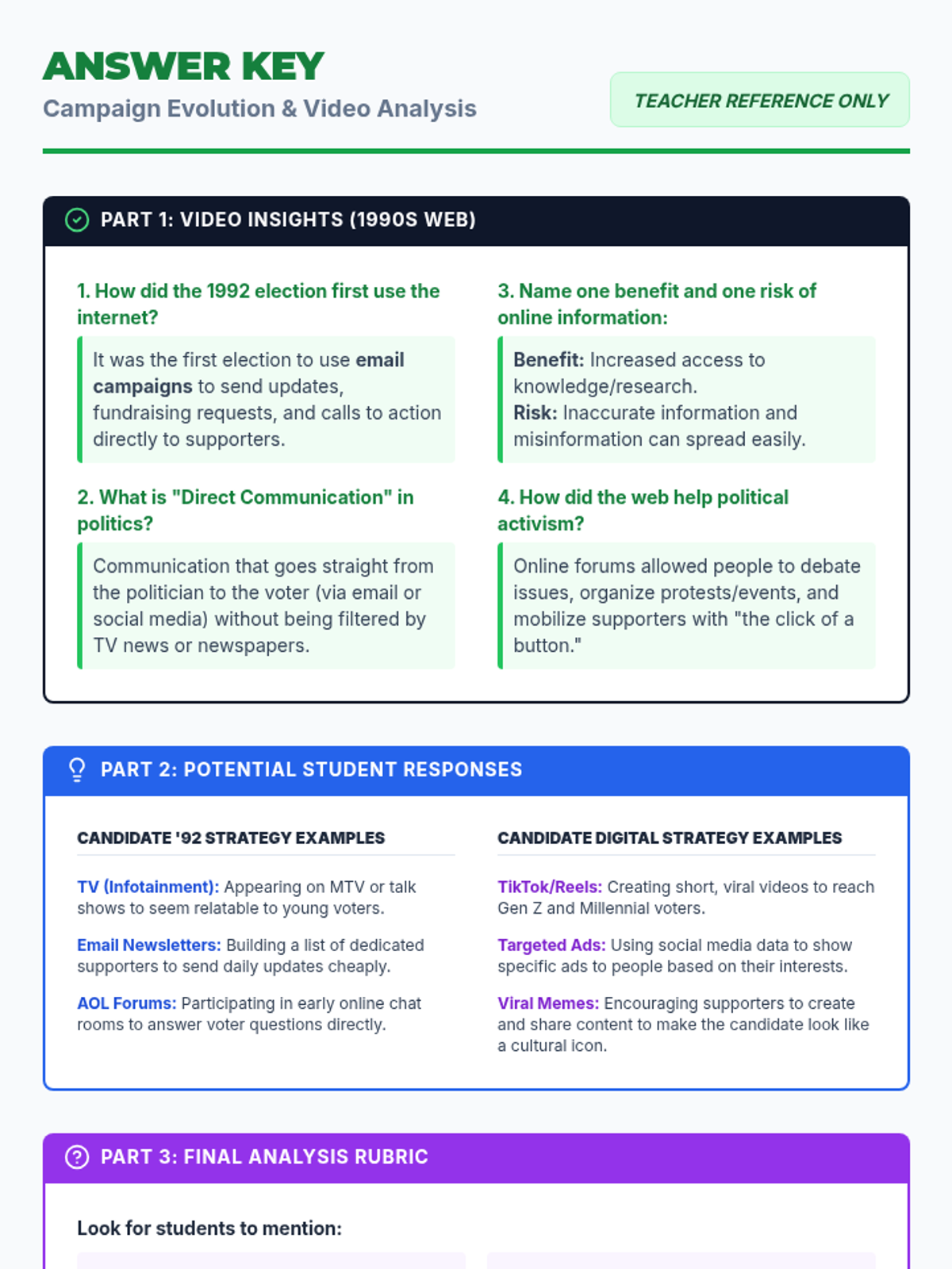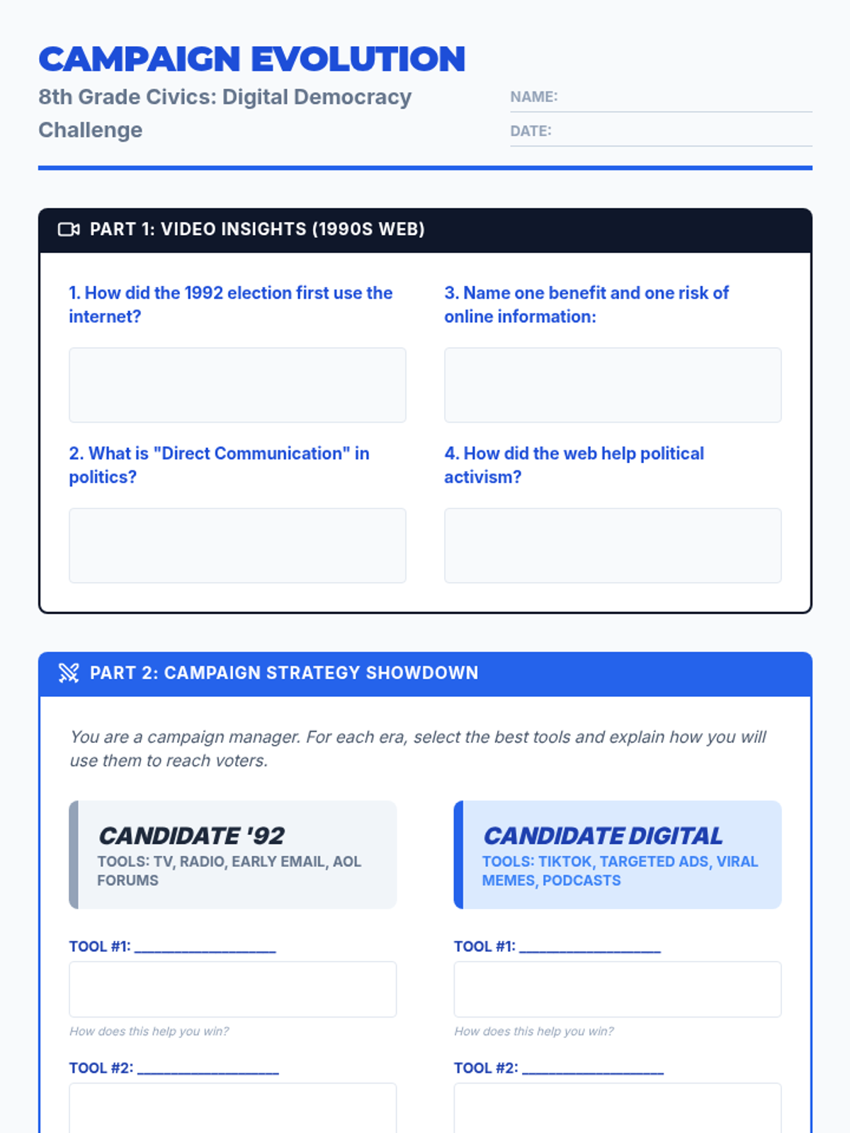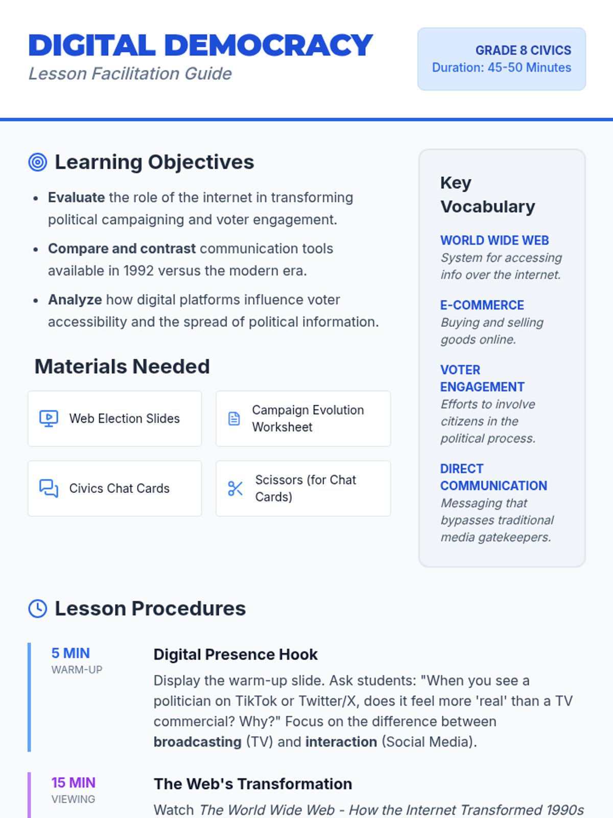 An 8th-grade civics lesson exploring the evolution of political campaigning from the dawn of the World Wide Web in 1992 to the social media-driven landscape of today. Students analyze communication strategies and evaluate the internet's impact on democratic engagement.