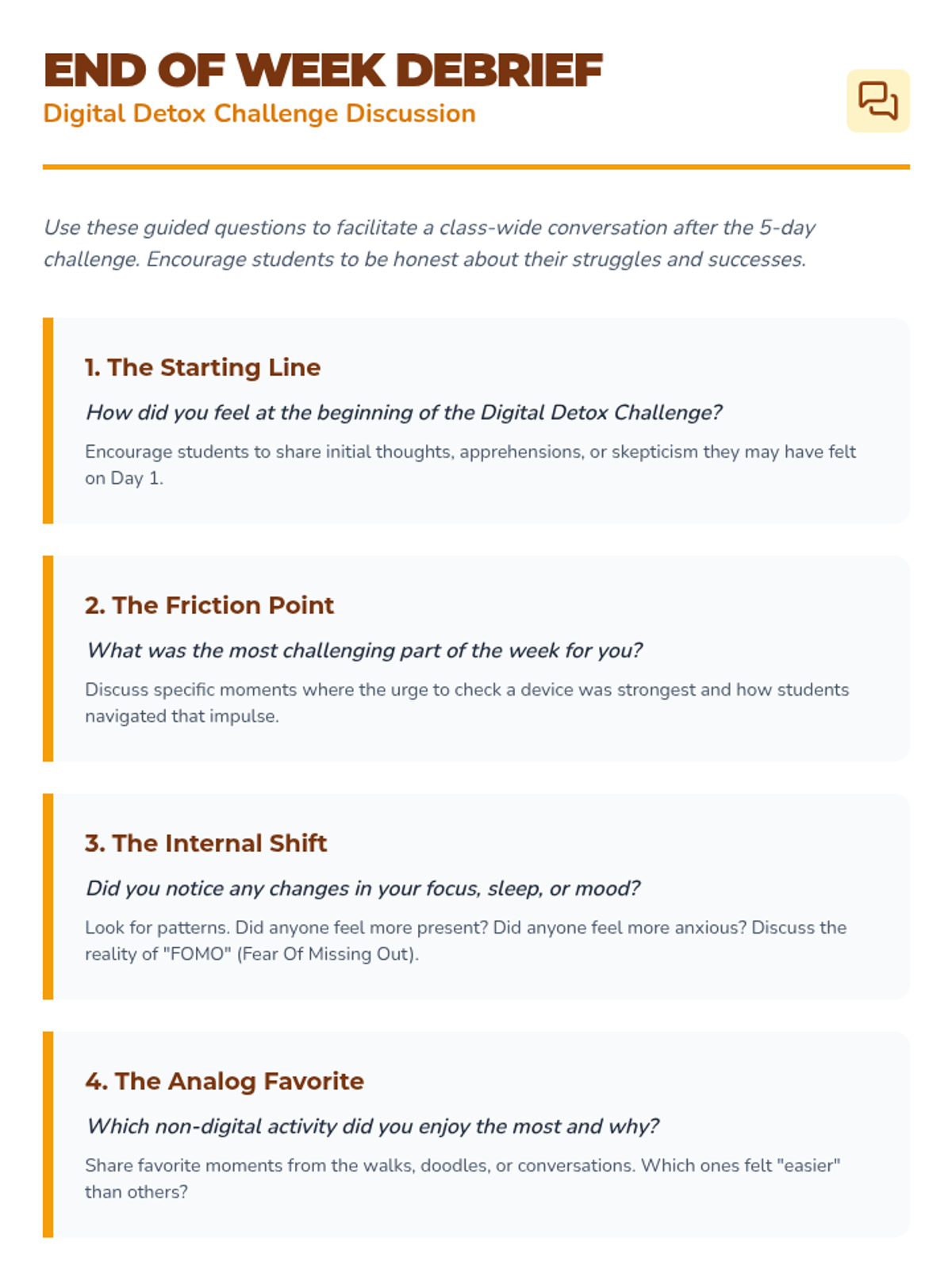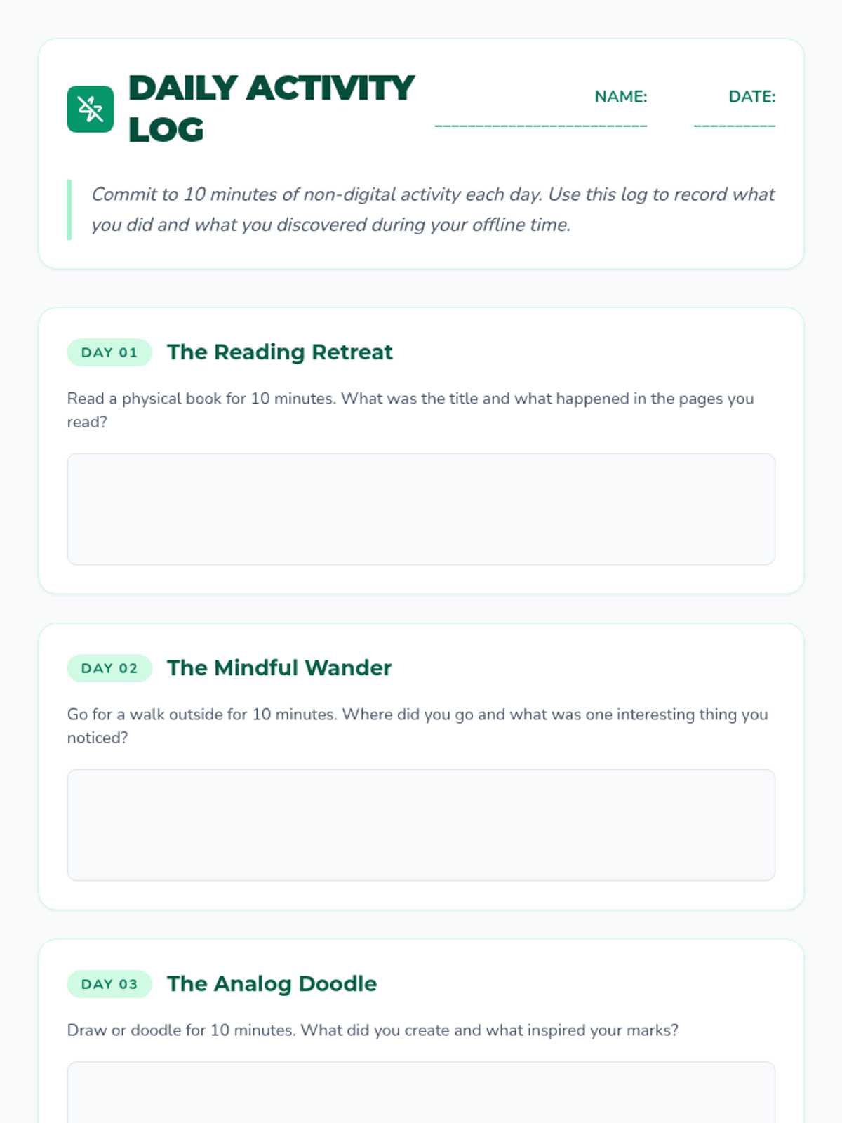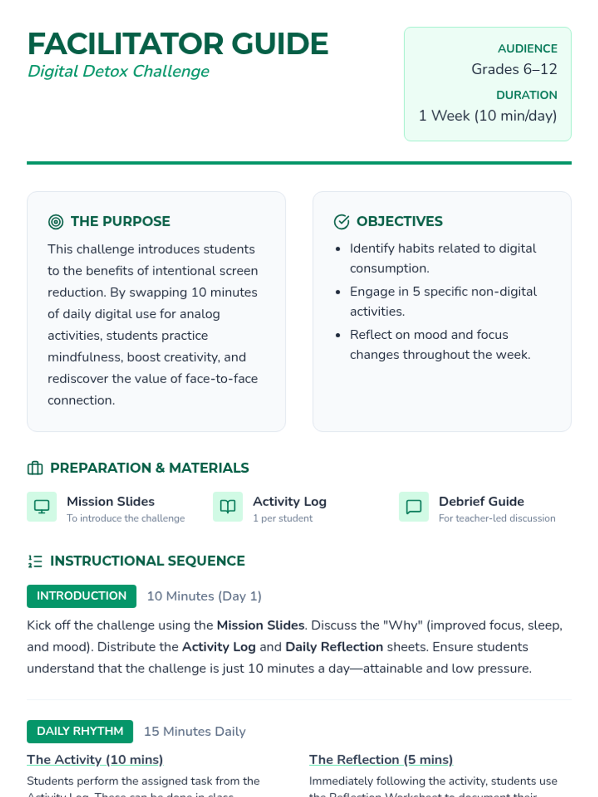 A week-long challenge where students reduce screen time and engage in non-digital activities to promote mindfulness and focus.