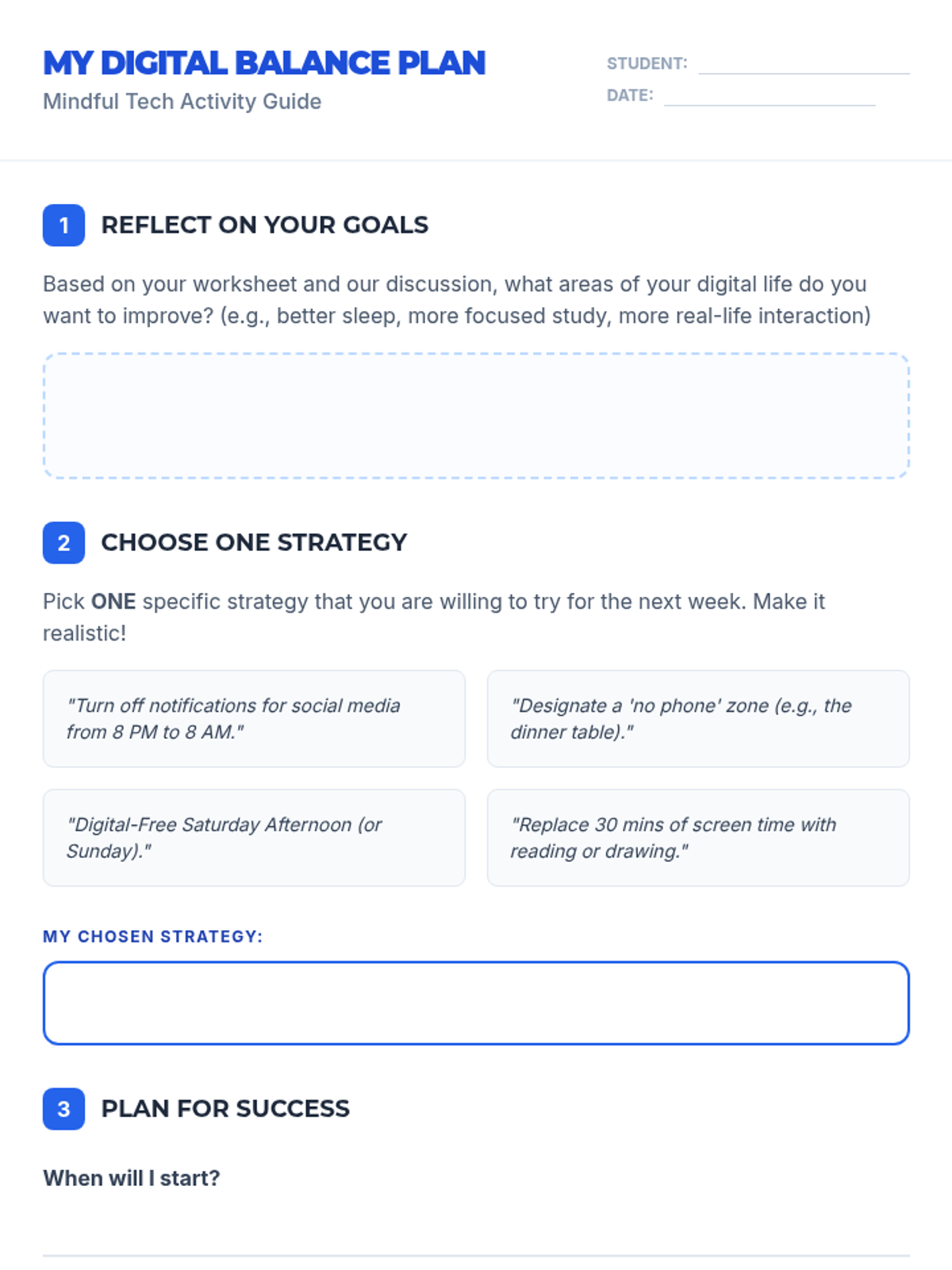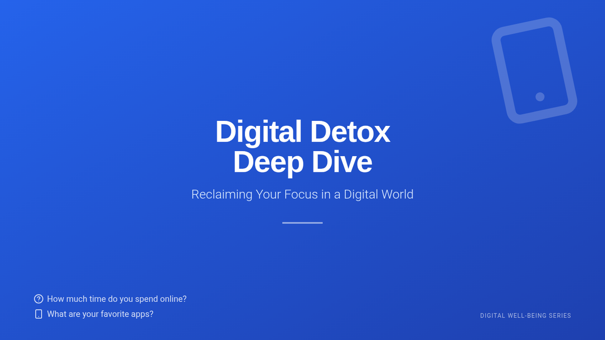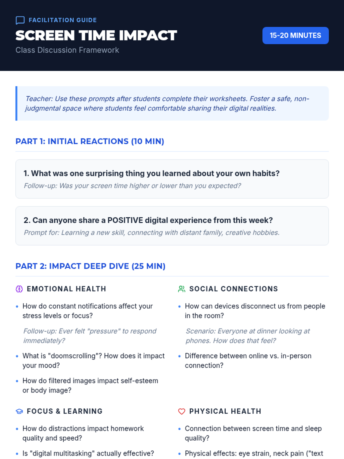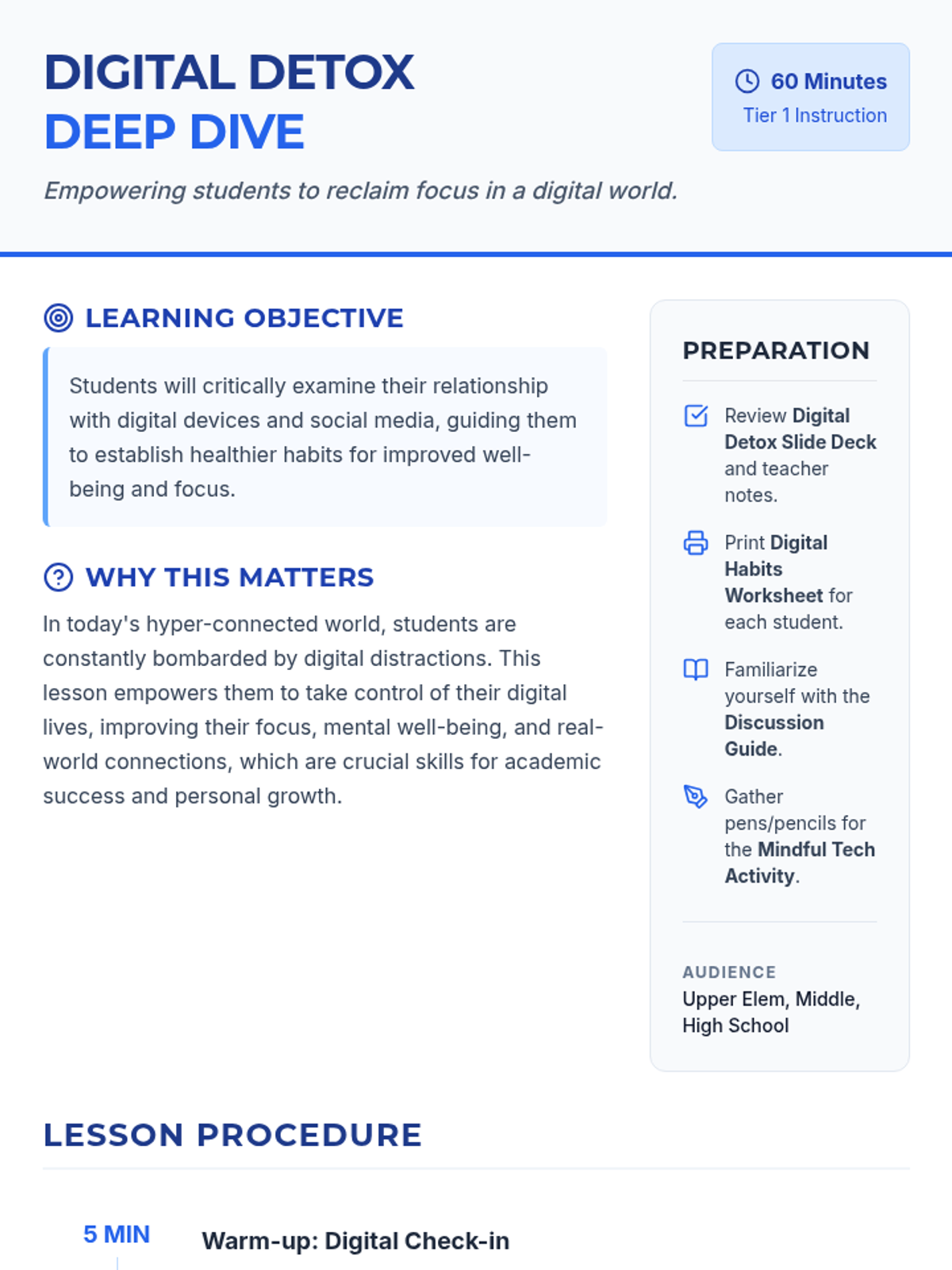 A 60-minute lesson designed to help students evaluate their relationship with technology, understand the impacts of screen time, and develop practical strategies for a healthier digital-life balance.