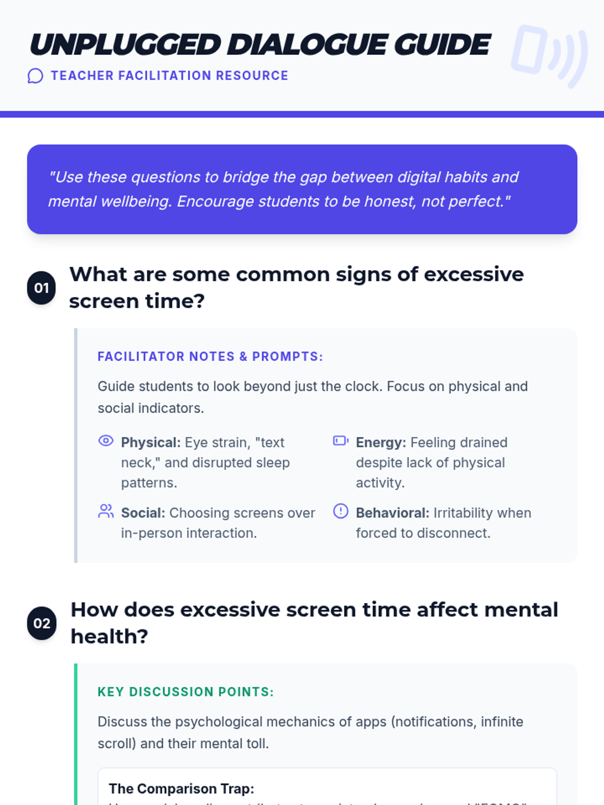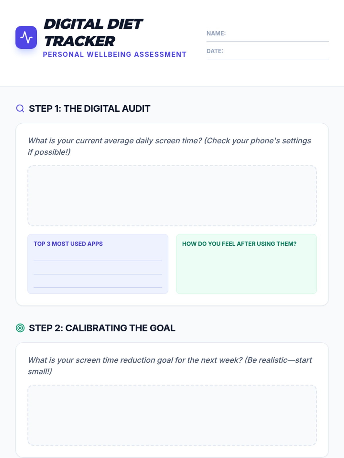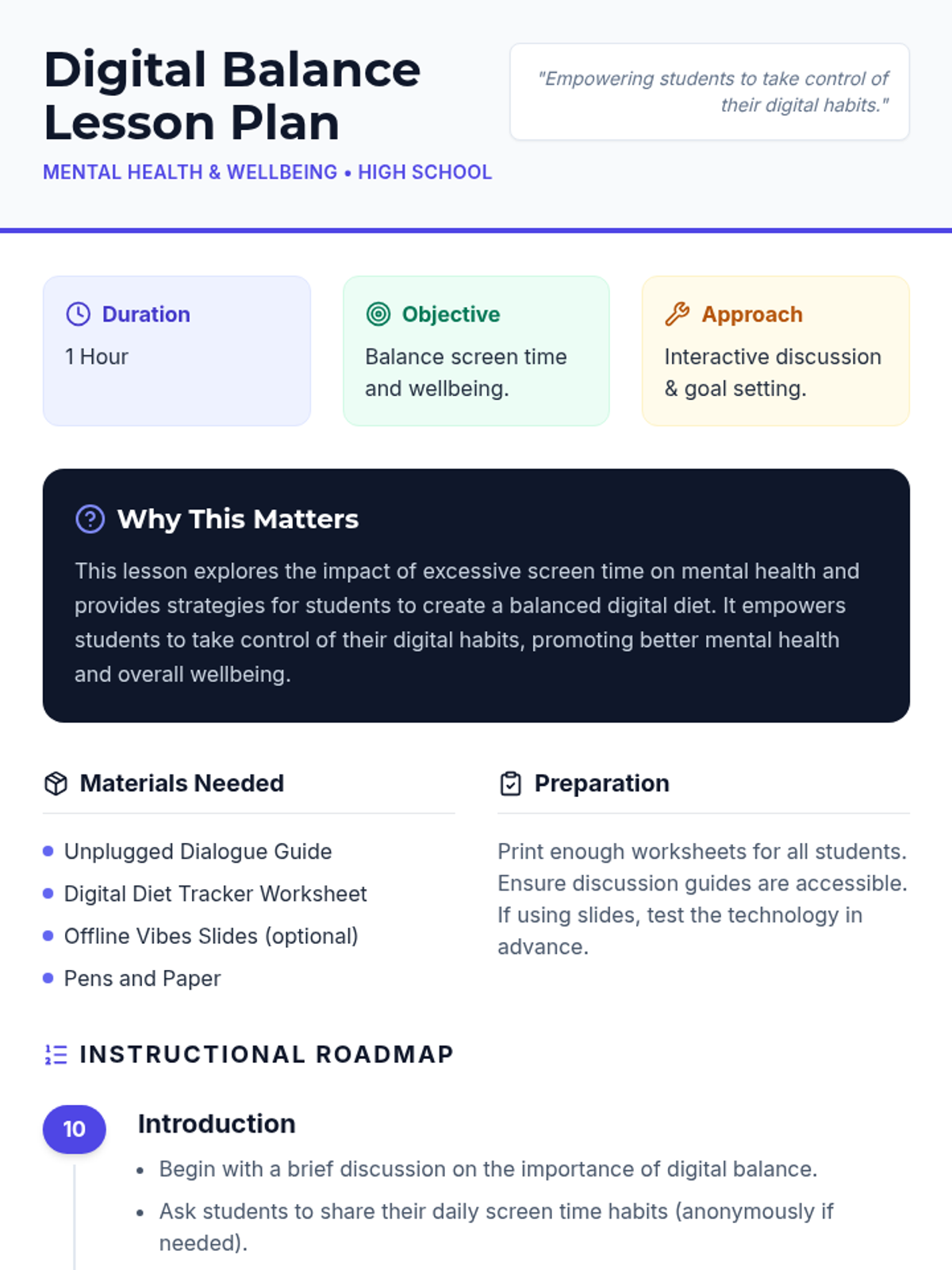A comprehensive lesson for high school students to evaluate their digital habits, understand the impact of screen time on mental health, and develop a personalized 'digital diet' for better wellbeing.