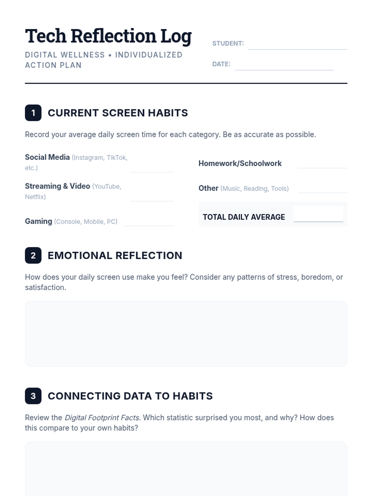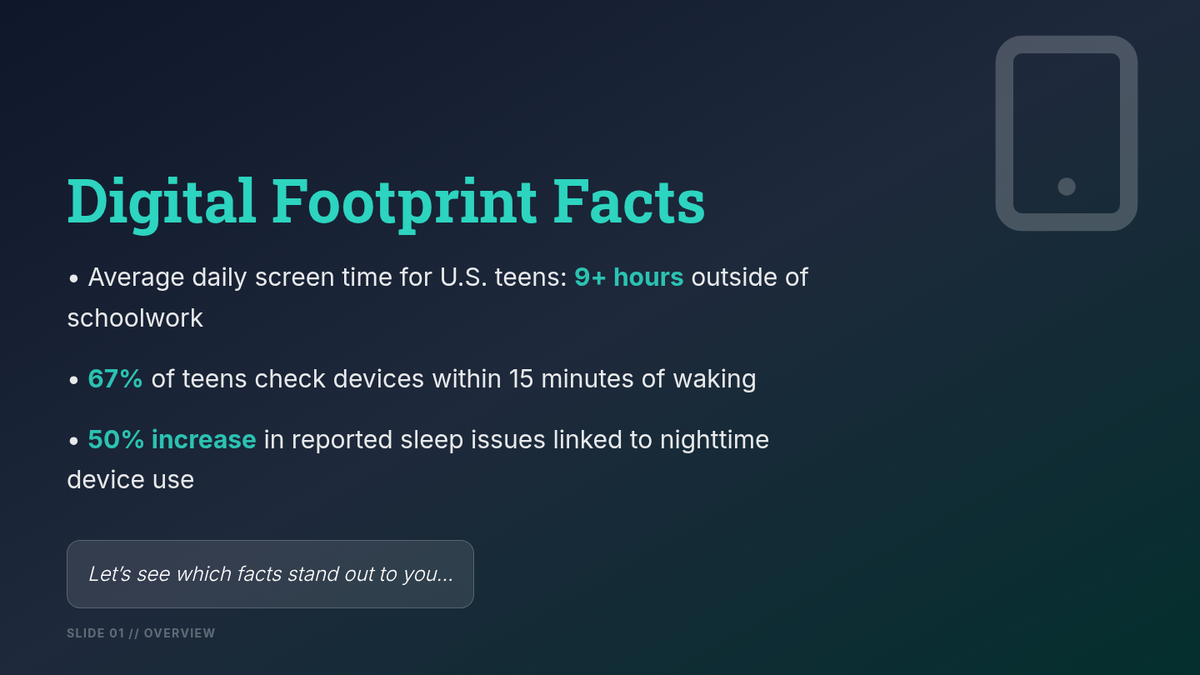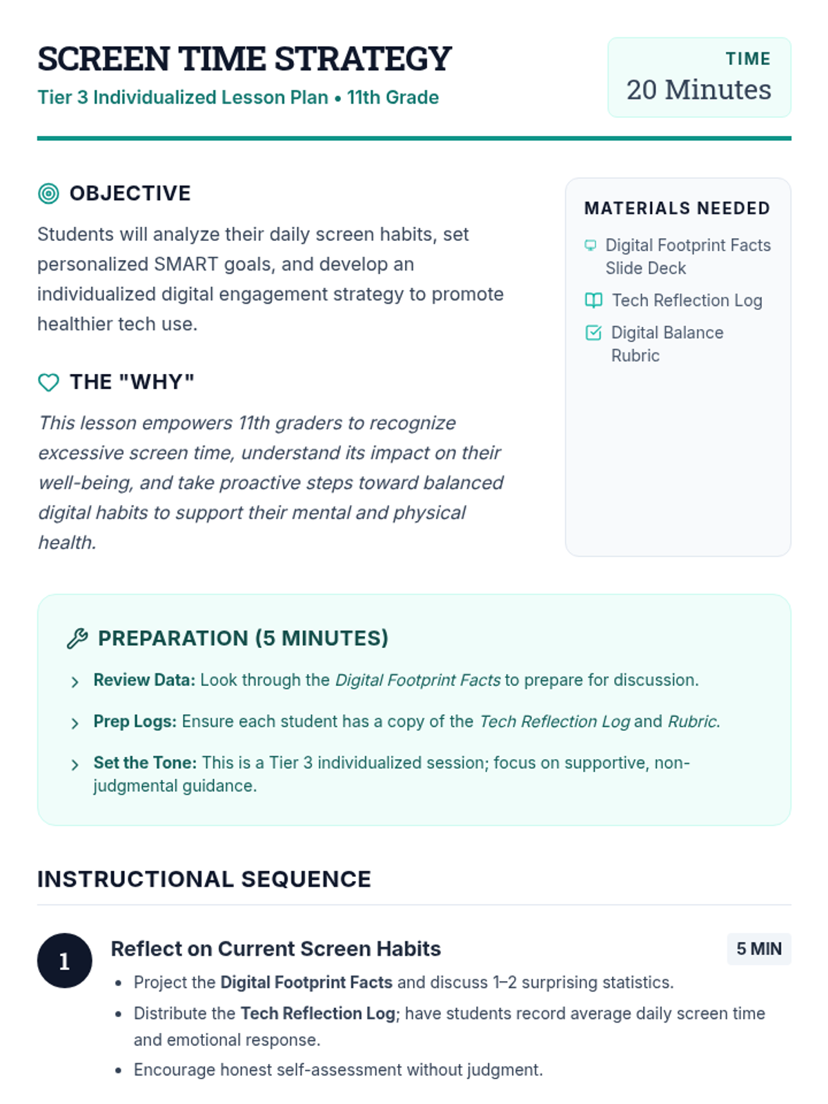 An individualized Tier 3 lesson designed for 11th graders to assess their digital habits, understand the impacts of excessive screen time, and create a personalized SMART goal strategy for healthier tech engagement.
