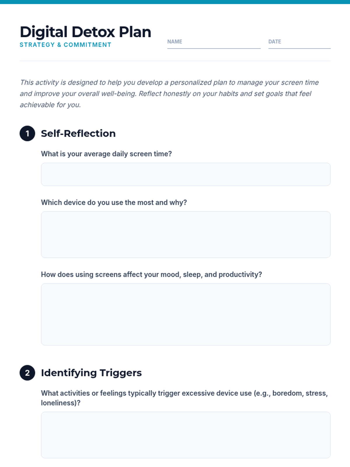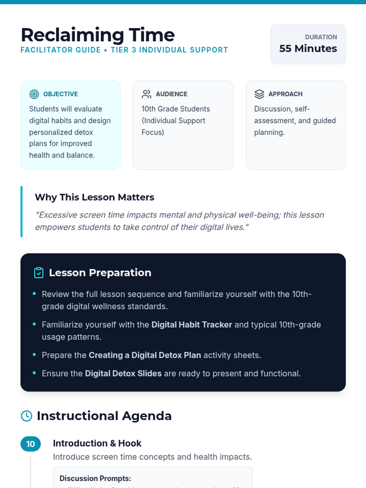 An individual-focused lesson for 10th-grade students on managing screen time. Students assess their digital habits, identify triggers for excessive use, and design a personalized digital detox plan to improve their physical and mental well-being.