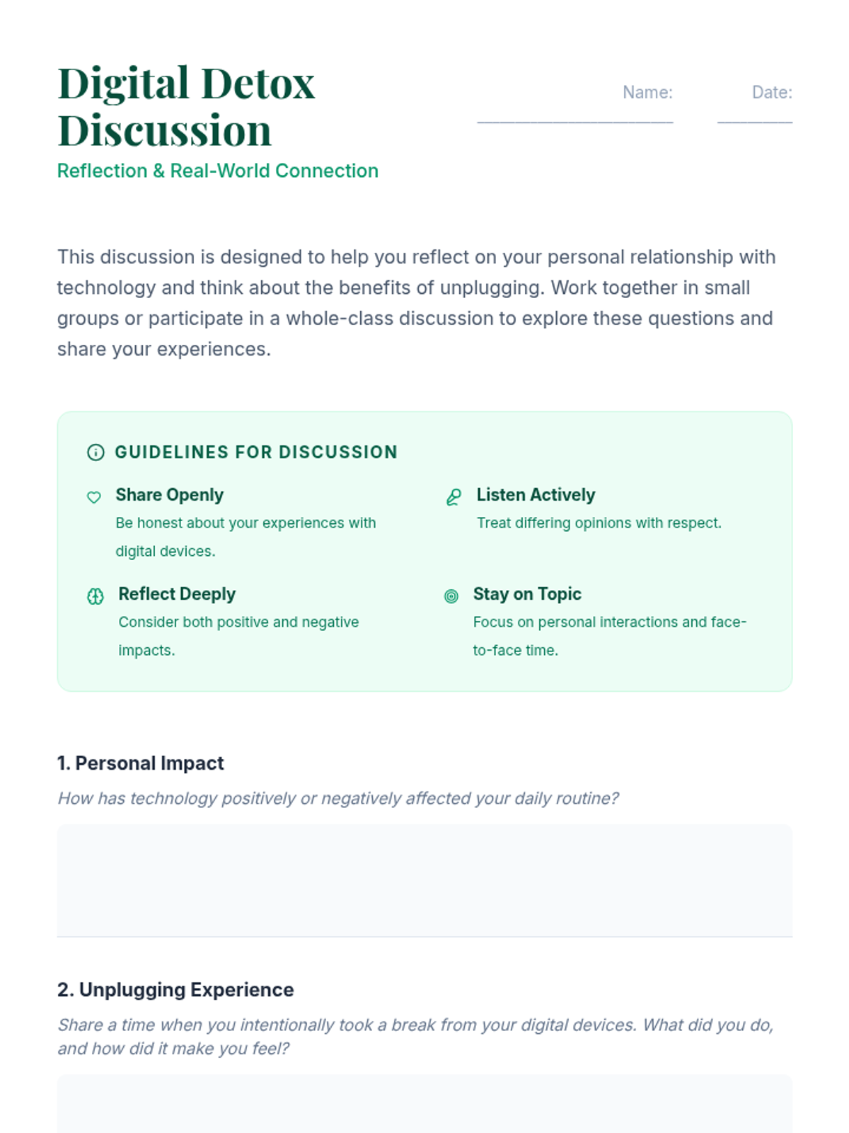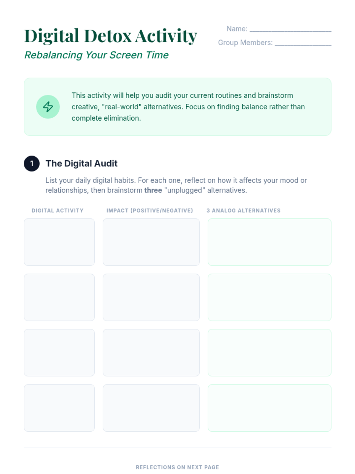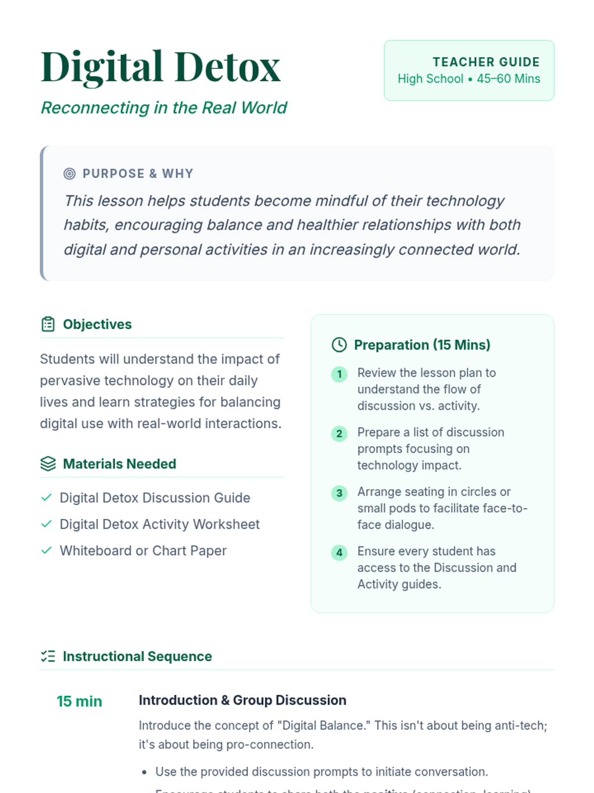 A high school lesson designed to help students evaluate their relationship with technology, understand the benefits of digital balance, and develop practical strategies for unplugging and reconnecting with the real world through mindfulness and face-to-face interaction.
