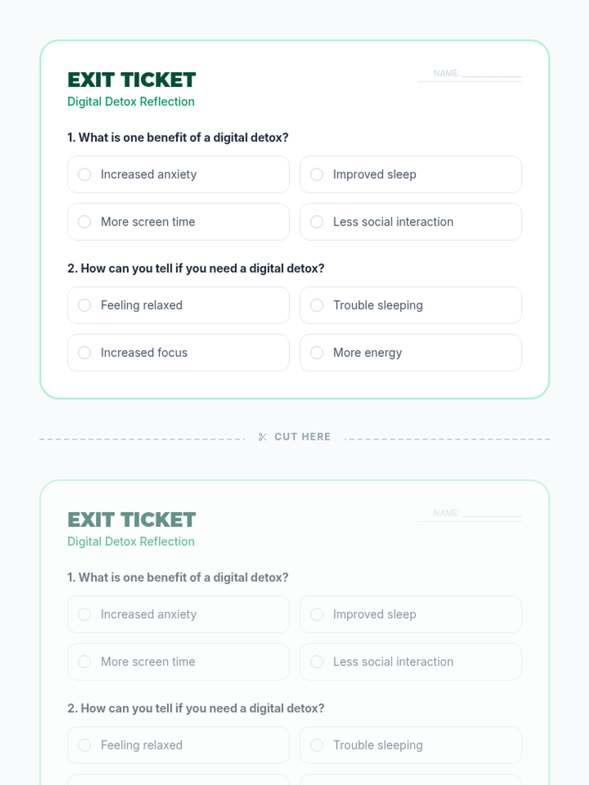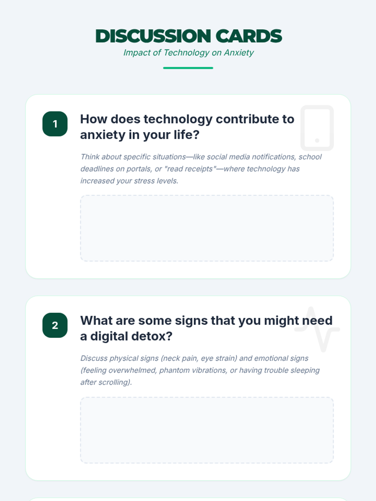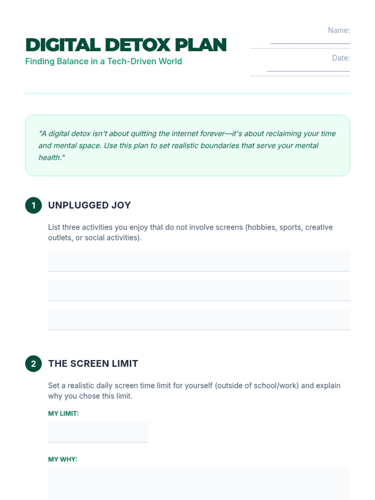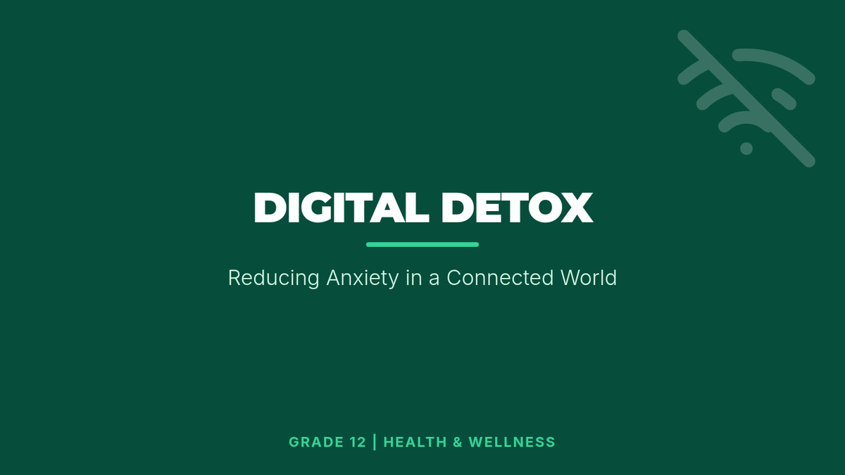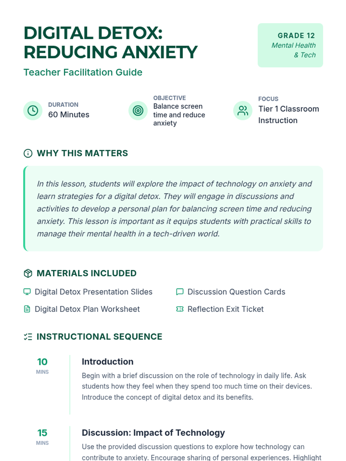 A comprehensive lesson for 12th-grade students exploring the link between technology and anxiety, featuring a personalized digital detox planning activity.