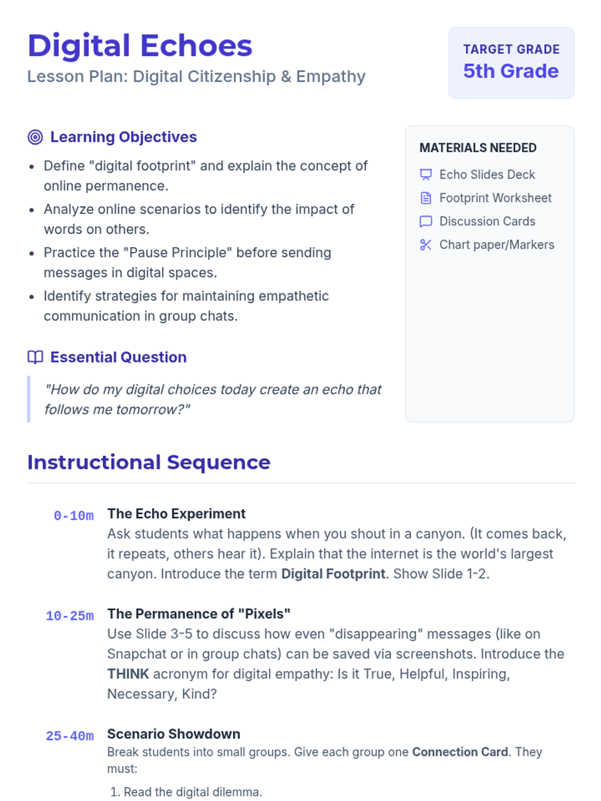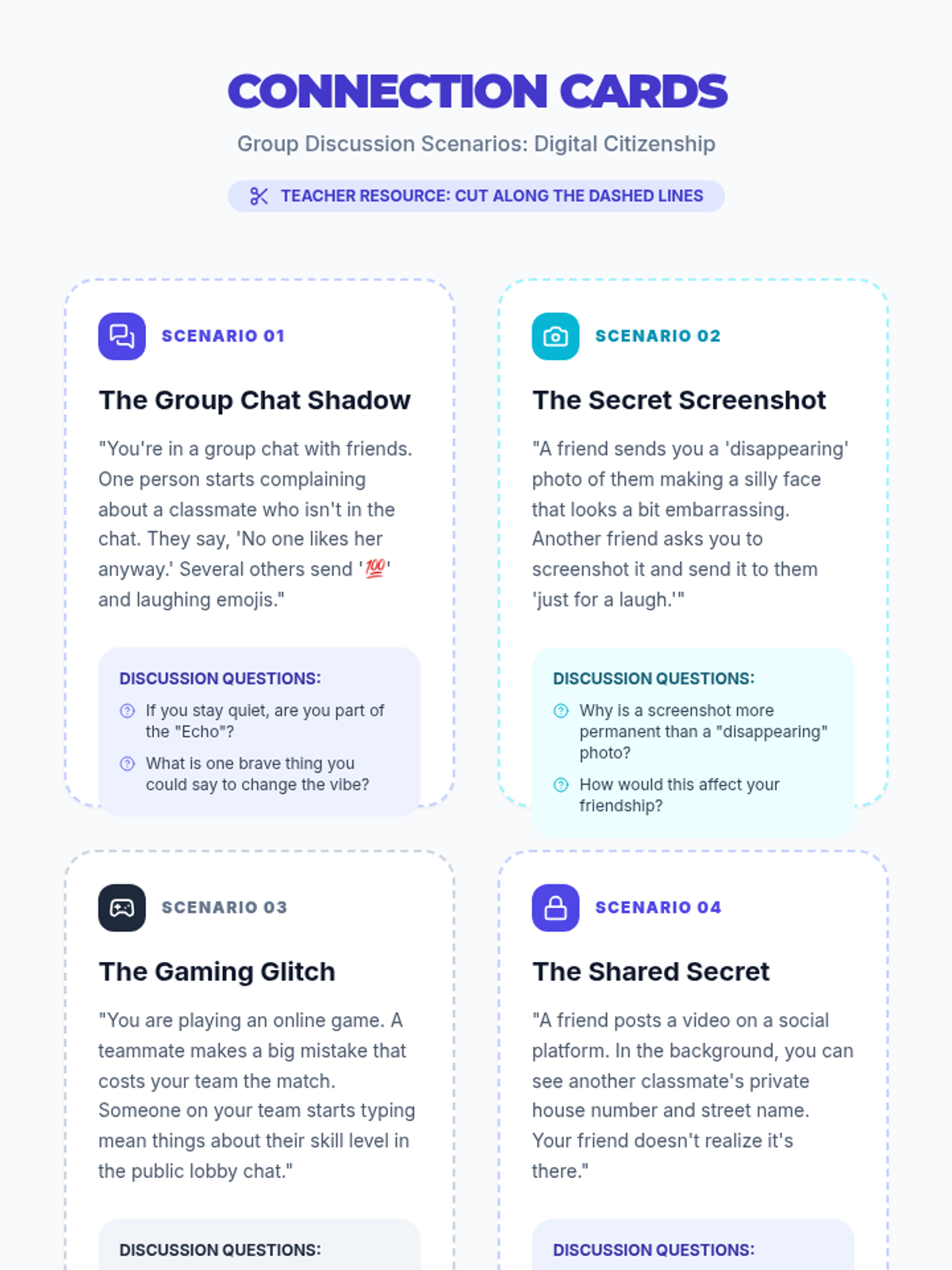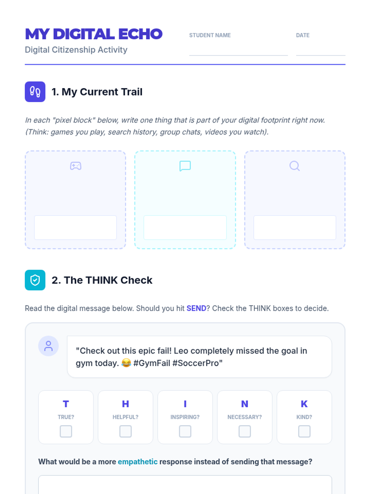 Students explore the permanence of their digital footprint and the importance of empathetic communication in online spaces. Through scenario analysis, they practice making responsible choices in group chats and social platforms.