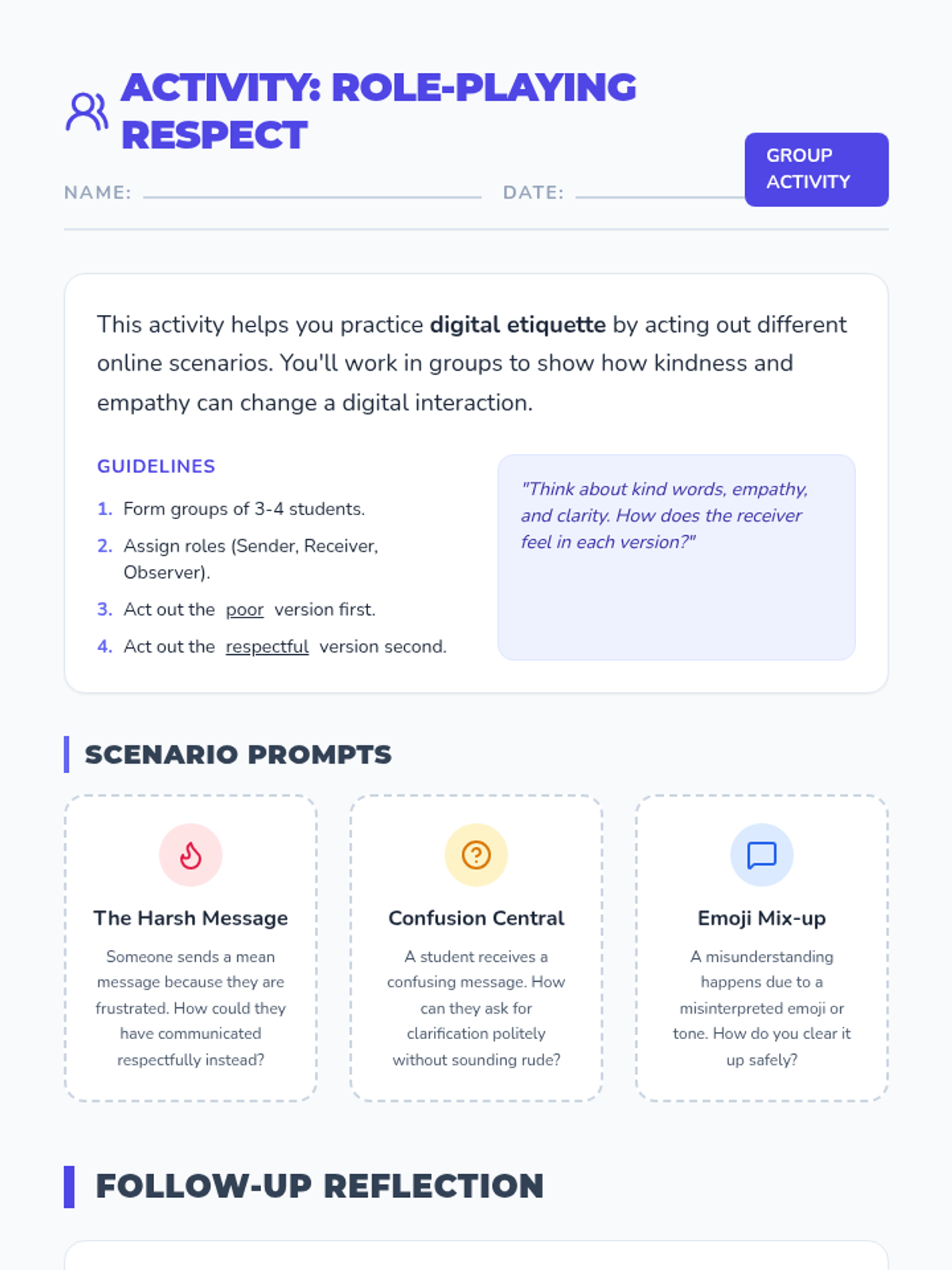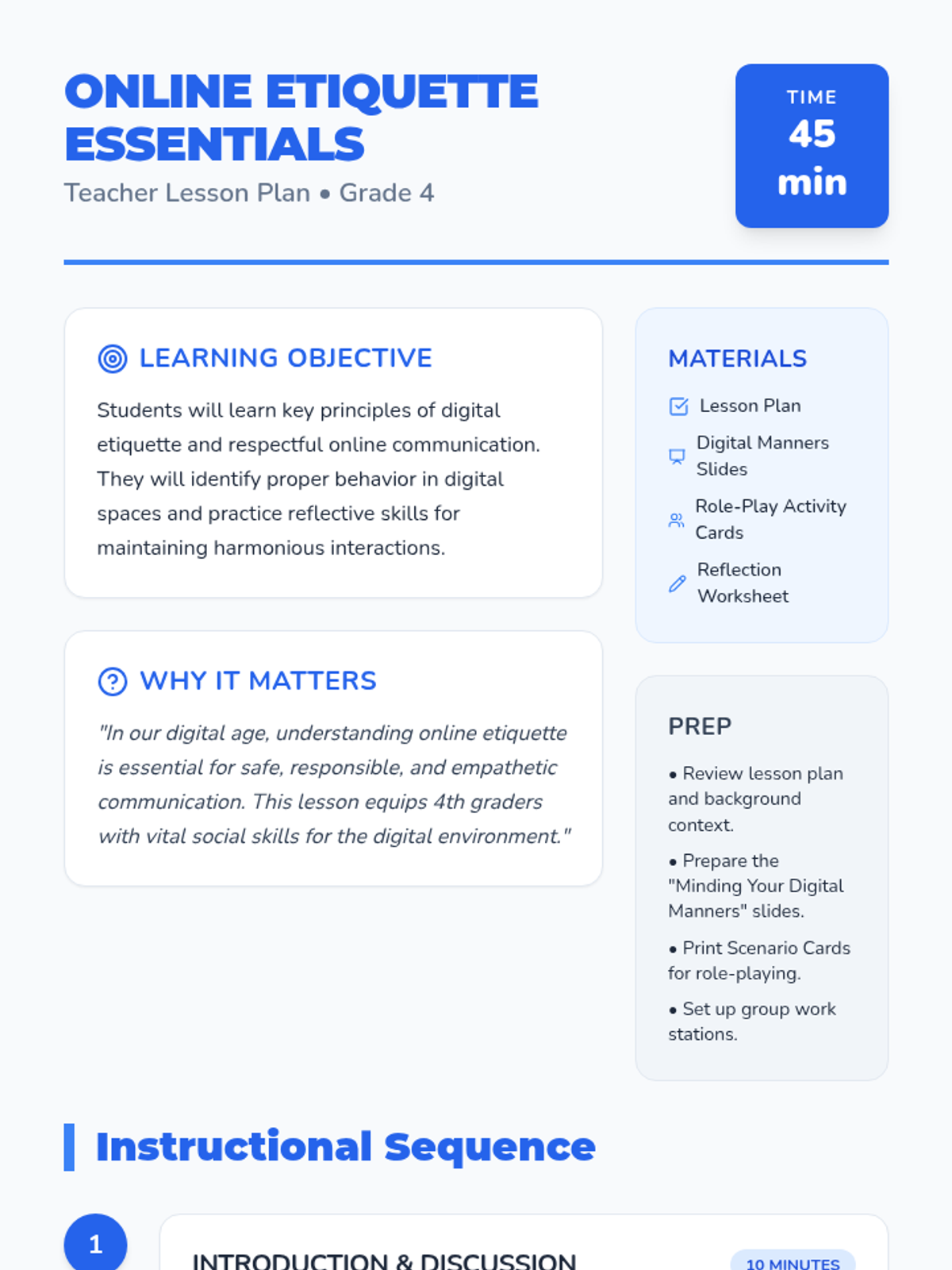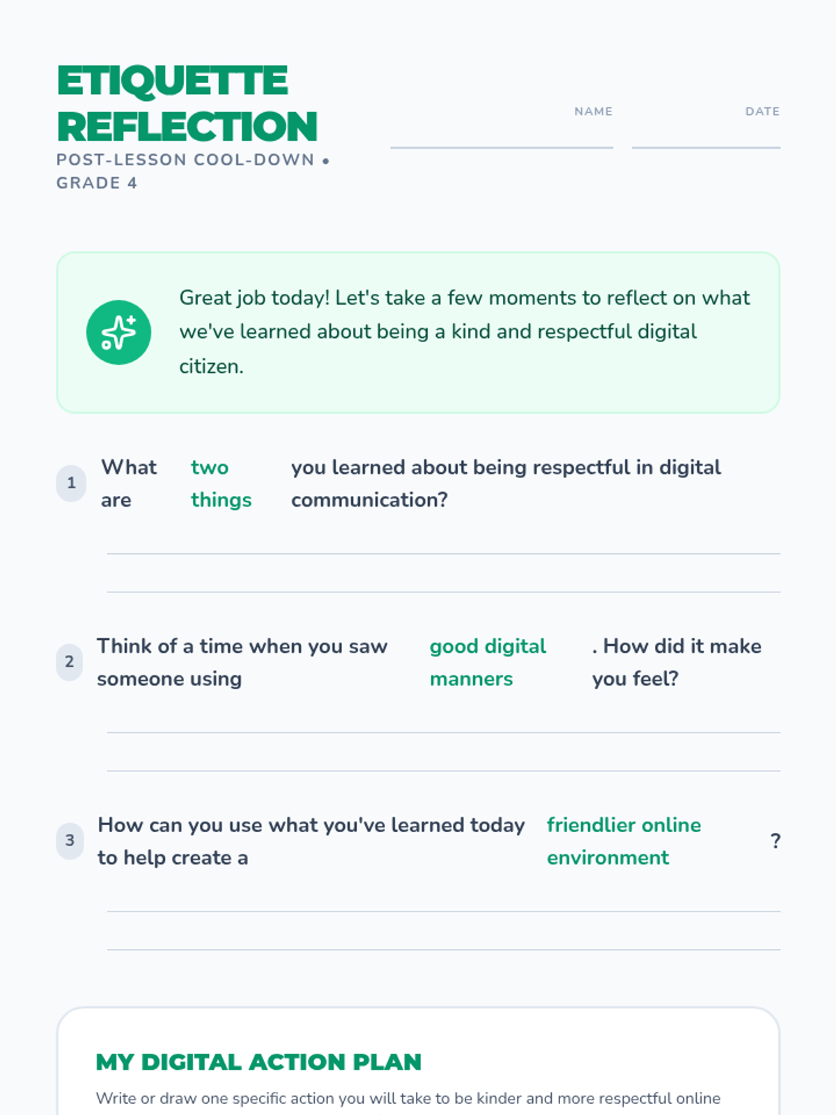 A comprehensive lesson for 4th graders on digital etiquette, focusing on respectful online communication, empathy, and the impact of digital words. Students will engage in discussions, view a slide deck, role-play scenarios, and reflect on their personal digital footprint.