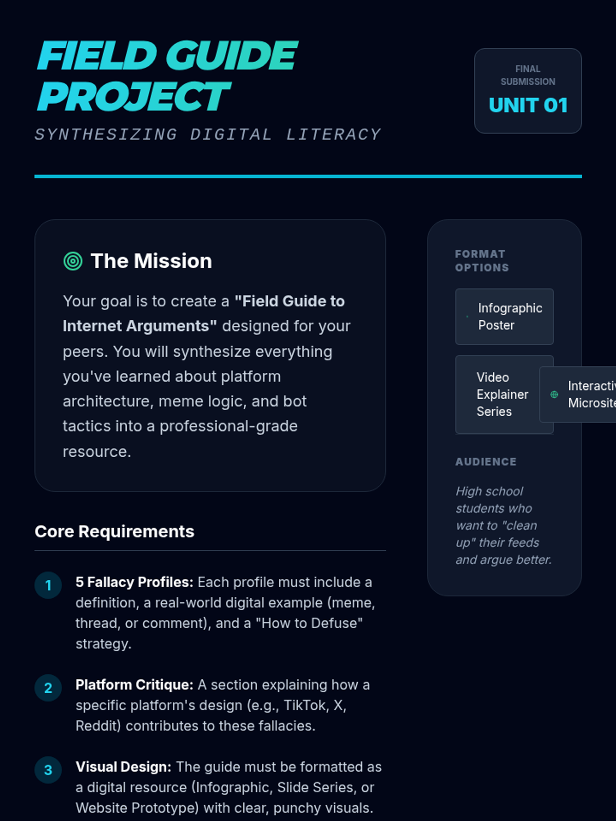 A workshop-based lesson where students synthesize their learning to create a 'Field Guide to Internet Arguments' for their peers.