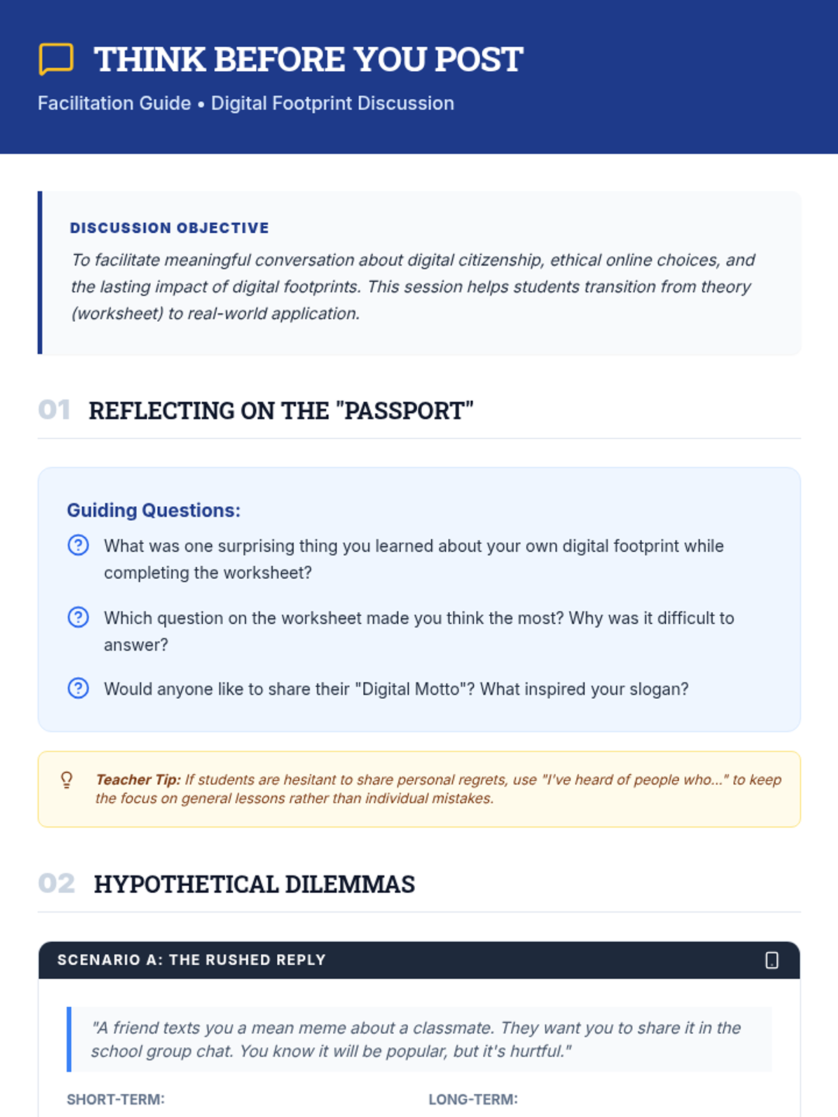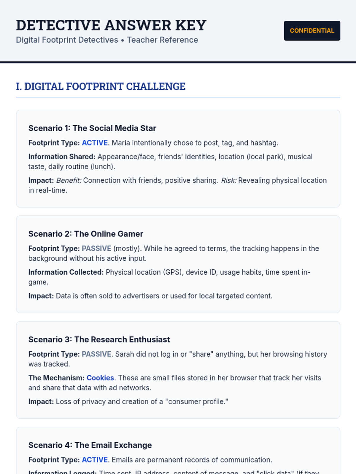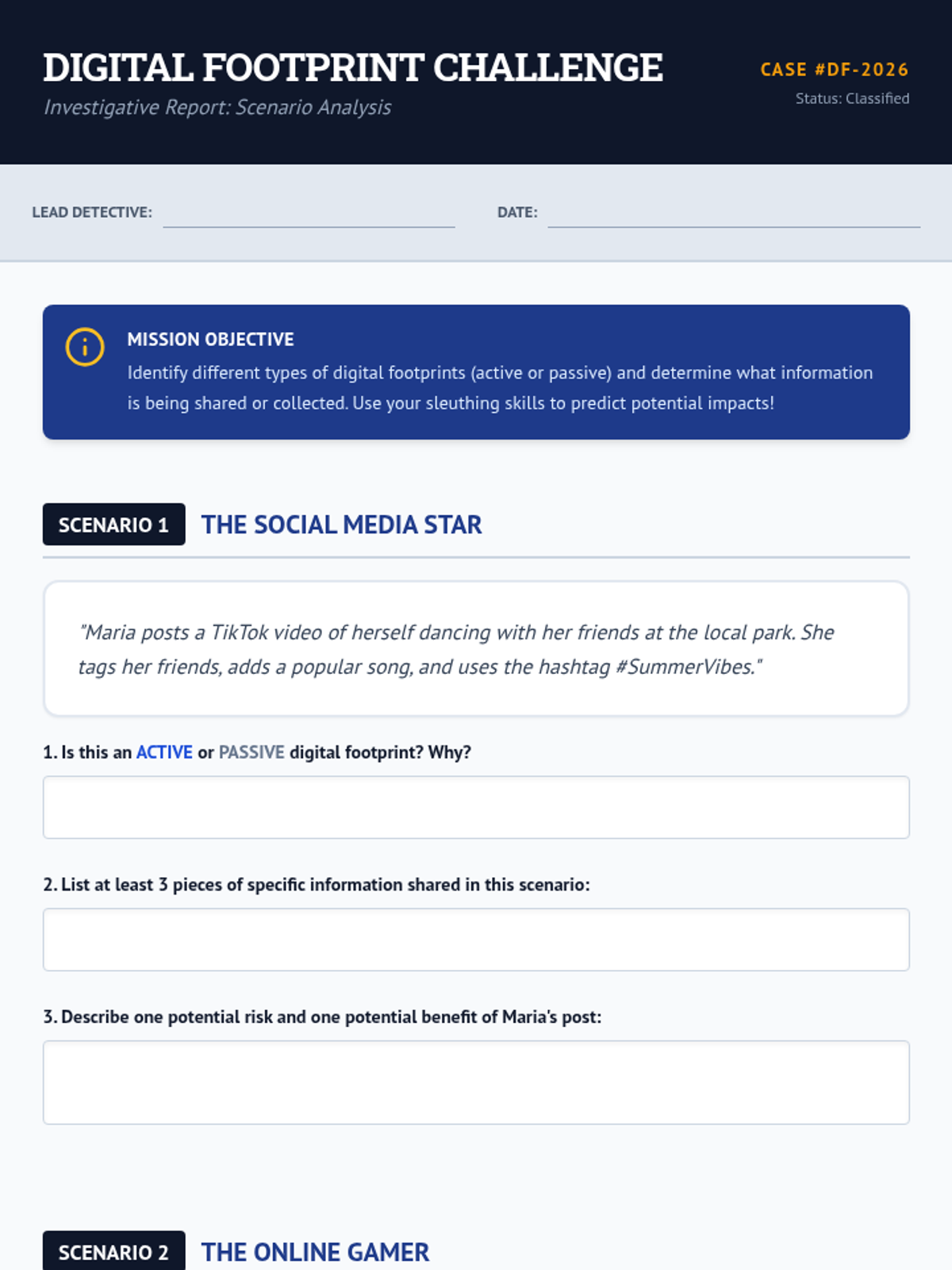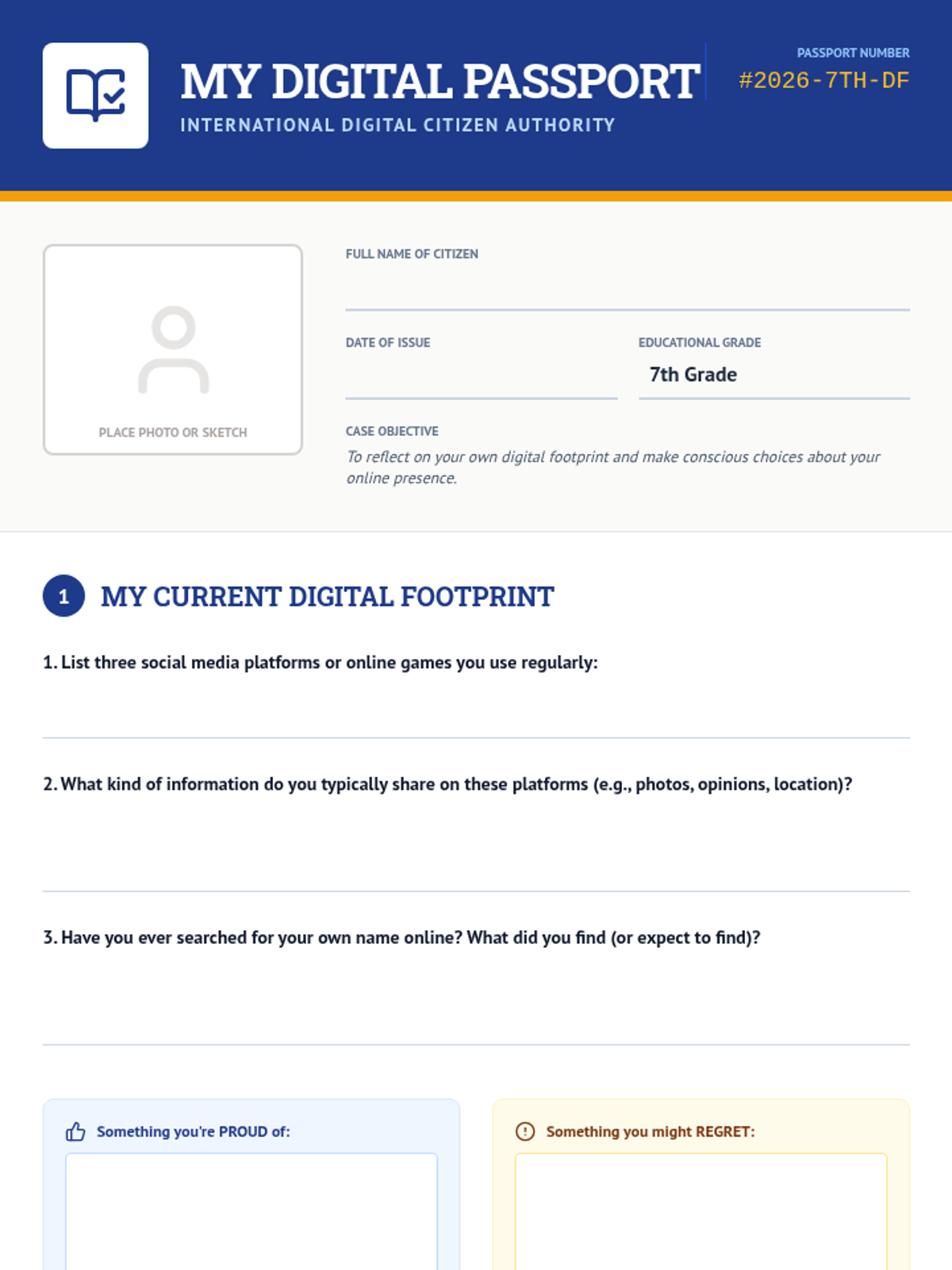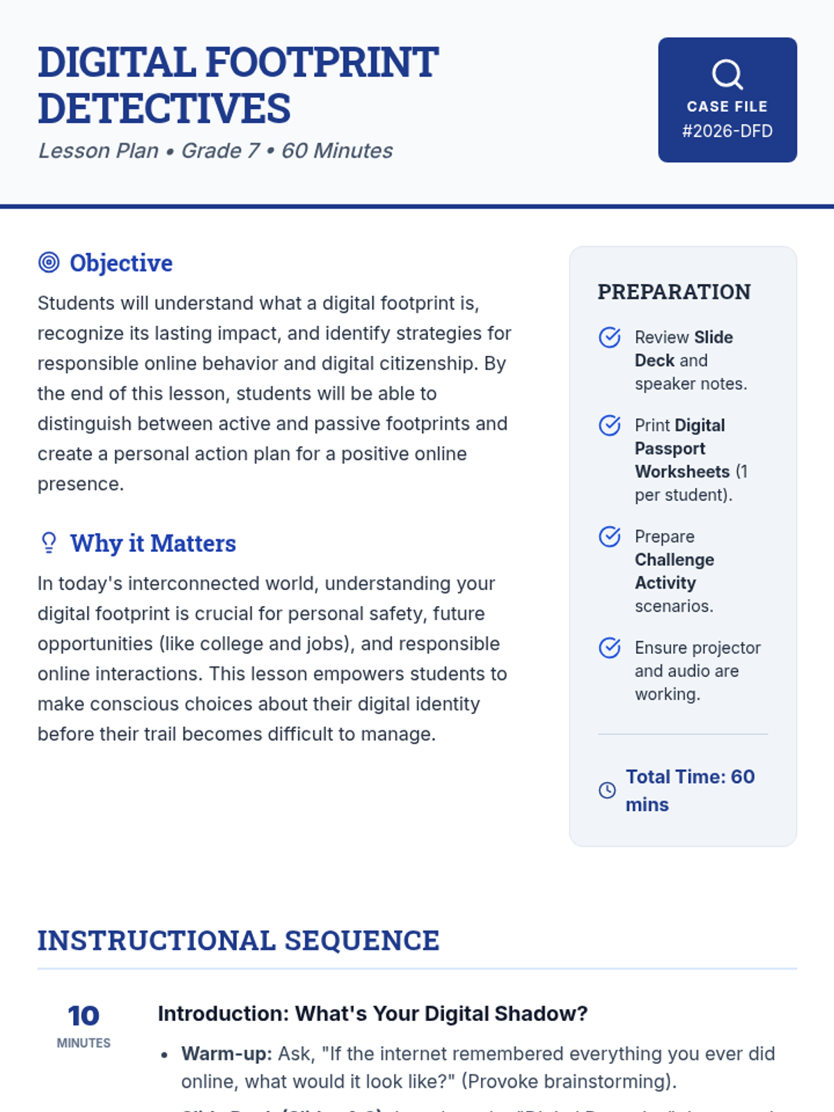 A comprehensive 60-minute lesson for 7th graders on understanding, managing, and creating a positive digital footprint. Students will explore active and passive data trails, analyze real-world scenarios, and reflect on their own online identity through interactive activities and discussions.