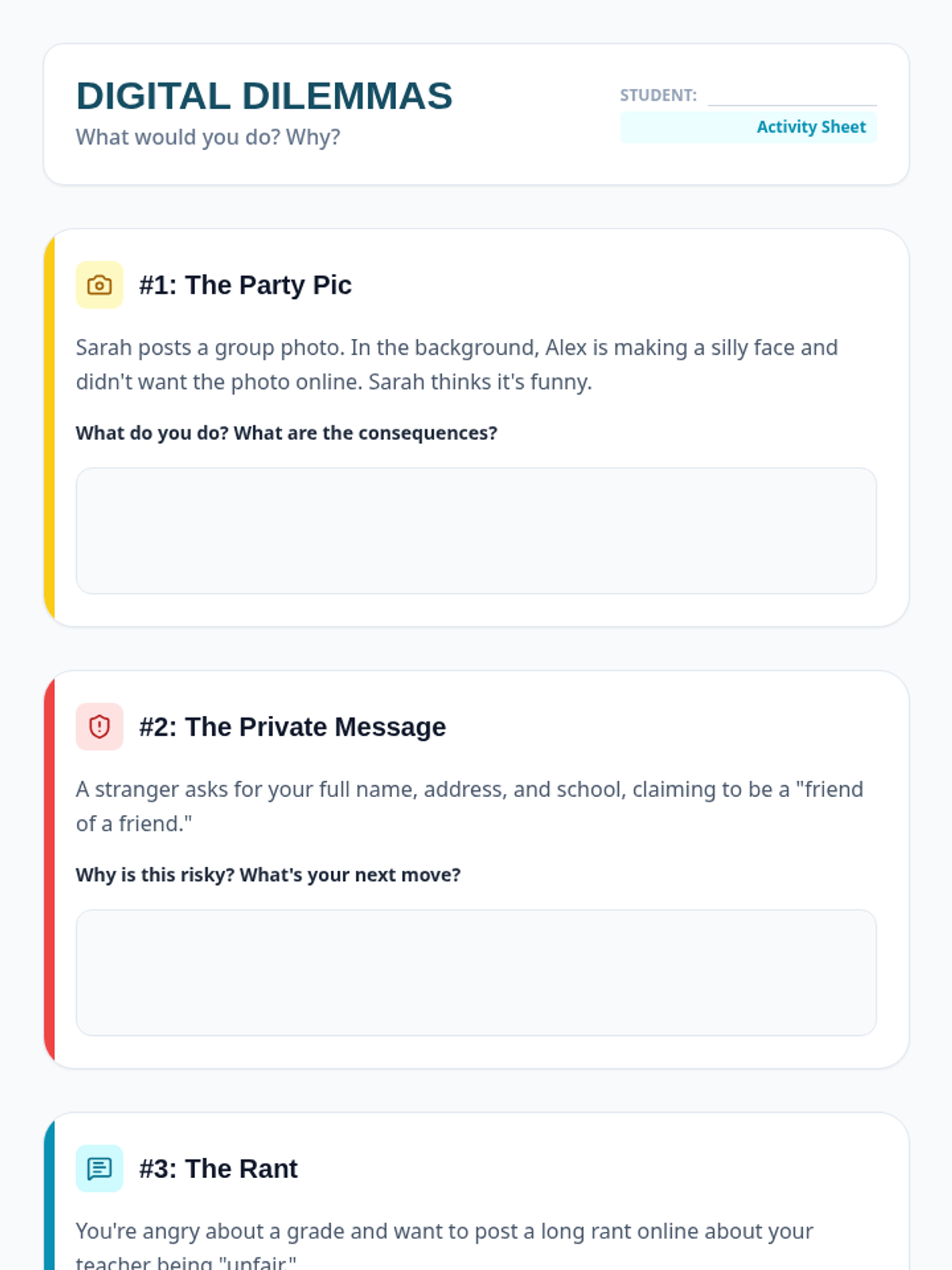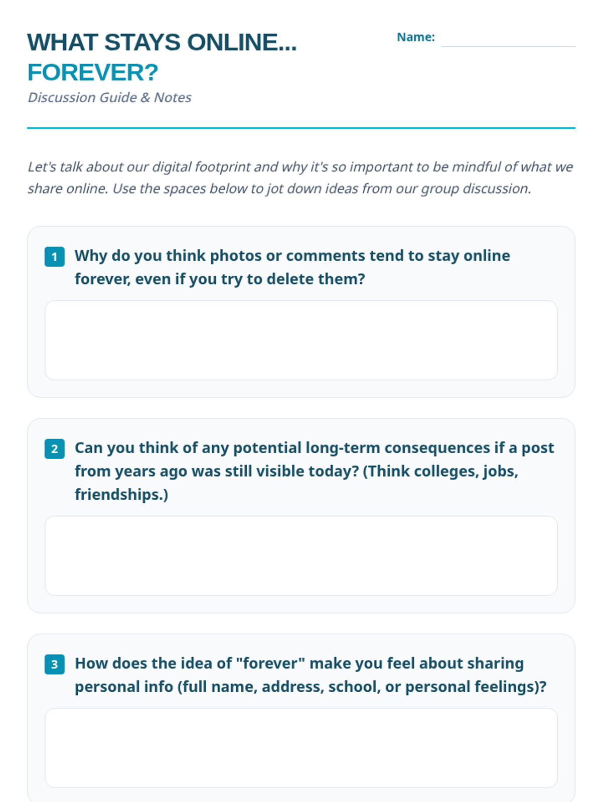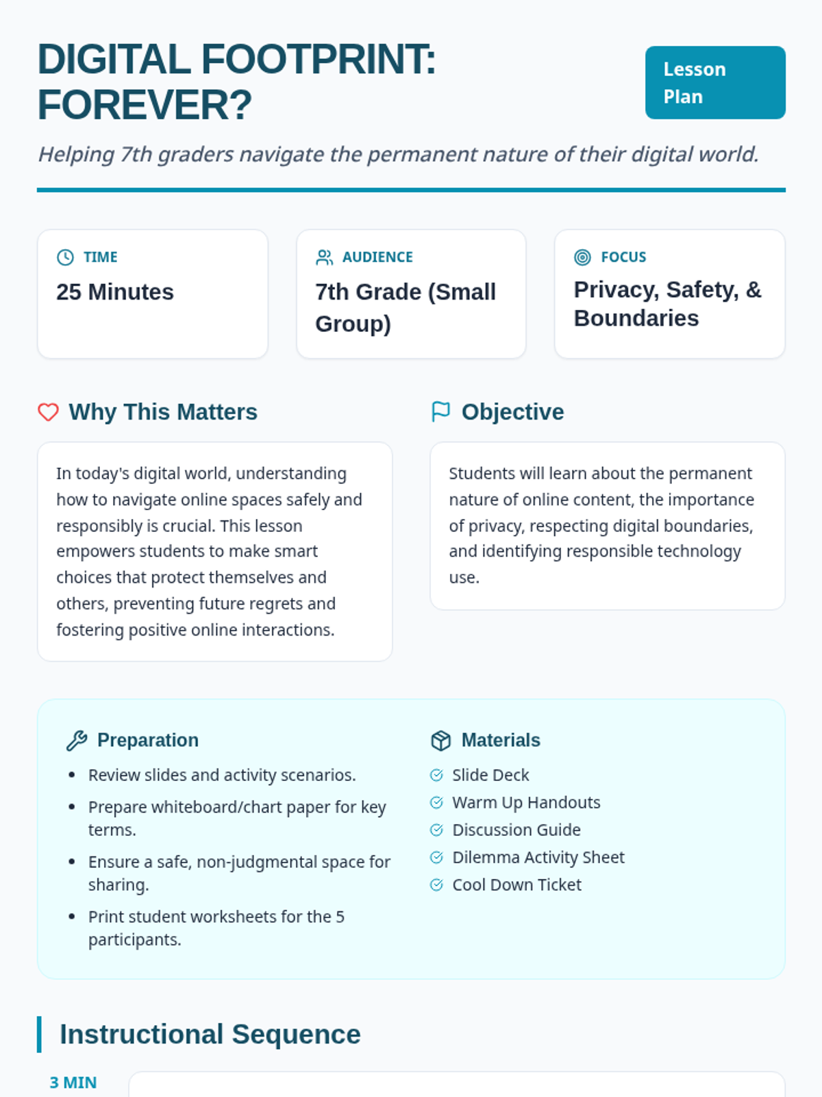 A 25-minute small group counseling lesson for 7th graders focusing on the permanence of digital footprints, online safety, and respecting boundaries.