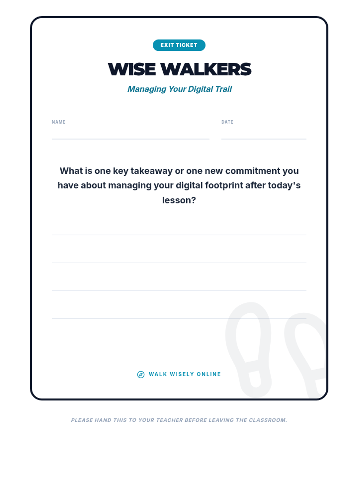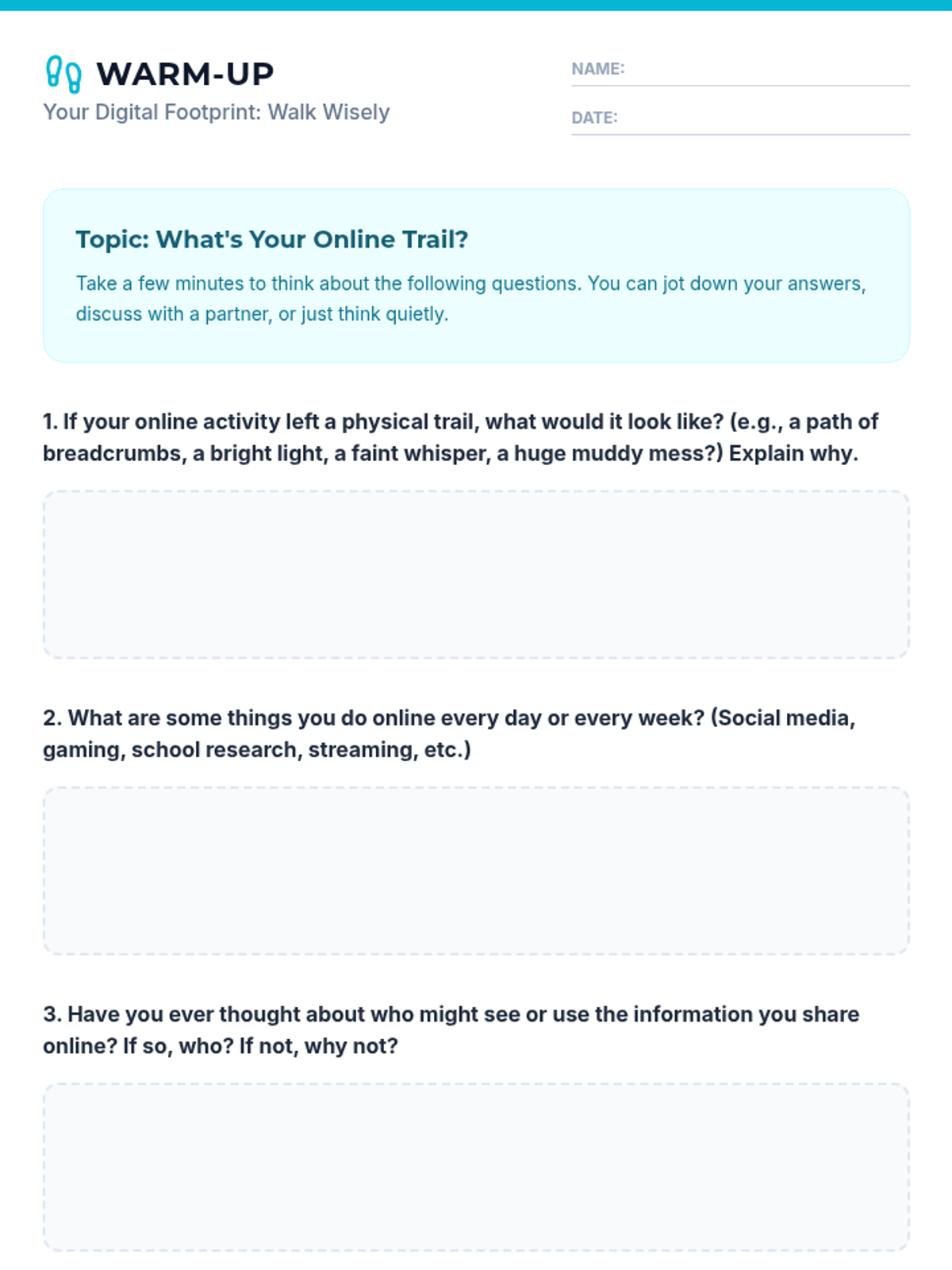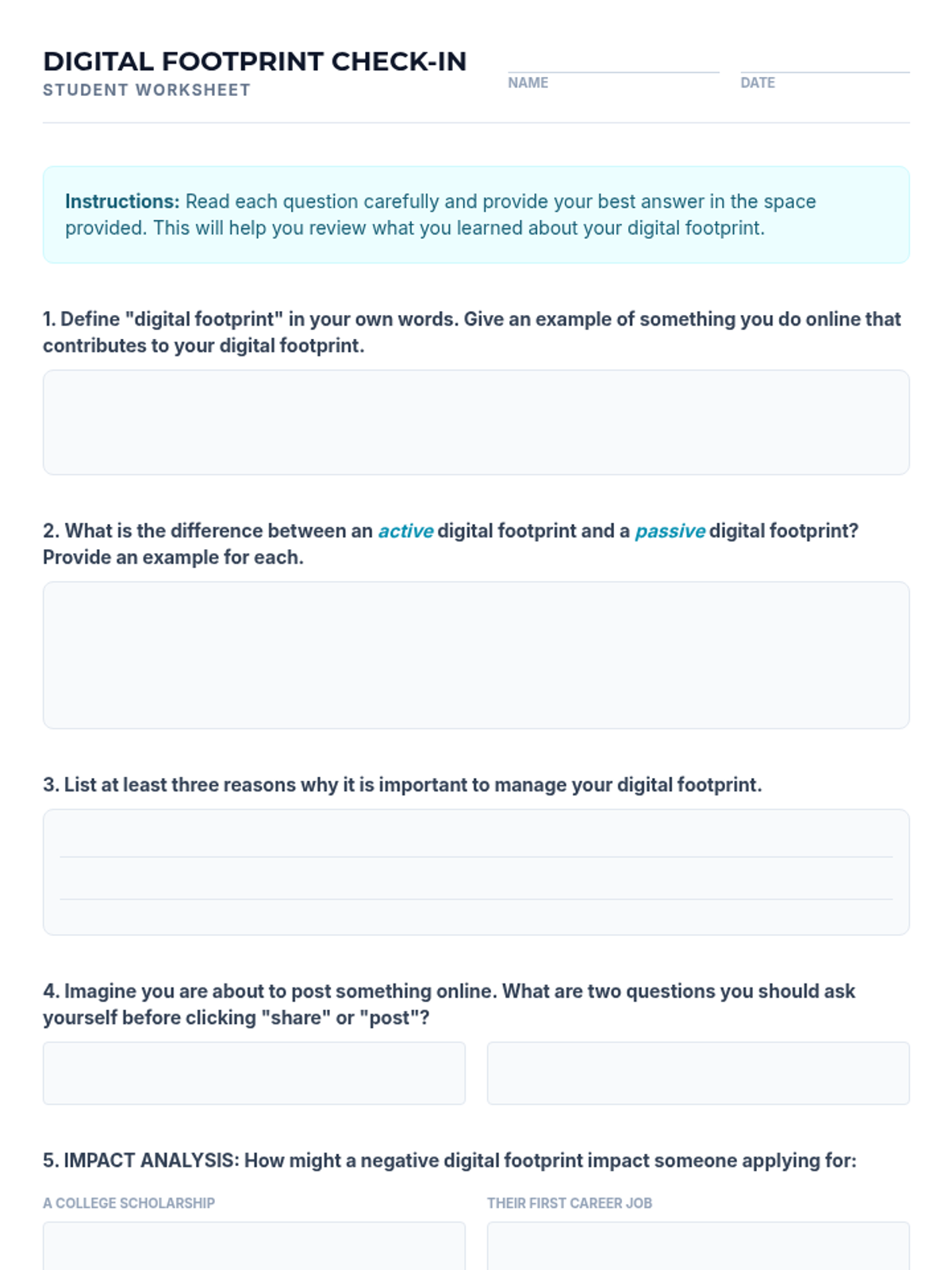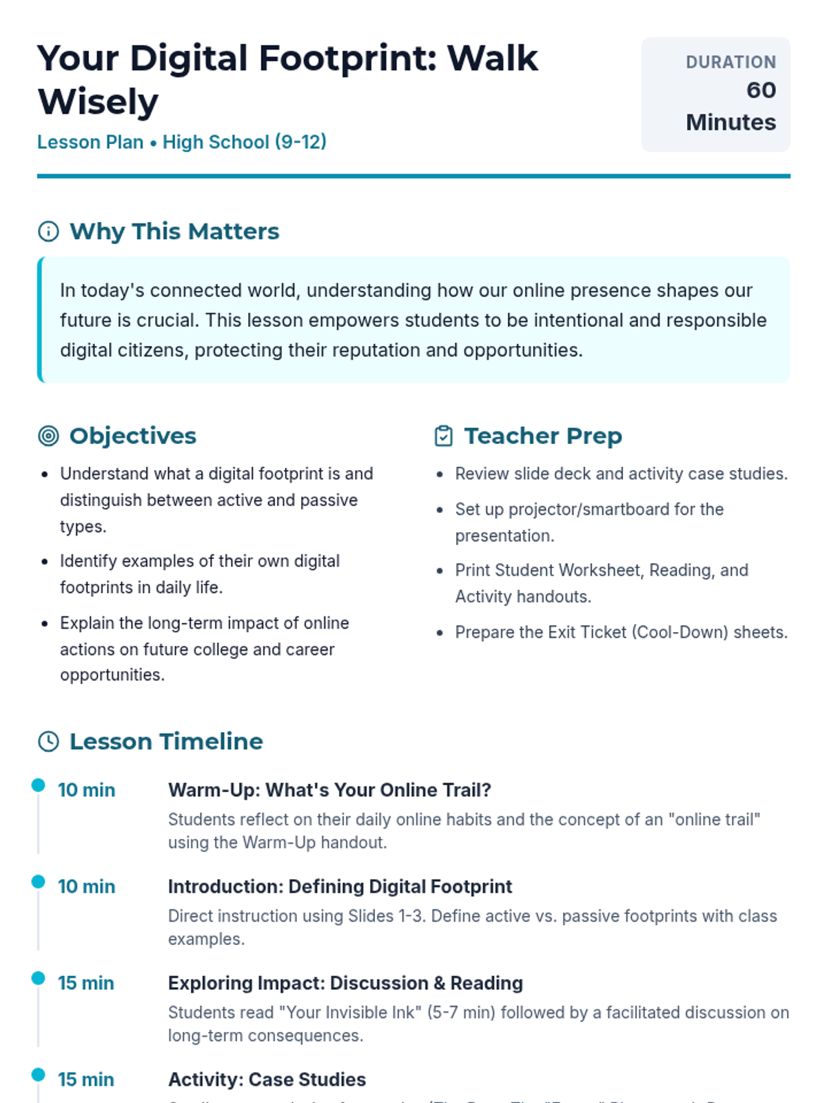 A comprehensive 60-minute lesson for high school students about digital footprints, active vs. passive data collection, and long-term consequences of online behavior.