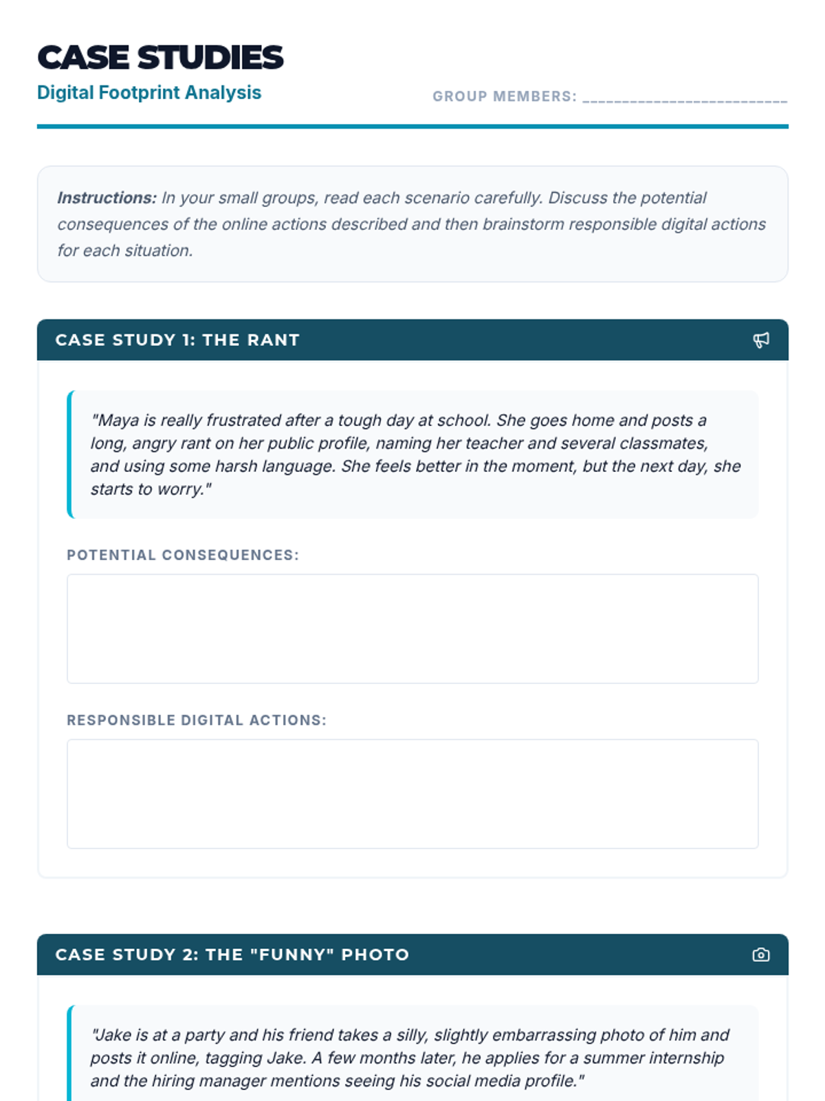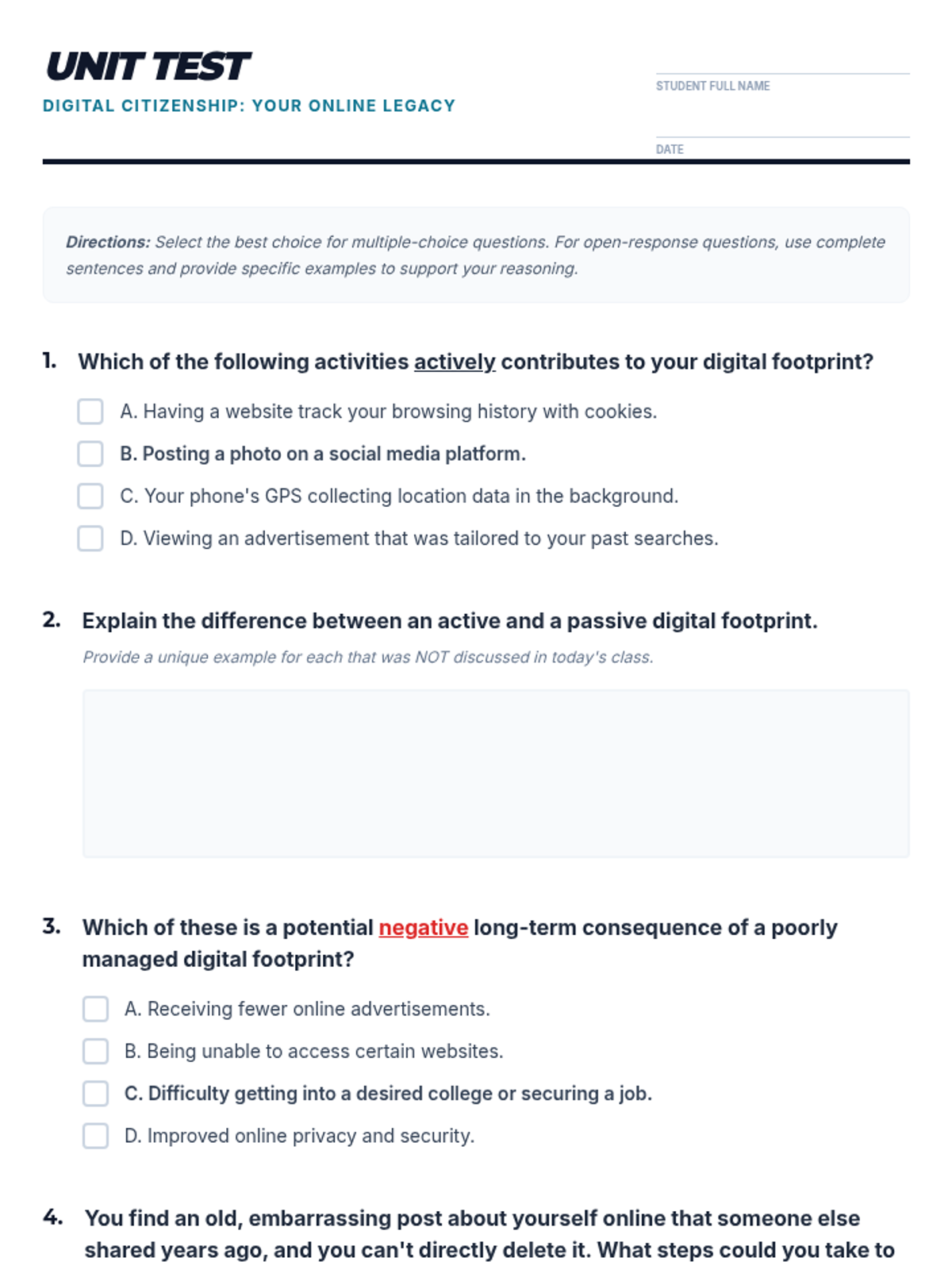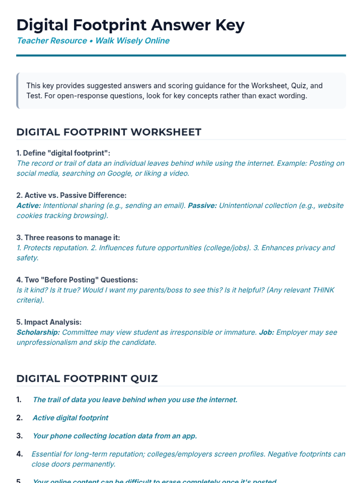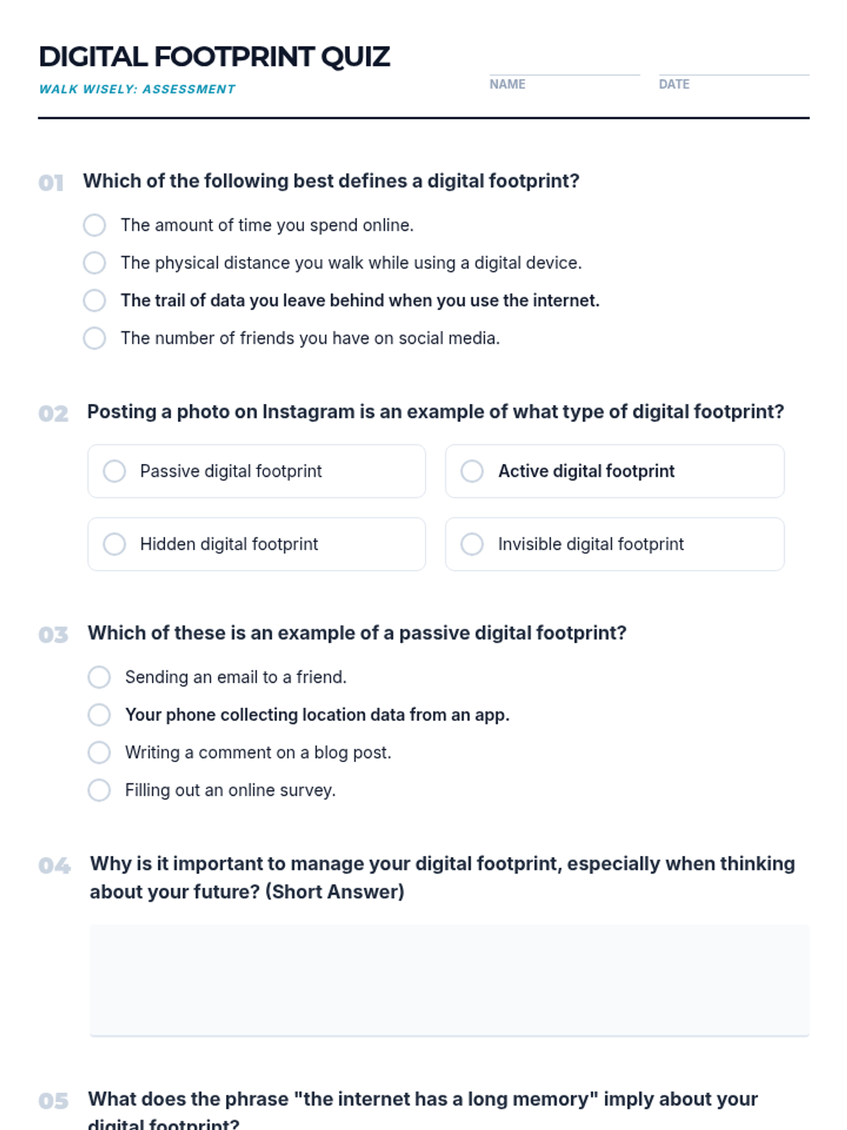 A comprehensive 60-minute lesson for high school students about digital footprints, active vs. passive data collection, and long-term consequences of online behavior.