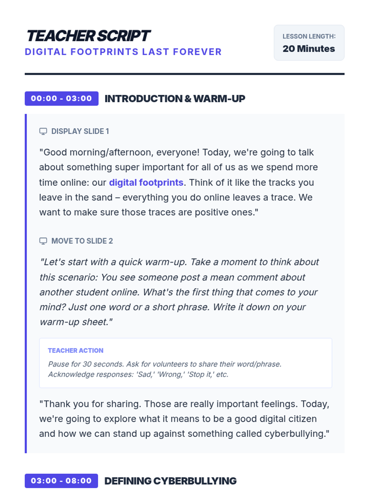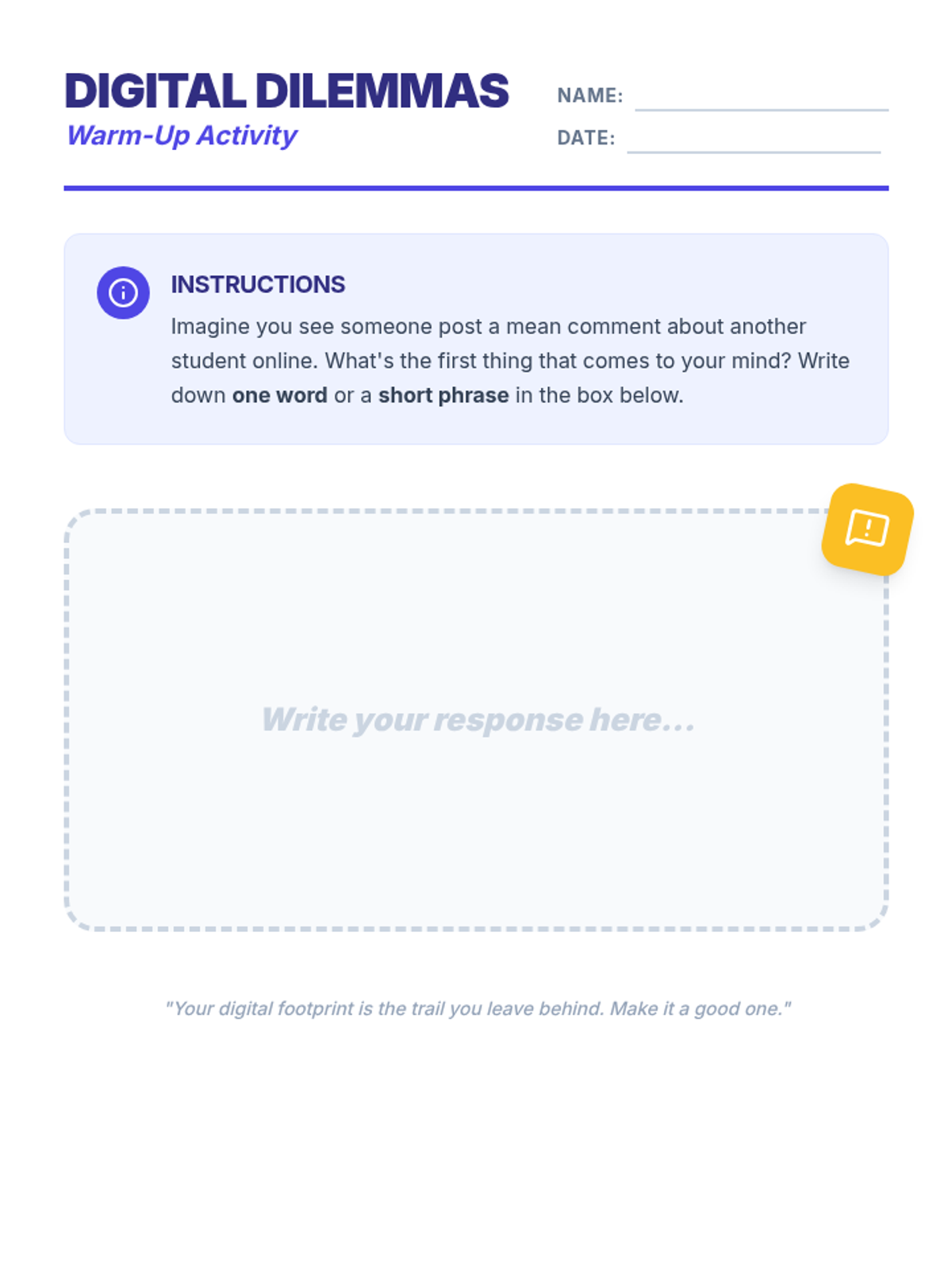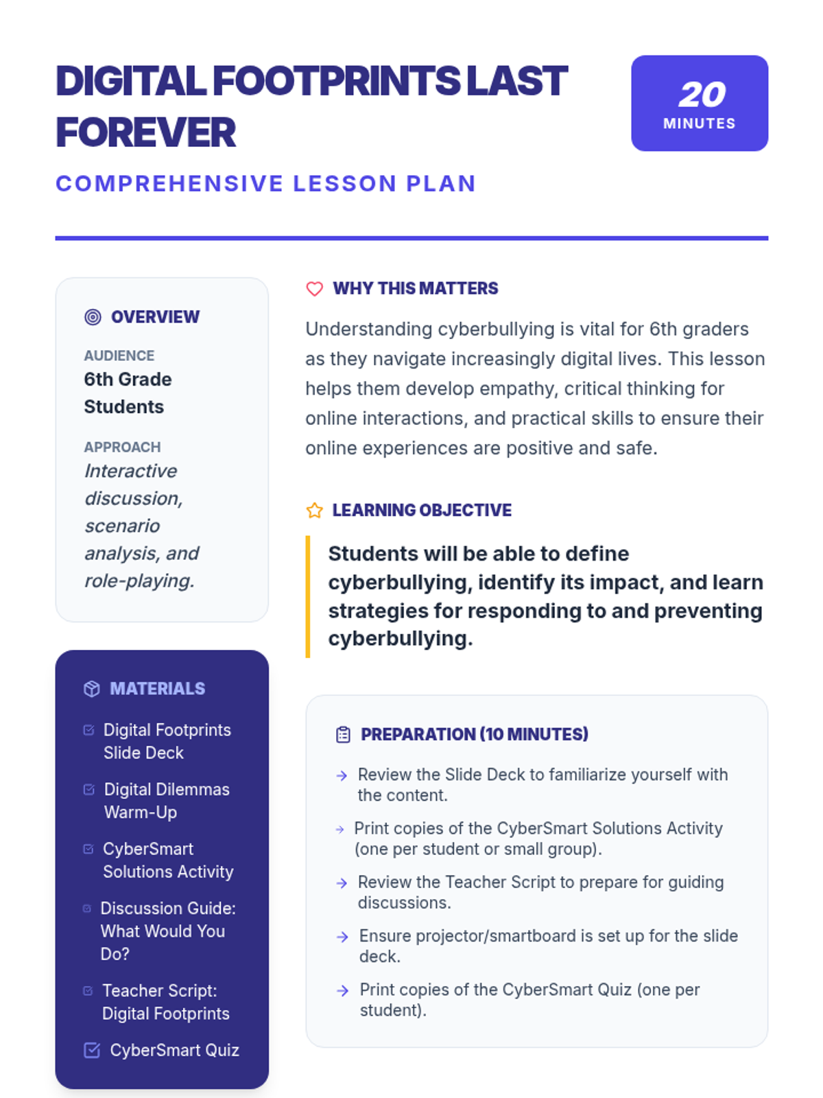 A 20-minute lesson for 6th graders exploring the permanence of digital footprints and strategies to combat cyberbullying. Students learn to be upstanders and cultivate a positive online presence through scenario analysis and discussion.