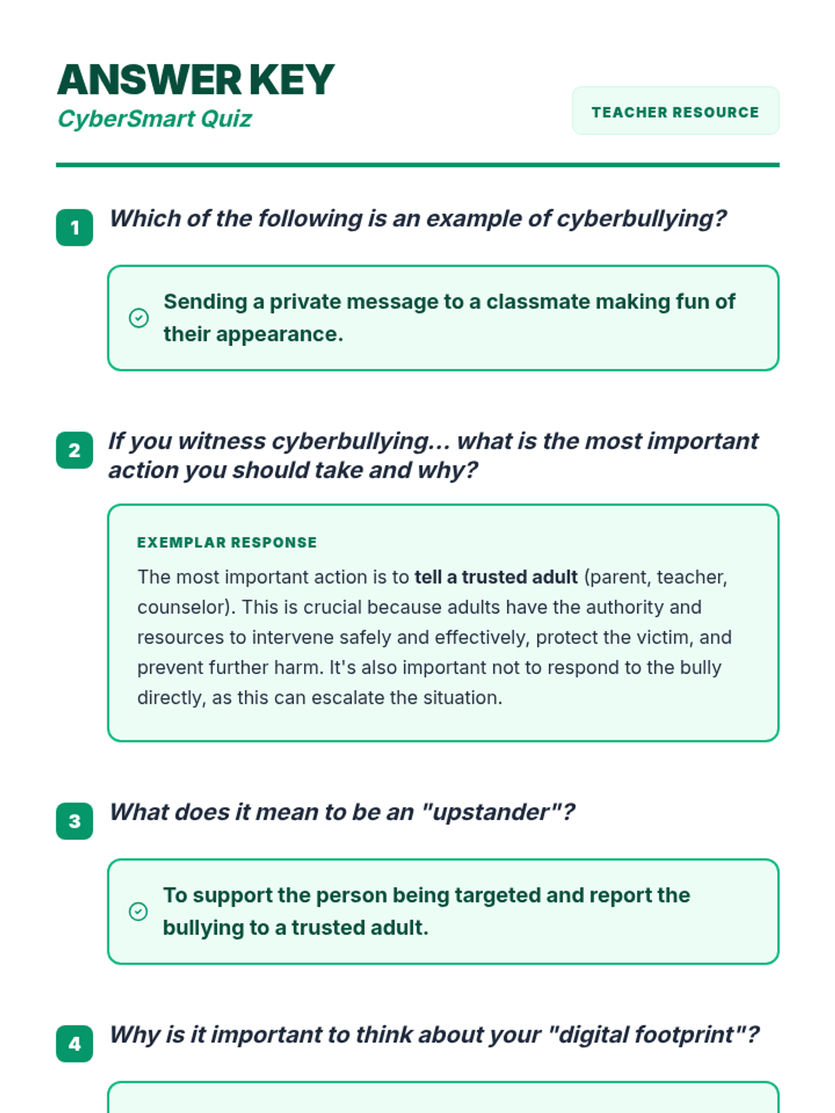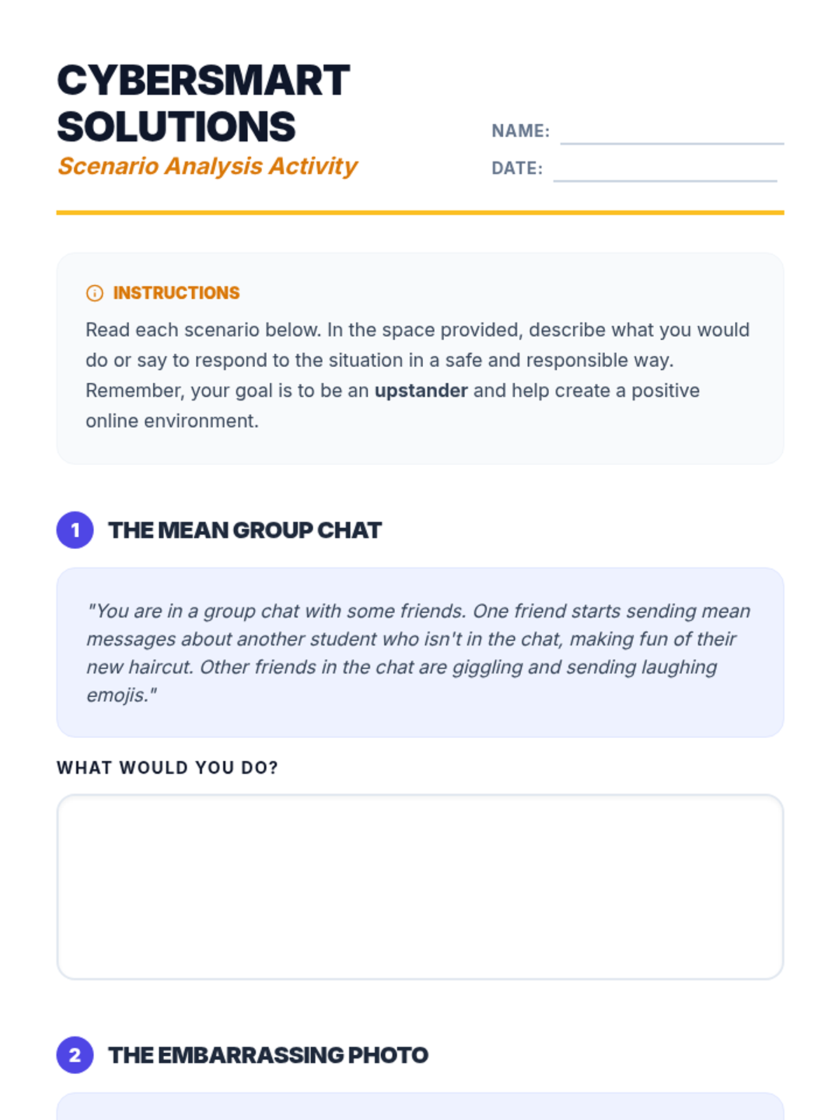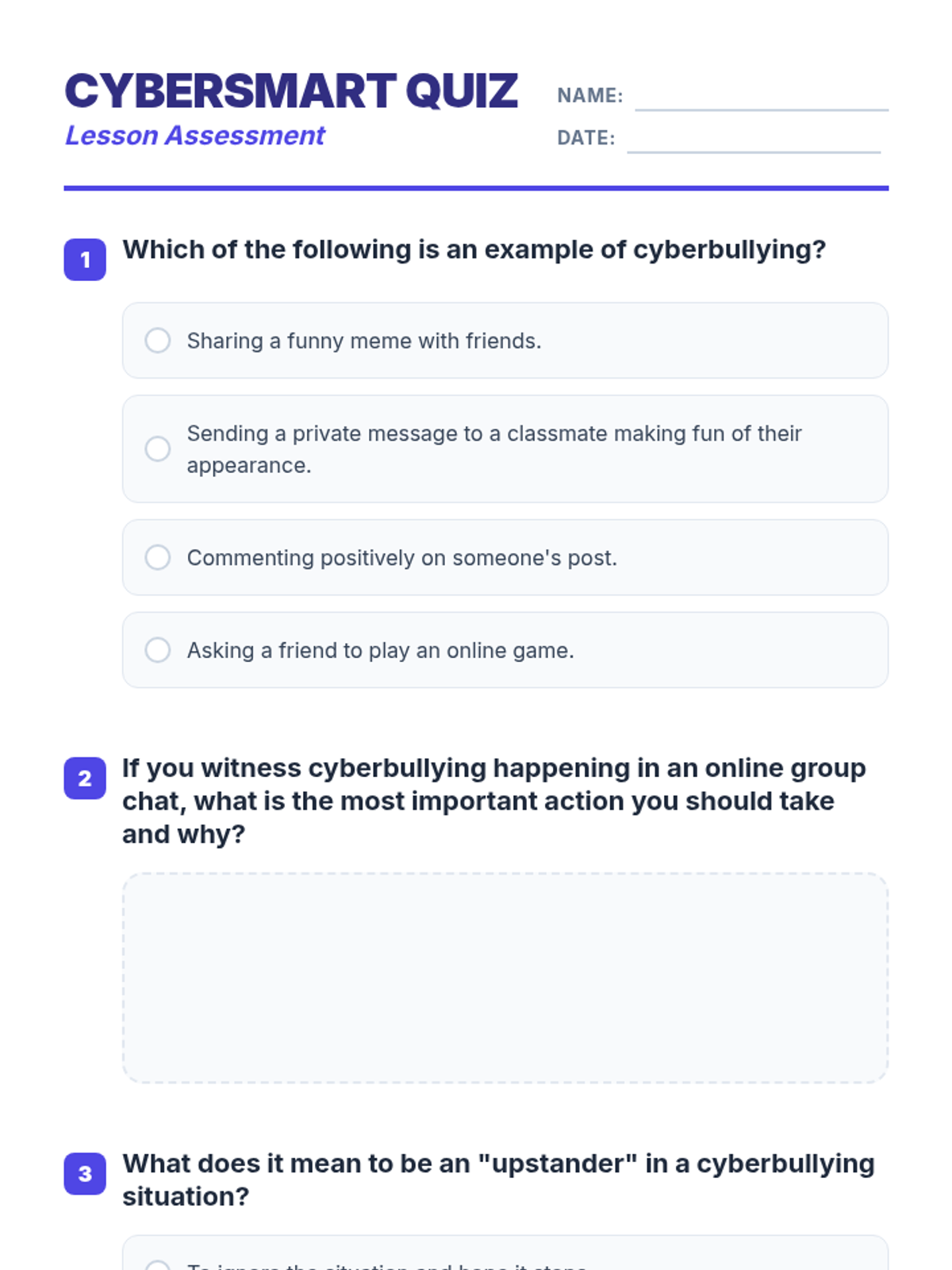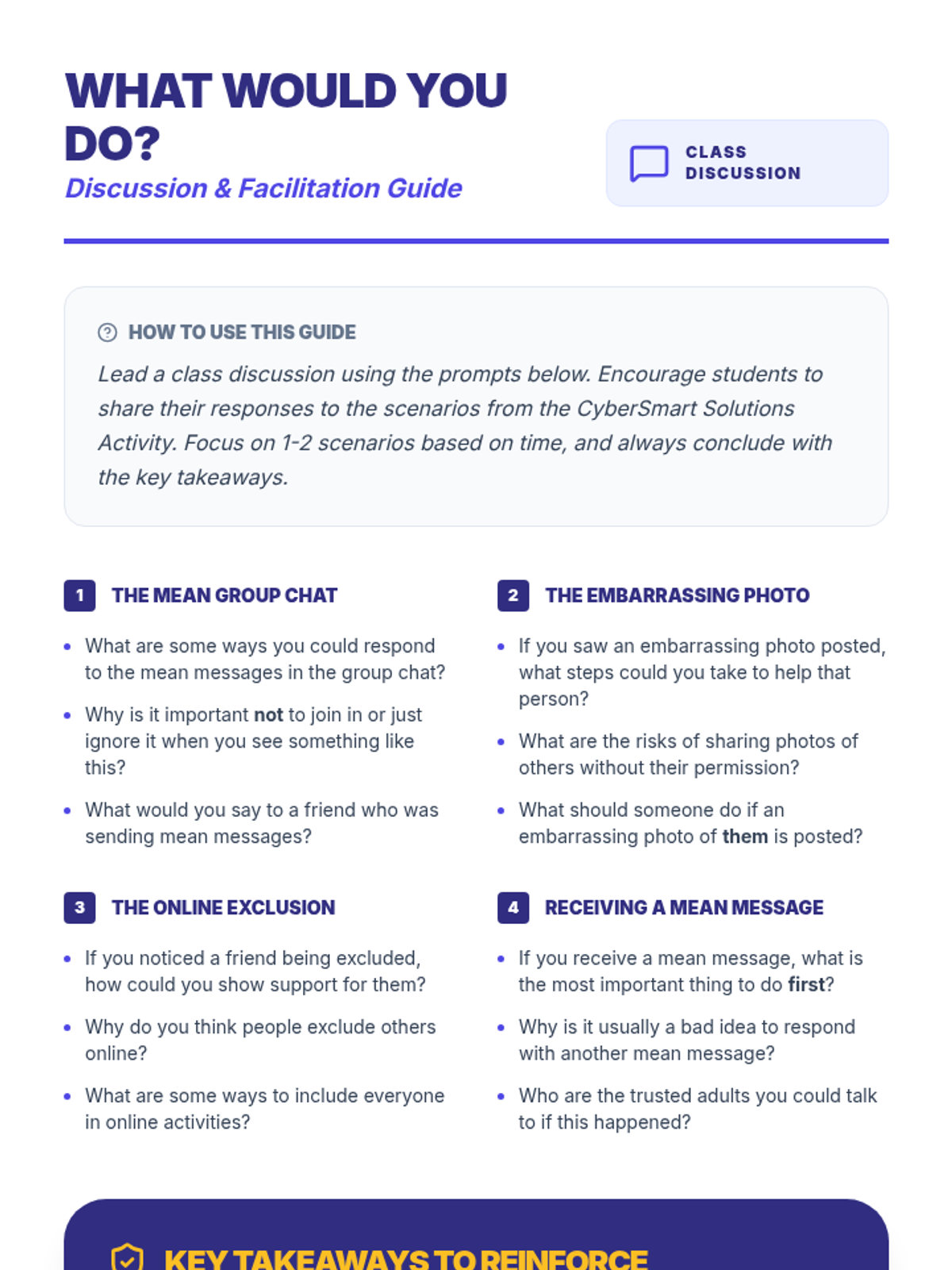 A 20-minute lesson for 6th graders exploring the permanence of digital footprints and strategies to combat cyberbullying. Students learn to be upstanders and cultivate a positive online presence through scenario analysis and discussion.