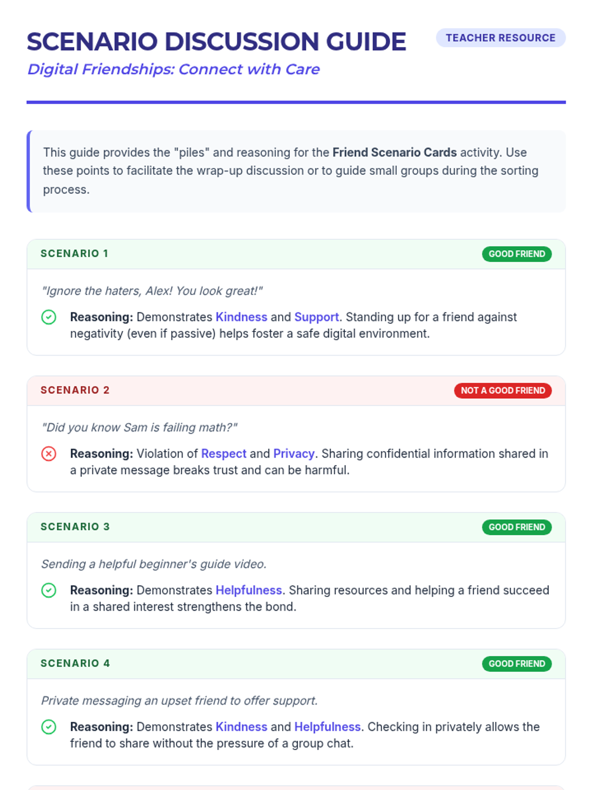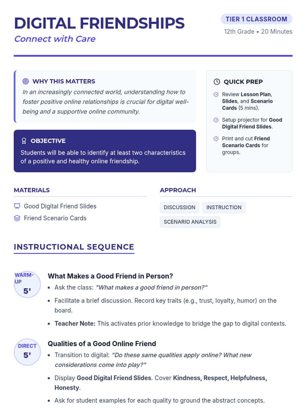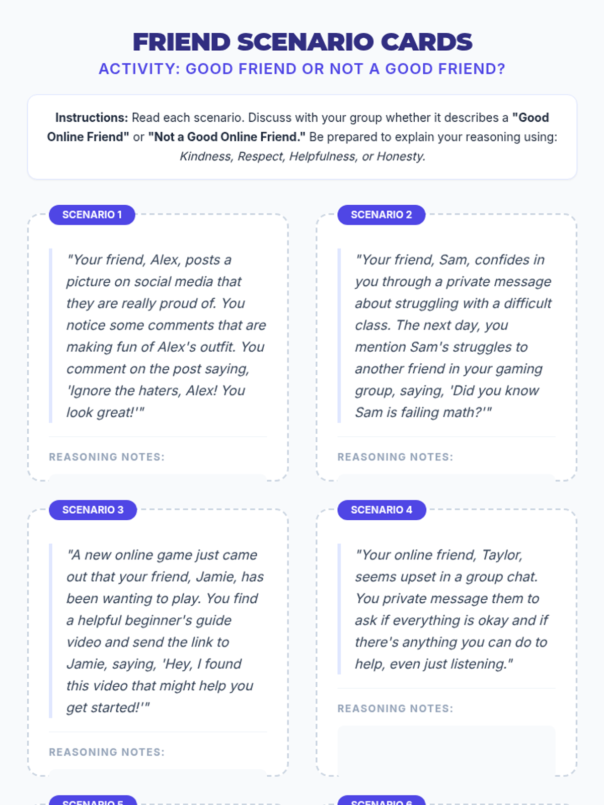 A 20-minute lesson for 12th graders focusing on the characteristics of healthy online friendships, including kindness, respect, helpfulness, and honesty. Students will analyze real-world scenarios to identify positive digital connection traits.