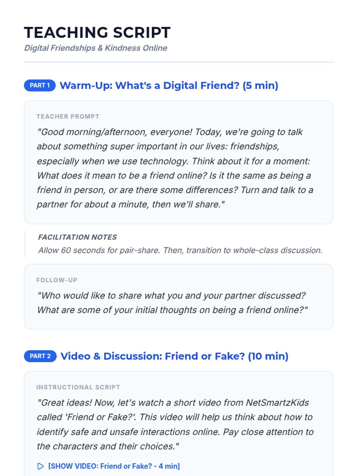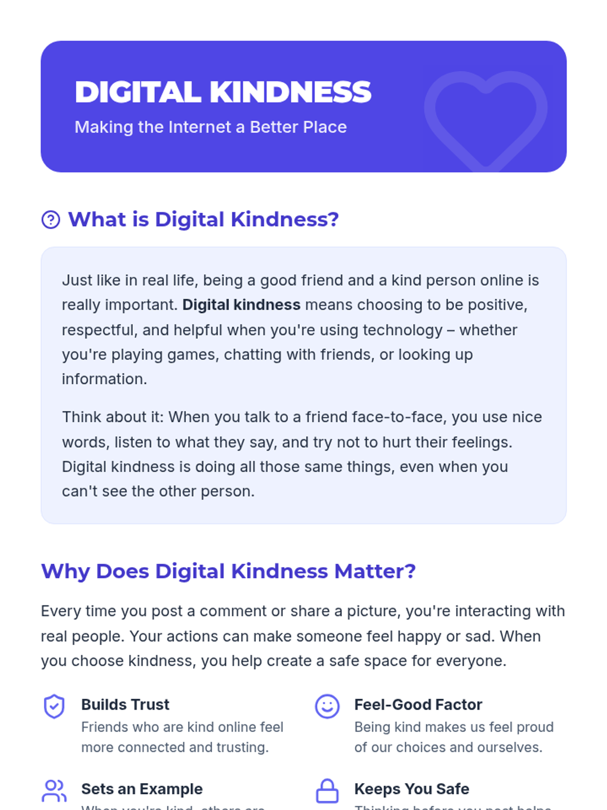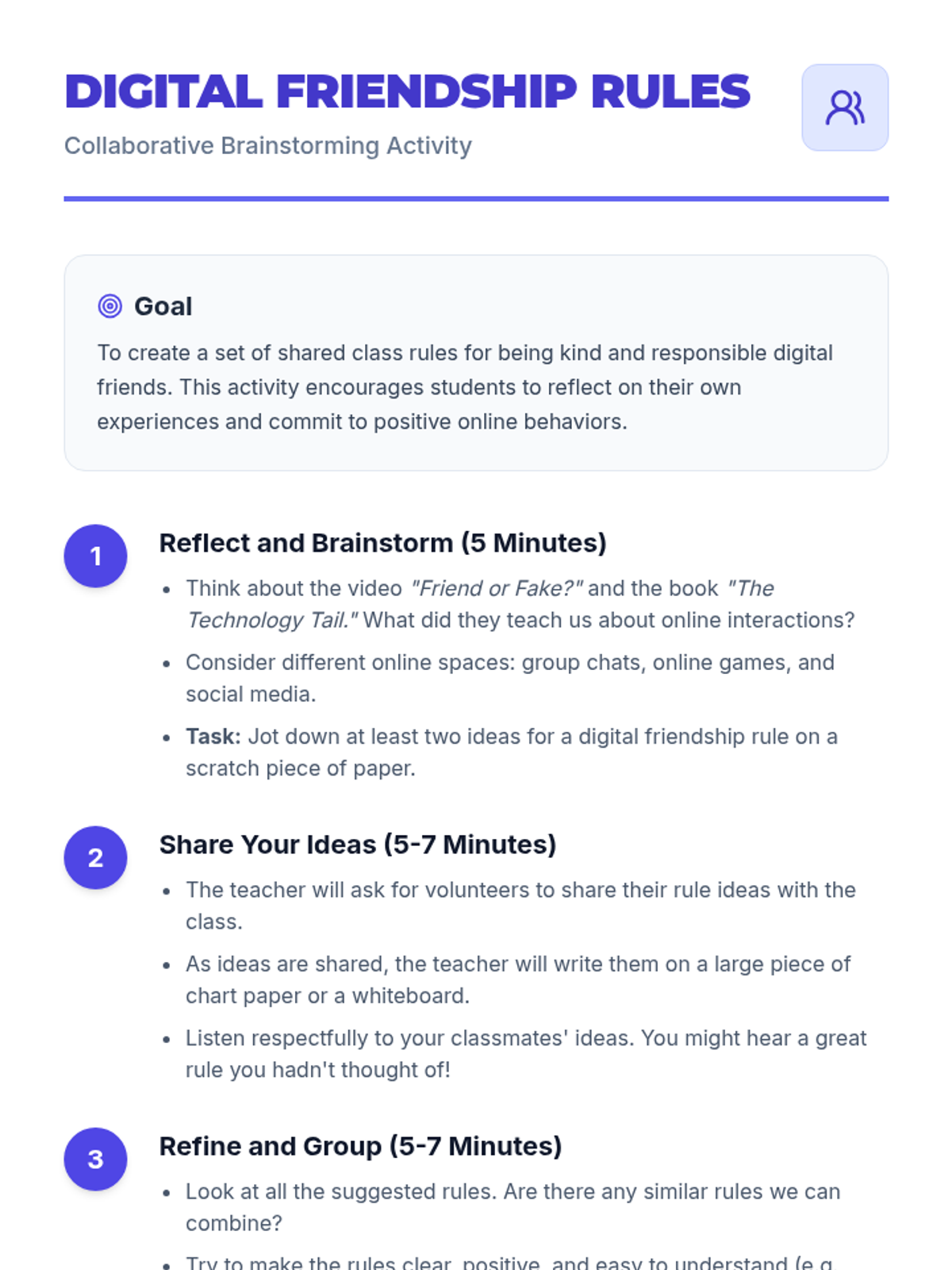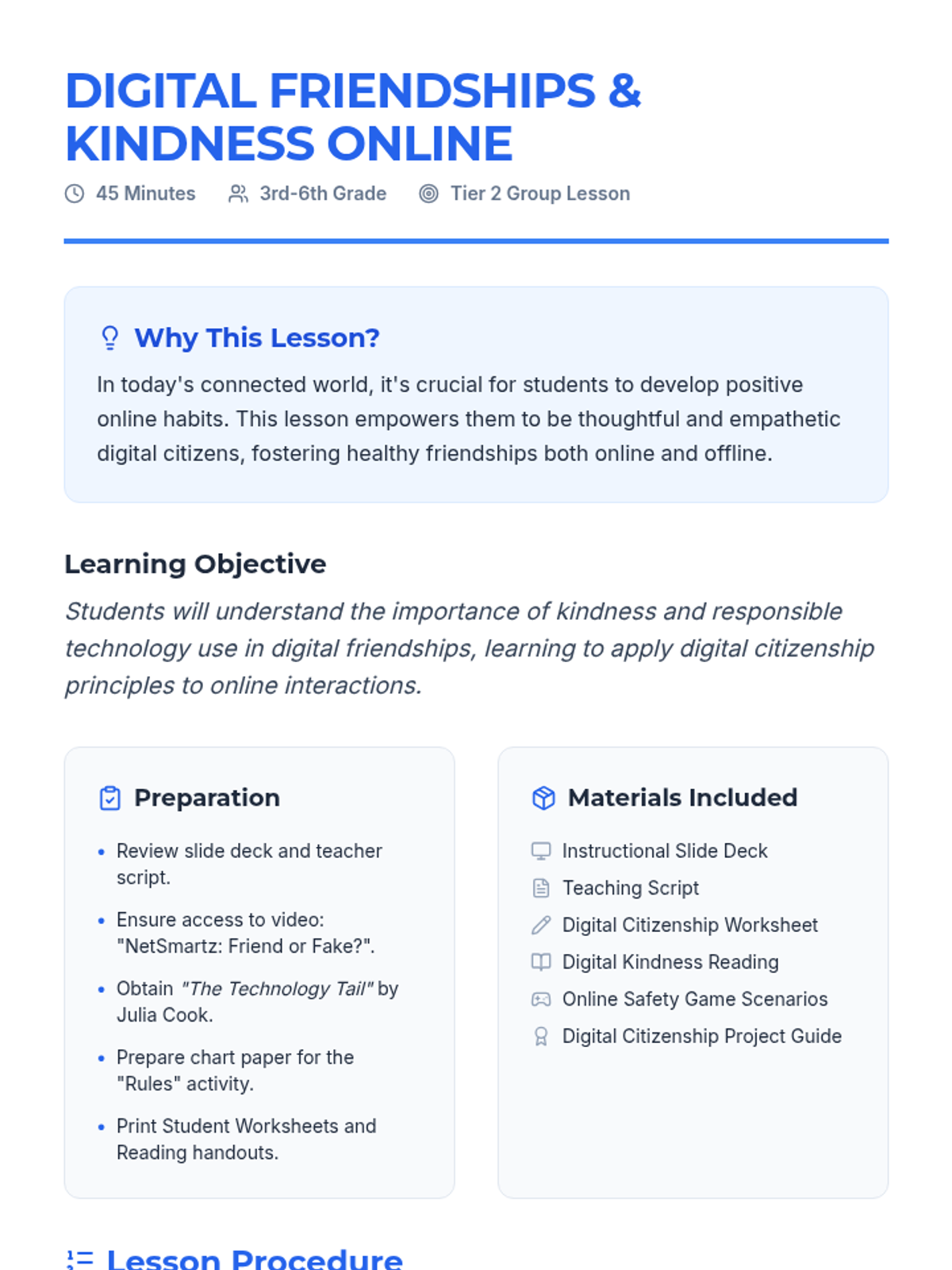 A 45-minute lesson for 3rd-6th graders on navigating digital friendships with kindness and responsibility, covering digital footprints and online safety.
