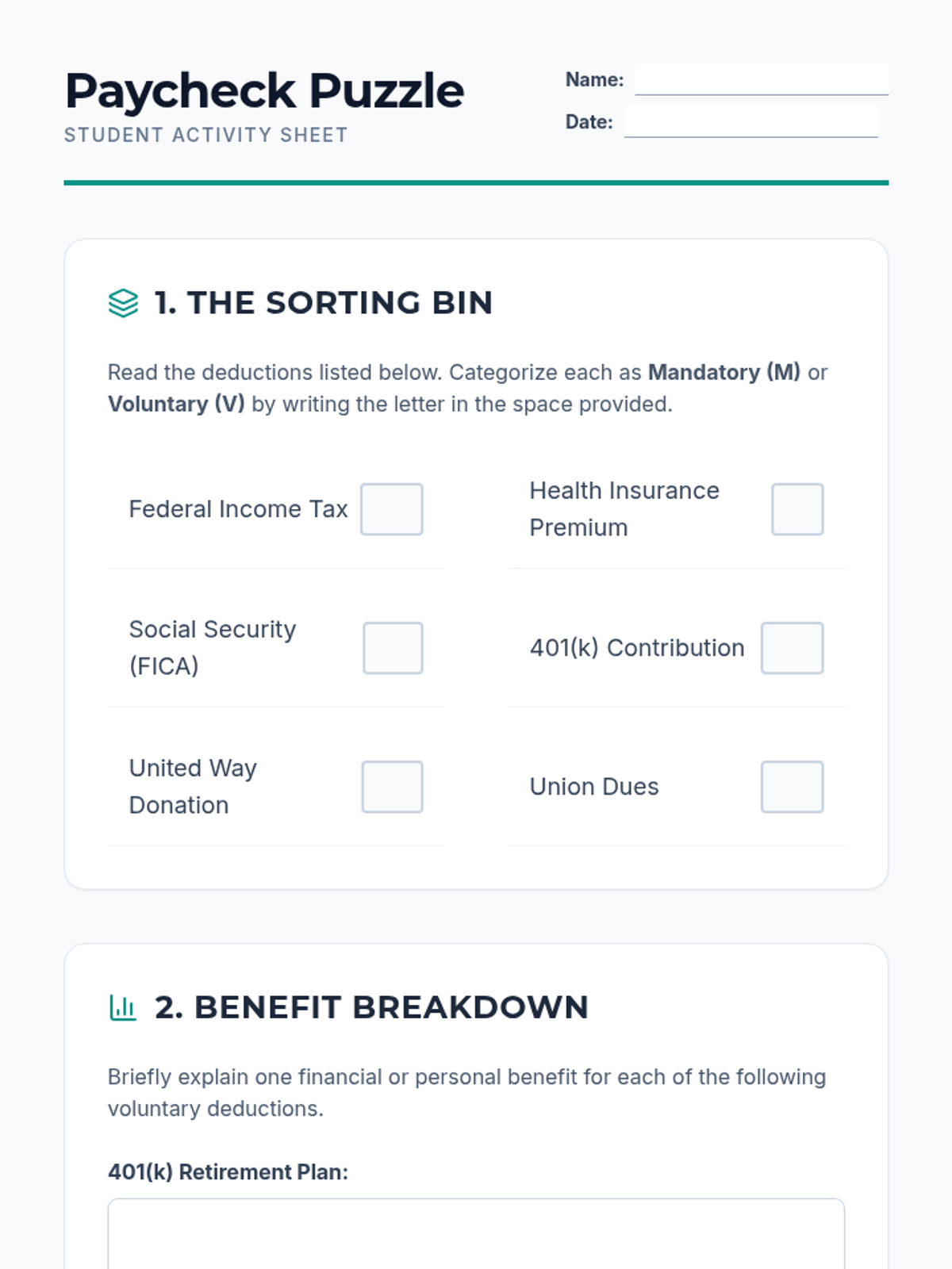 A practical deep dive into personal budgeting for high school students. They'll navigate a $1,200 monthly income scenario, distinguish between needs and wants, and learn the foundations of credit building.