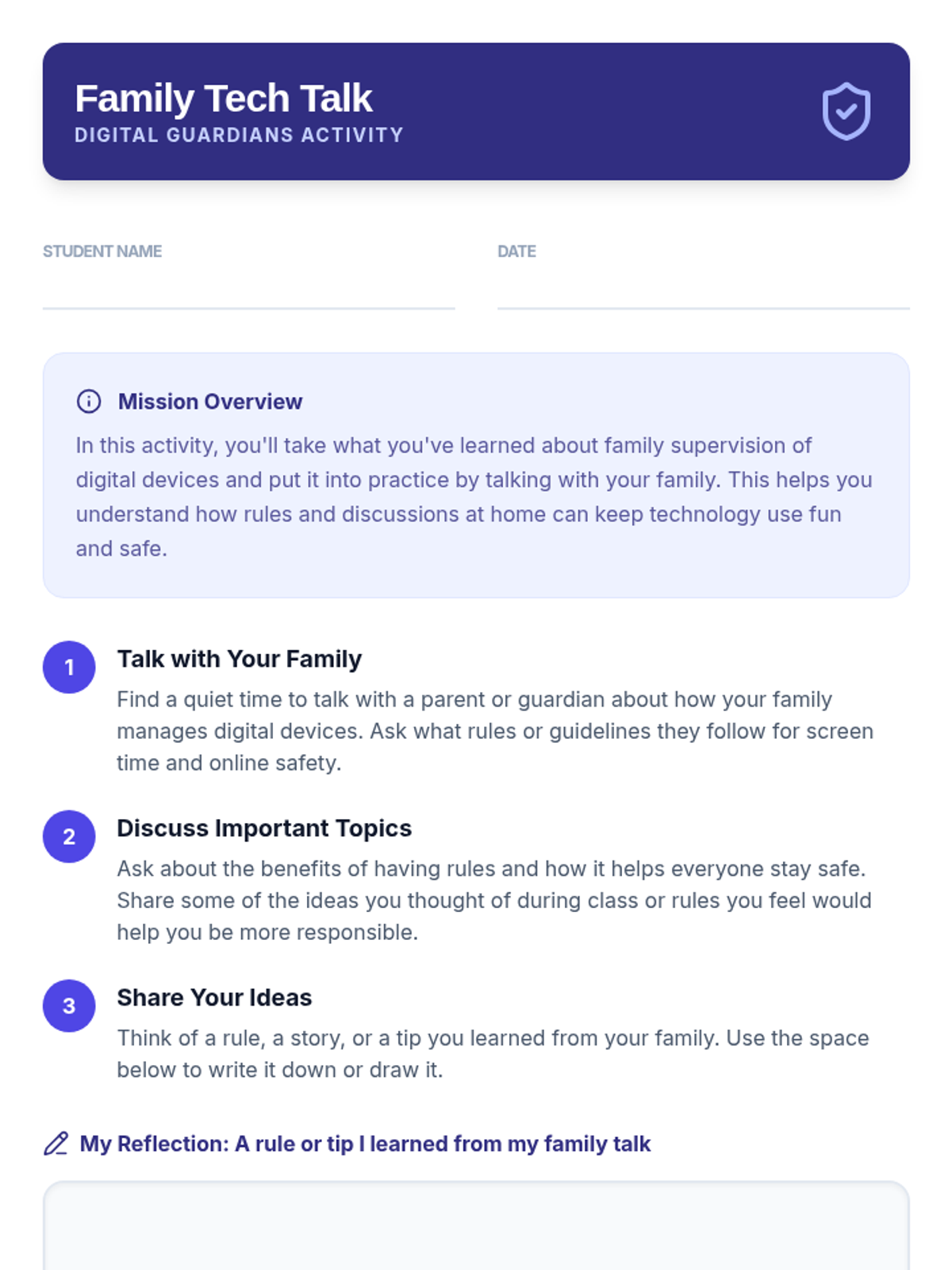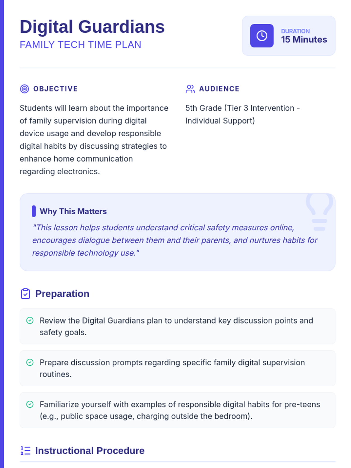 A 15-minute Tier 3 intervention for 5th graders focusing on the role of family supervision in digital safety and fostering healthy communication about tech use at home.