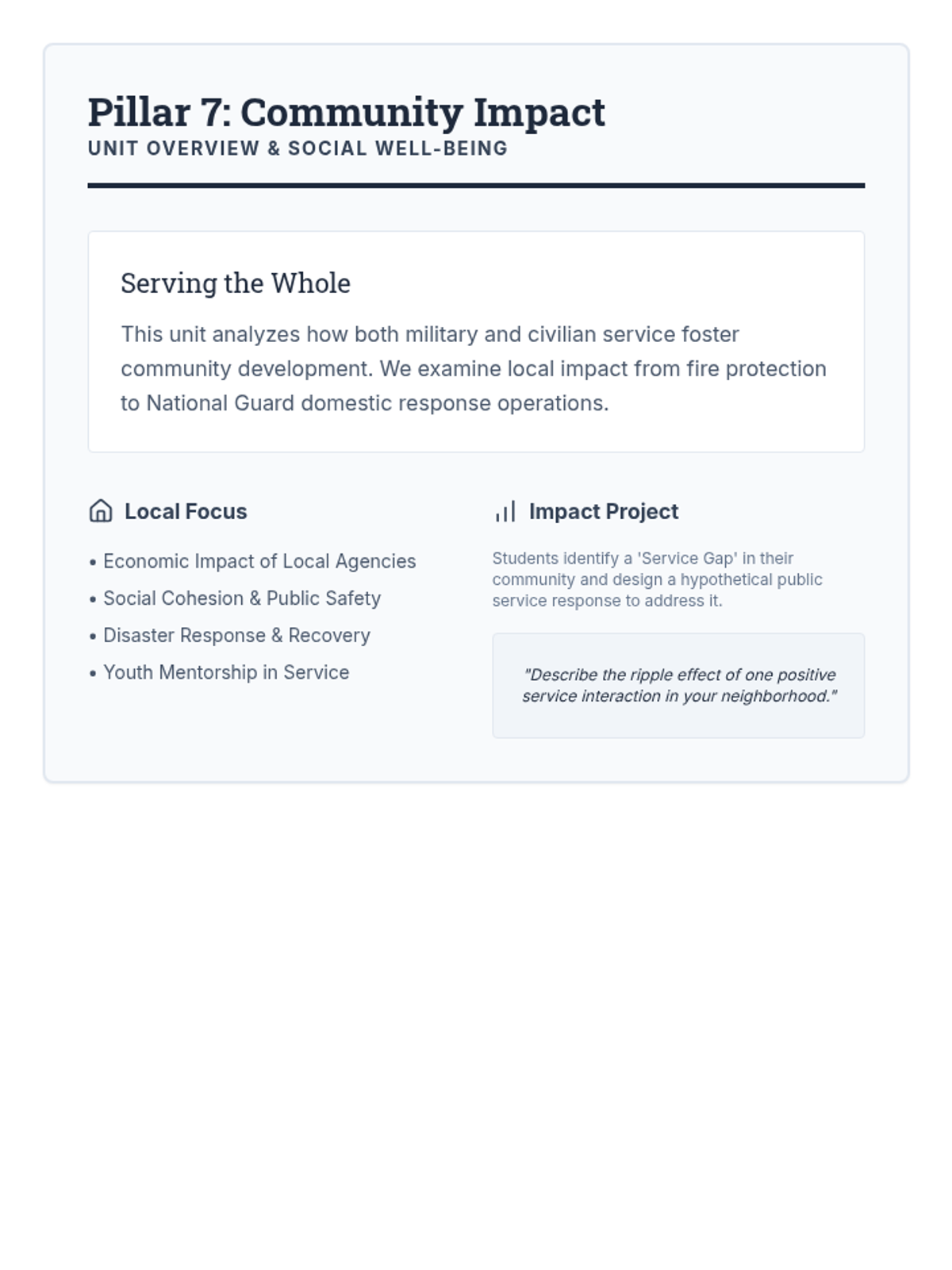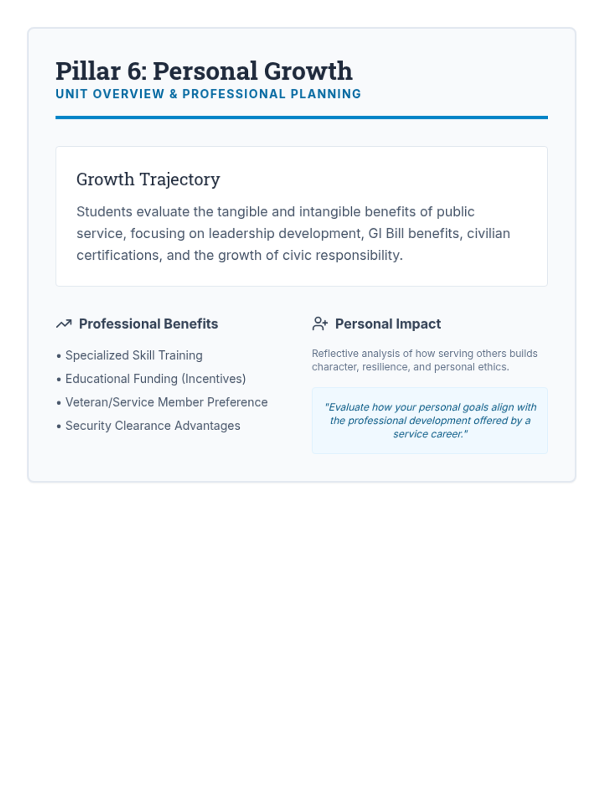 Examine the personal and professional growth resulting from service careers, including civic responsibility and professional advancement.
