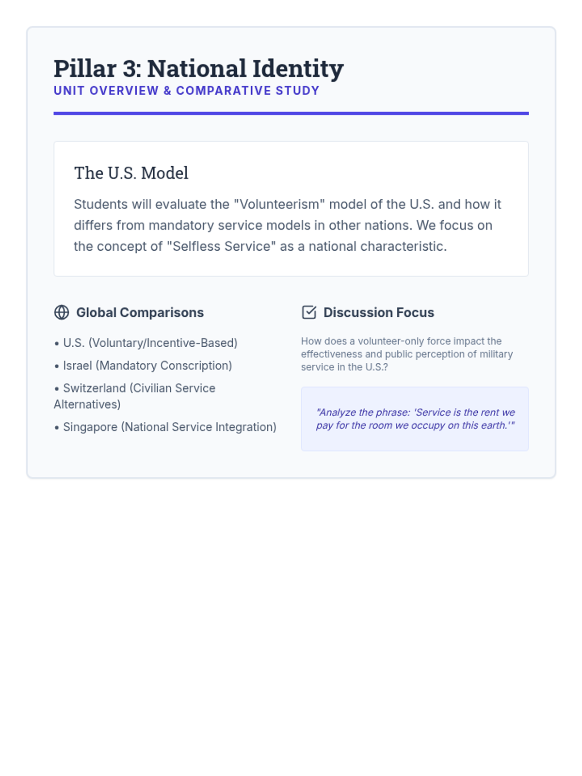 Evaluate how public service shapes U.S. national identity and compare the U.S. volunteerism model with international public service structures.