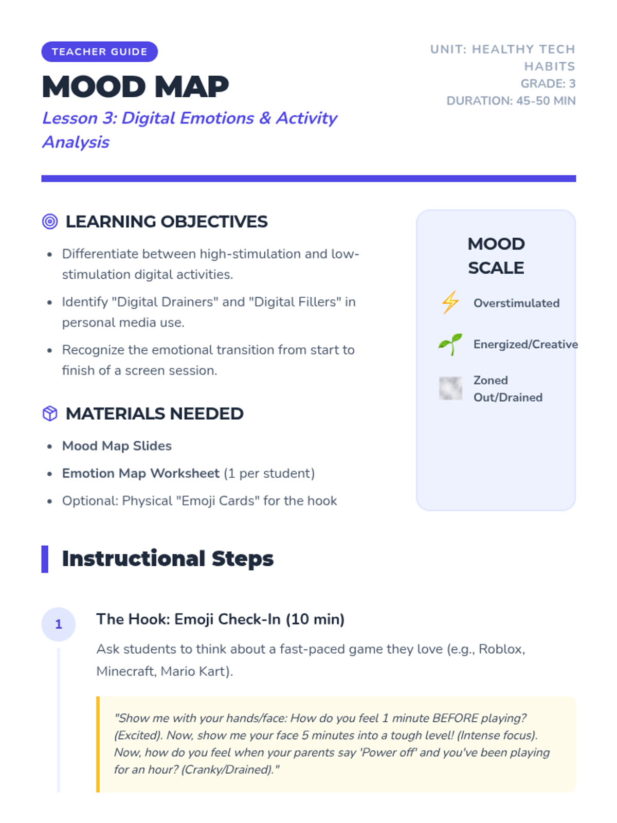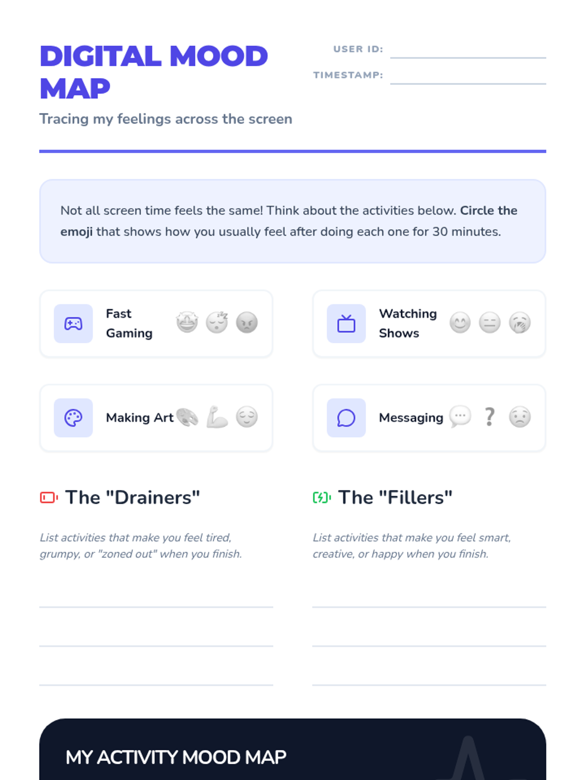 Students map different digital activities (gaming, watching videos, chatting) to emotions. They identify which activities make them feel energized and which leave them feeling drained or angry.