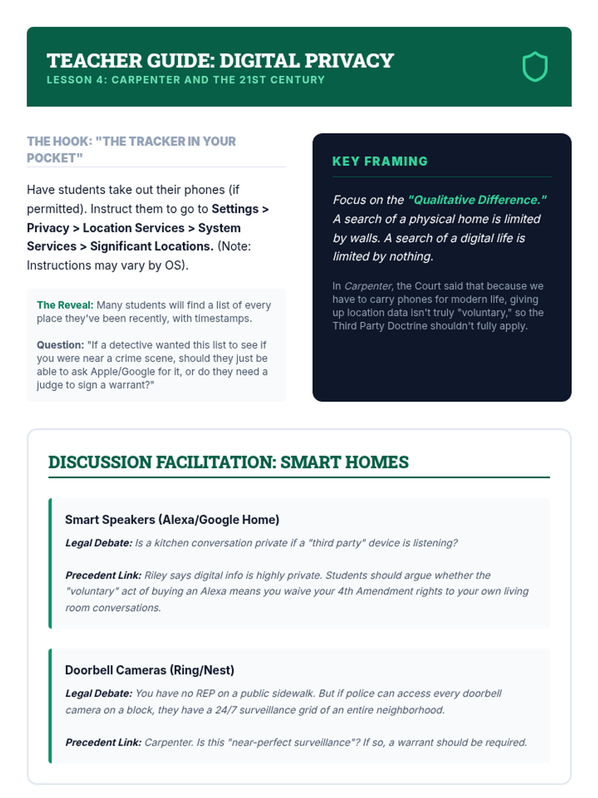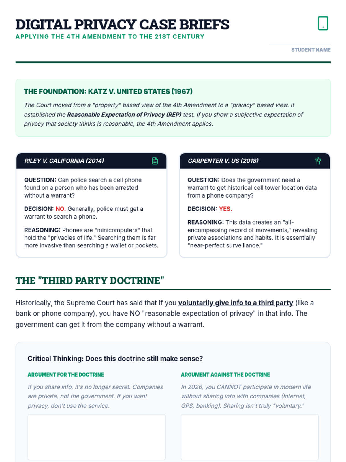 Examines the evolution of privacy rights in the digital age, focusing on Carpenter v. United States and the Fourth Amendment's application to cell phone data.