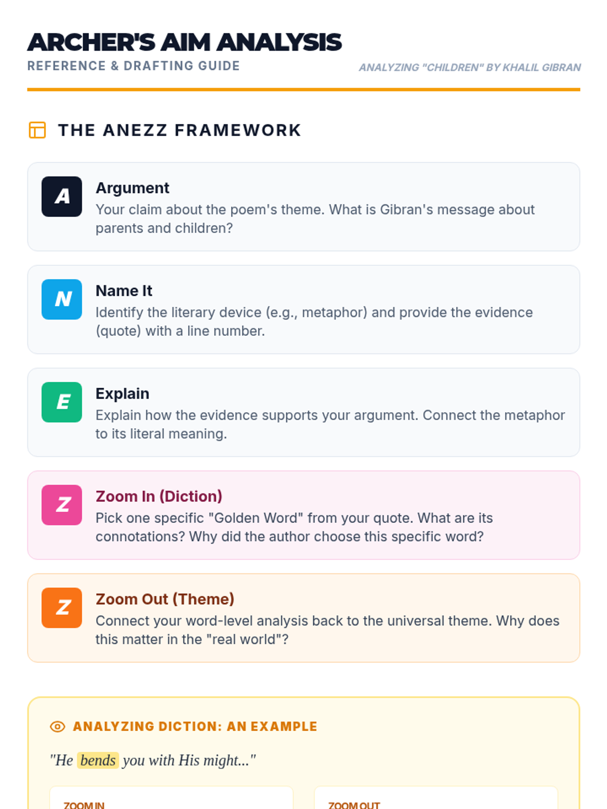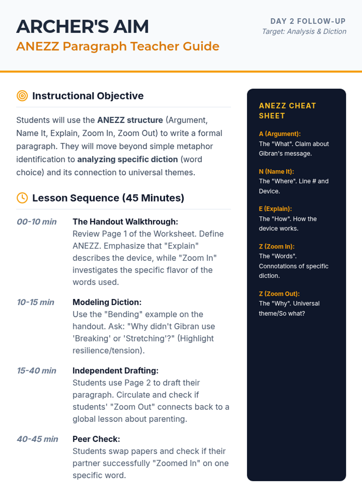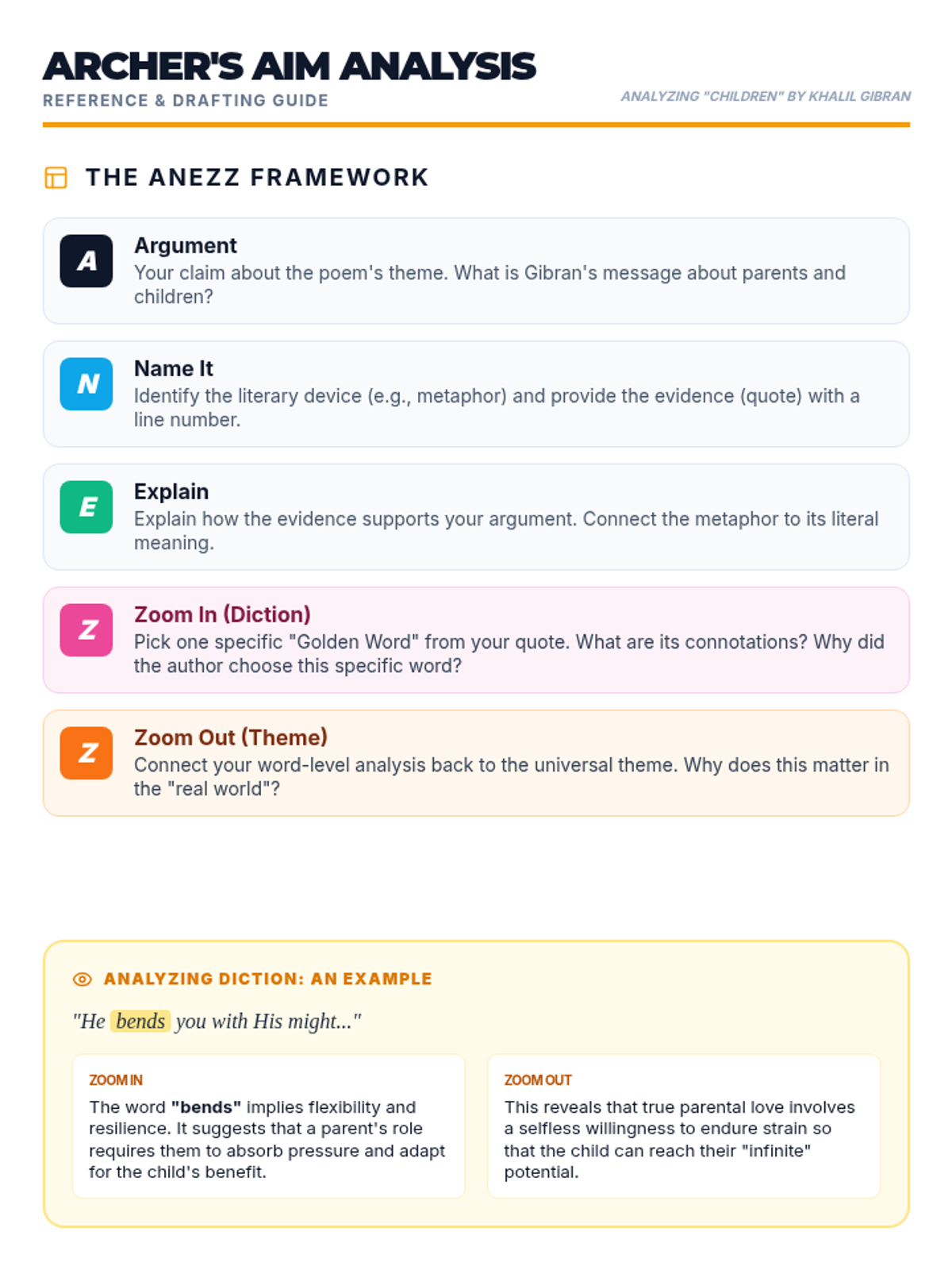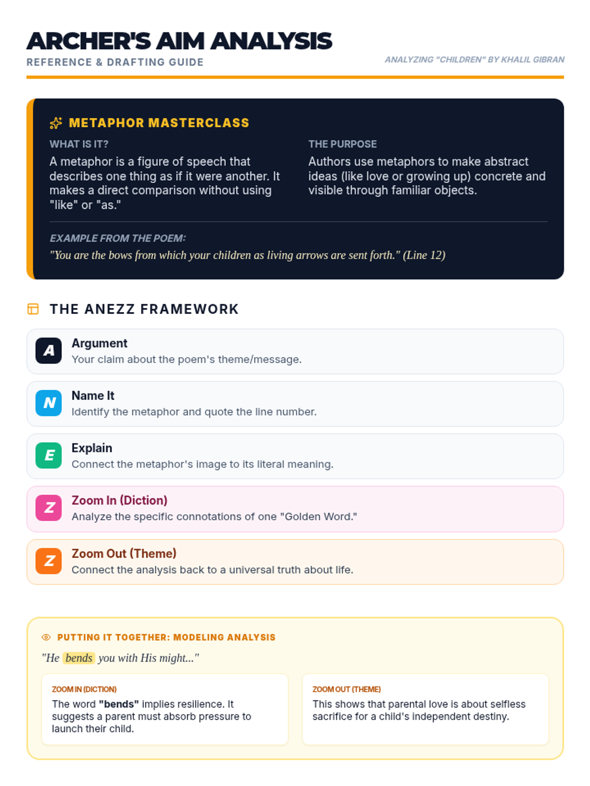 A follow-up lesson focused on mastering literary analysis through the ANEZZ paragraph structure, using Khalil Gibran's 'Children' to explore figurative language and theme.